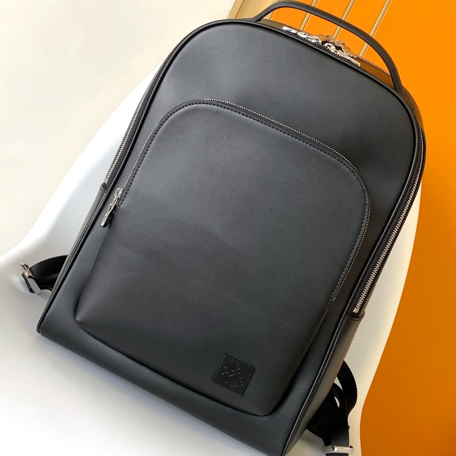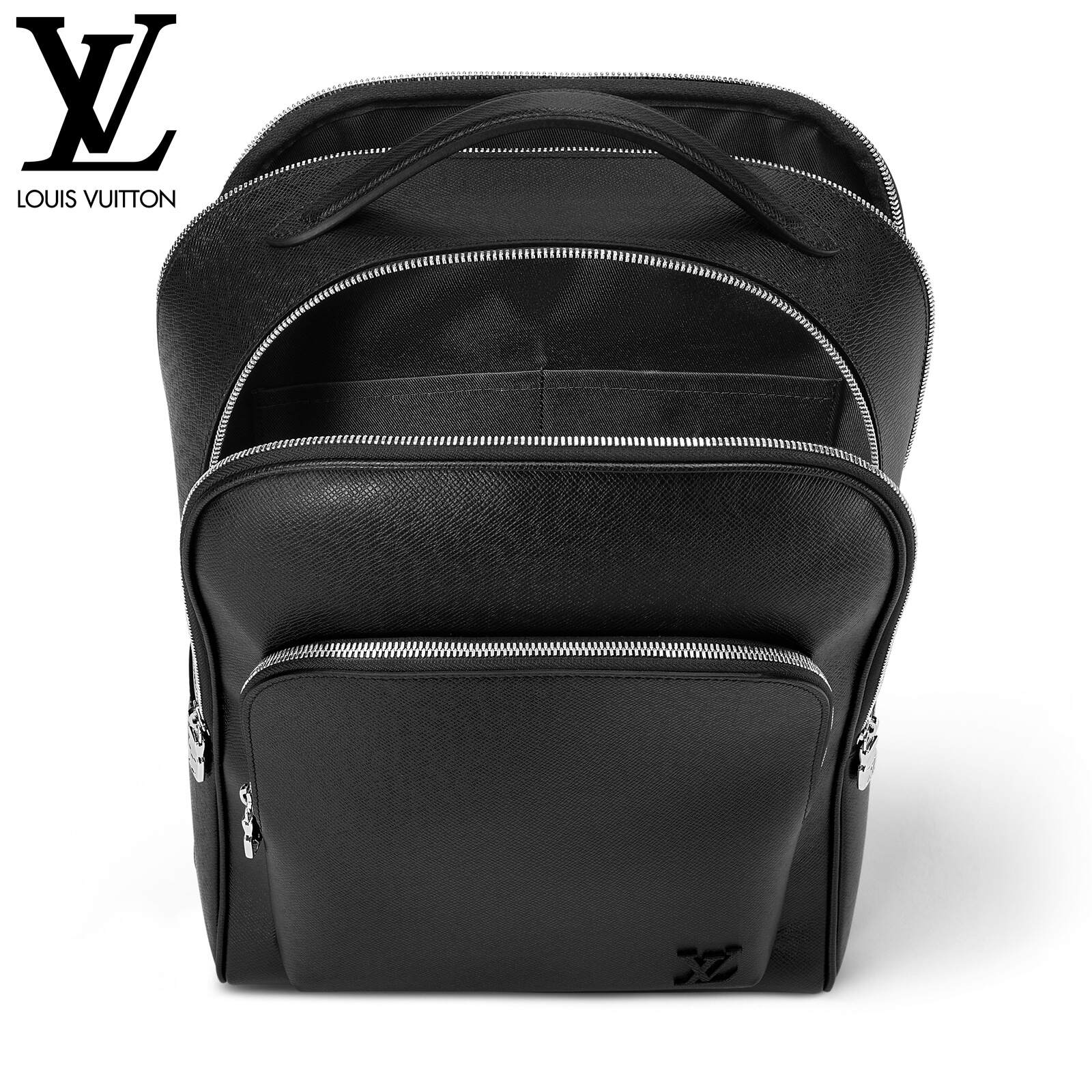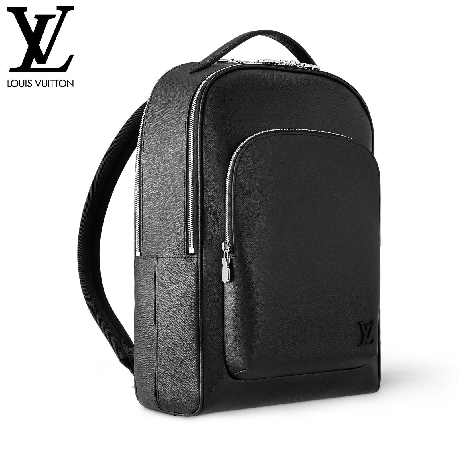 ブラックのタイガ・レザーに同系色のカウハイドレザーのトリミングを施し、シルバーカラーのメタルパーツをあしらって、機能的かつエレガントに仕立てた「アヴェニュー・バックパック」。大容量のフロントポケットに加え、パッド入りのバックコンパートメントとメインコンパートメントを備えています。中身を整理しやすいよう、内側には2つのポケットを配しました。