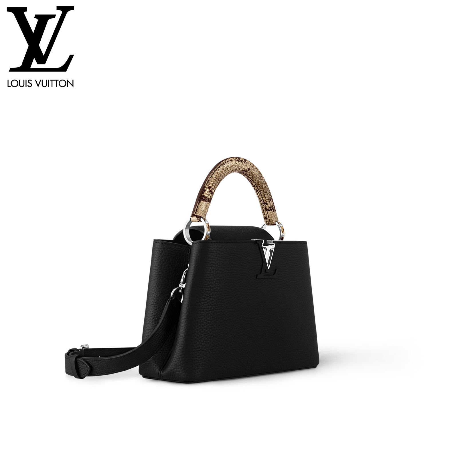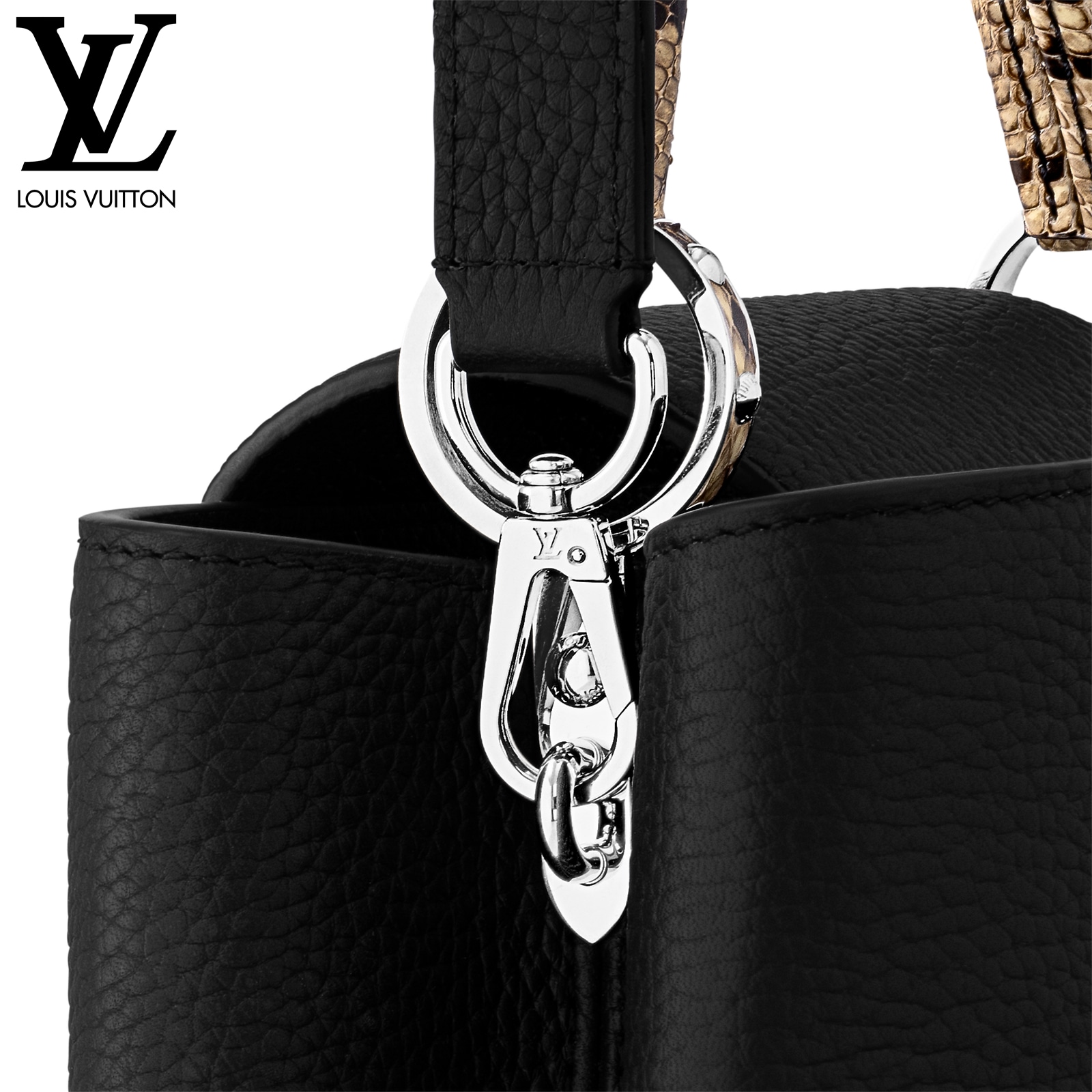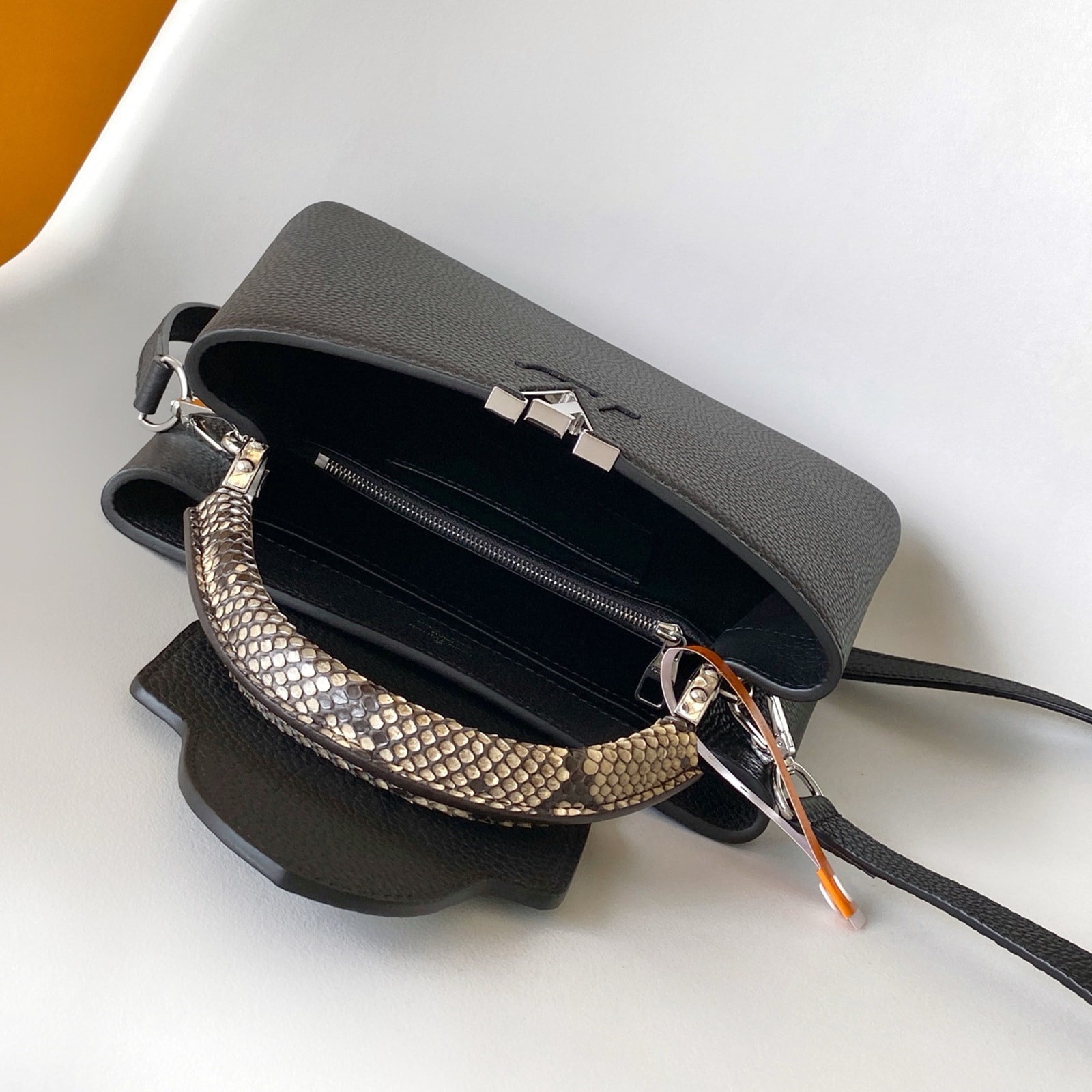 27 x 17.3 x 9 cm (幅 x 高さ x マチ) カラー:ブラック 素材:トリヨンレザー(皮革の種類:牛革) トリミング:トリヨンレザー(皮革の種類:牛革)、パイソン(皮革の種類:ヘビ革) ライニング:レザー(皮革の種類:牛革) 金具(色:シルバー) 2通りの装いを楽しめるフラップ開閉式 ファスナー式ポケットとフラットポケット付きの内側コンパートメント 底ビス ストラップ:取り外し可能, 調整可能 ストラップの頂点からバッグ上部までの長さ(最短):46.5 cm ストラップの頂点からバッグ上部までの長さ(最長):55.0 cm ハンドル:シングル