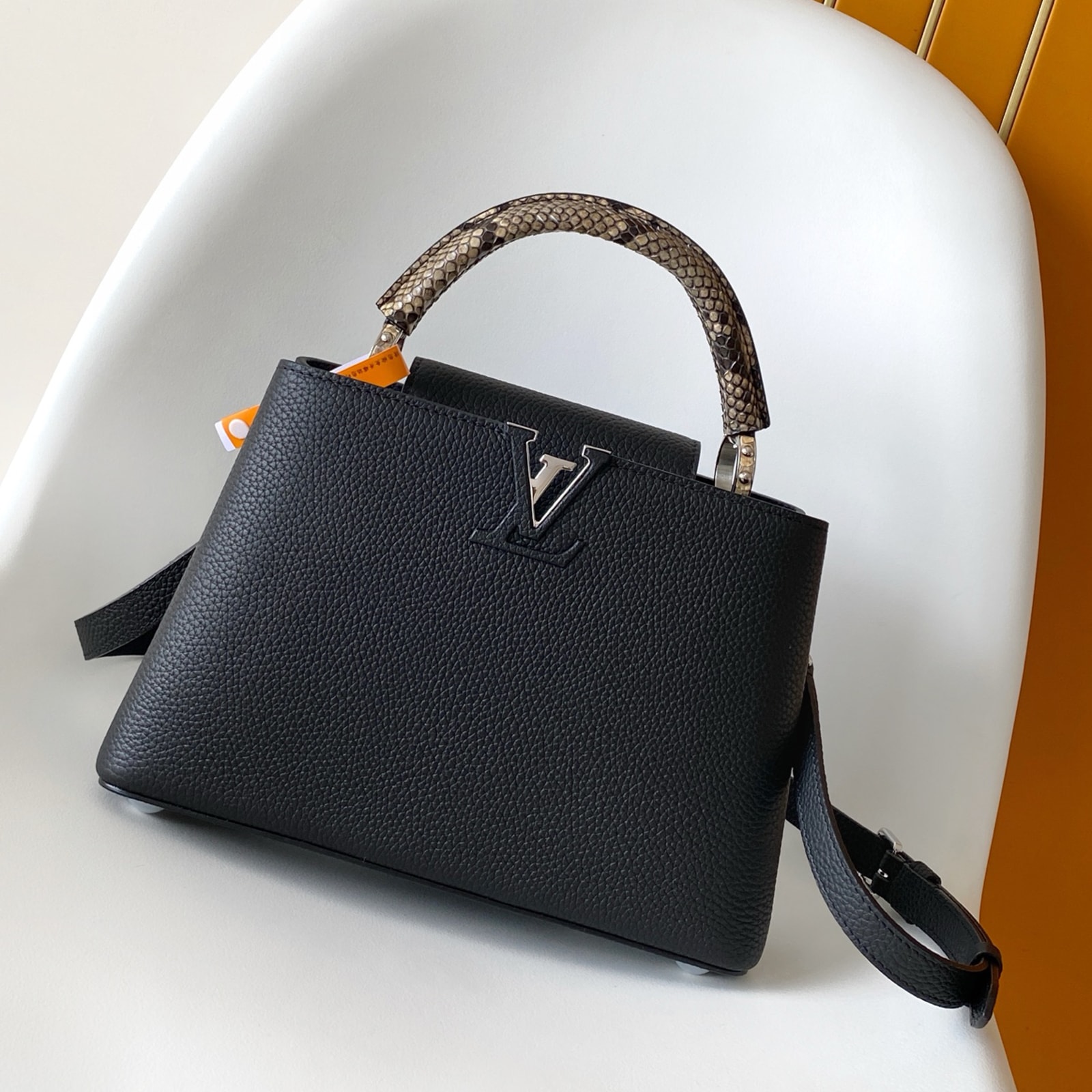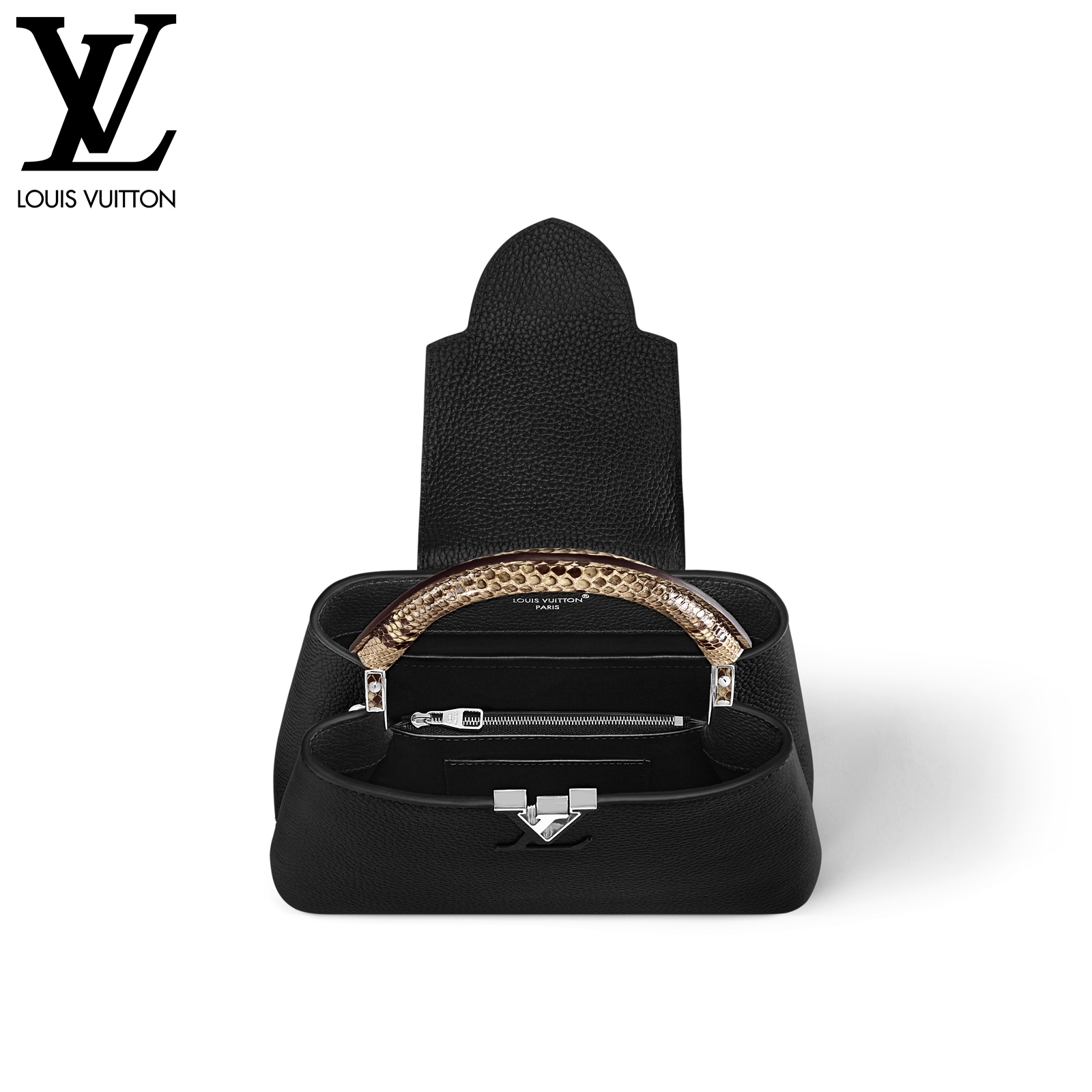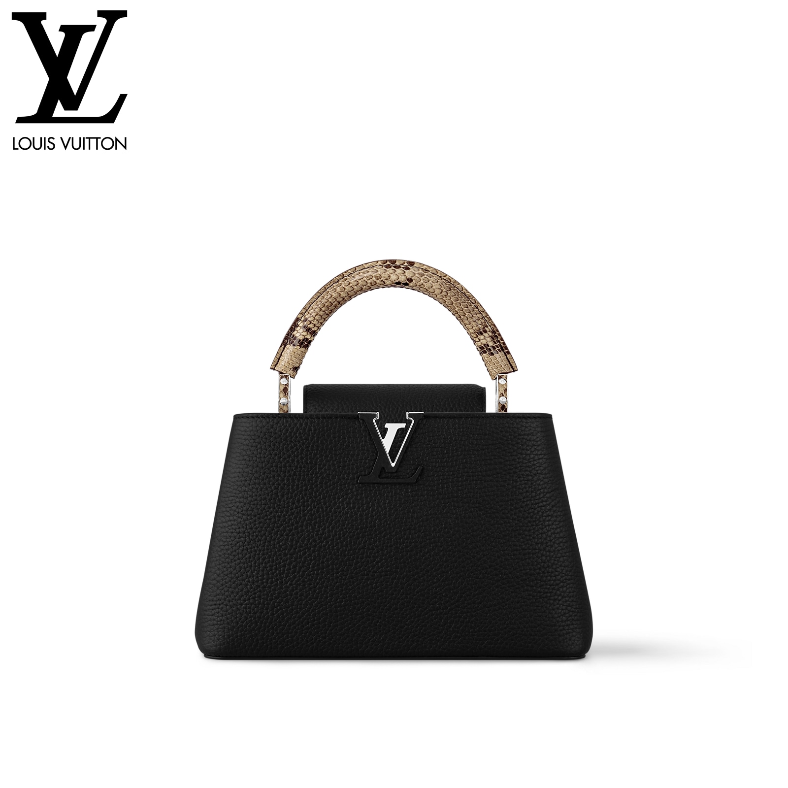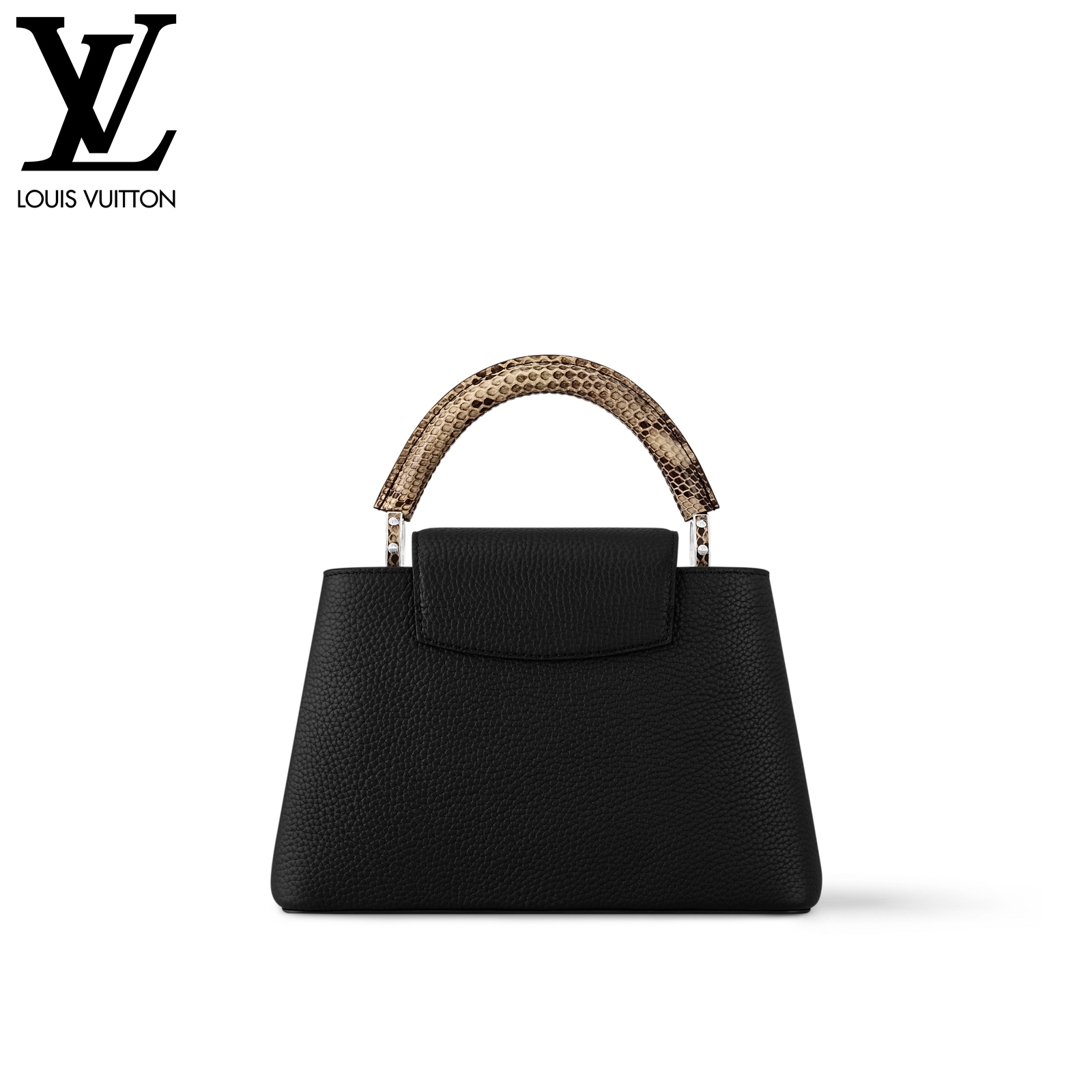 27 x 17.3 x 9 cm (幅 x 高さ x マチ) カラー:ブラック 素材:トリヨンレザー(皮革の種類:牛革) トリミング:トリヨンレザー(皮革の種類:牛革)、パイソン(皮革の種類:ヘビ革) ライニング:レザー(皮革の種類:牛革) 金具(色:シルバー) 2通りの装いを楽しめるフラップ開閉式 ファスナー式ポケットとフラットポケット付きの内側コンパートメント 底ビス ストラップ:取り外し可能, 調整可能 ストラップの頂点からバッグ上部までの長さ(最短):46.5 cm ストラップの頂点からバッグ上部までの長さ(最長):55.0 cm ハンドル:シングル