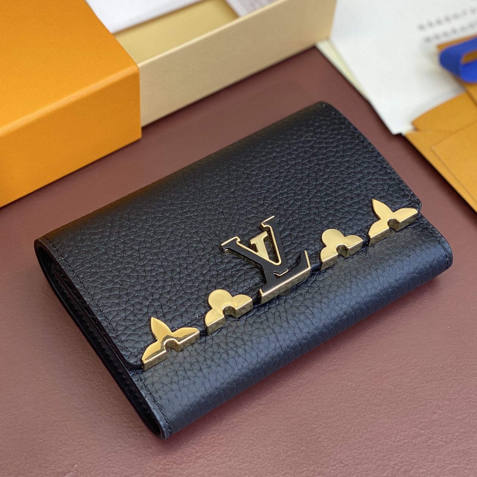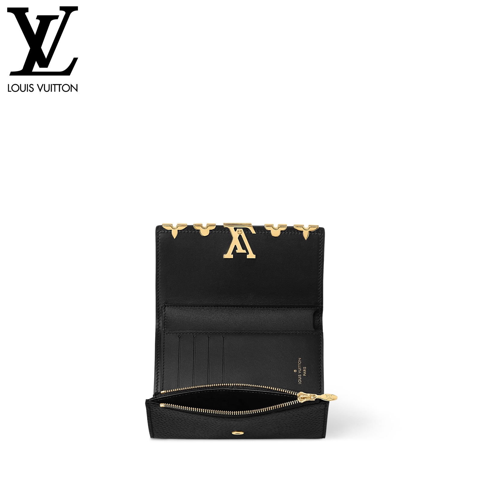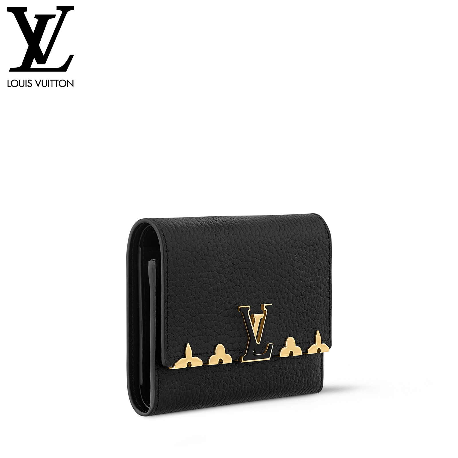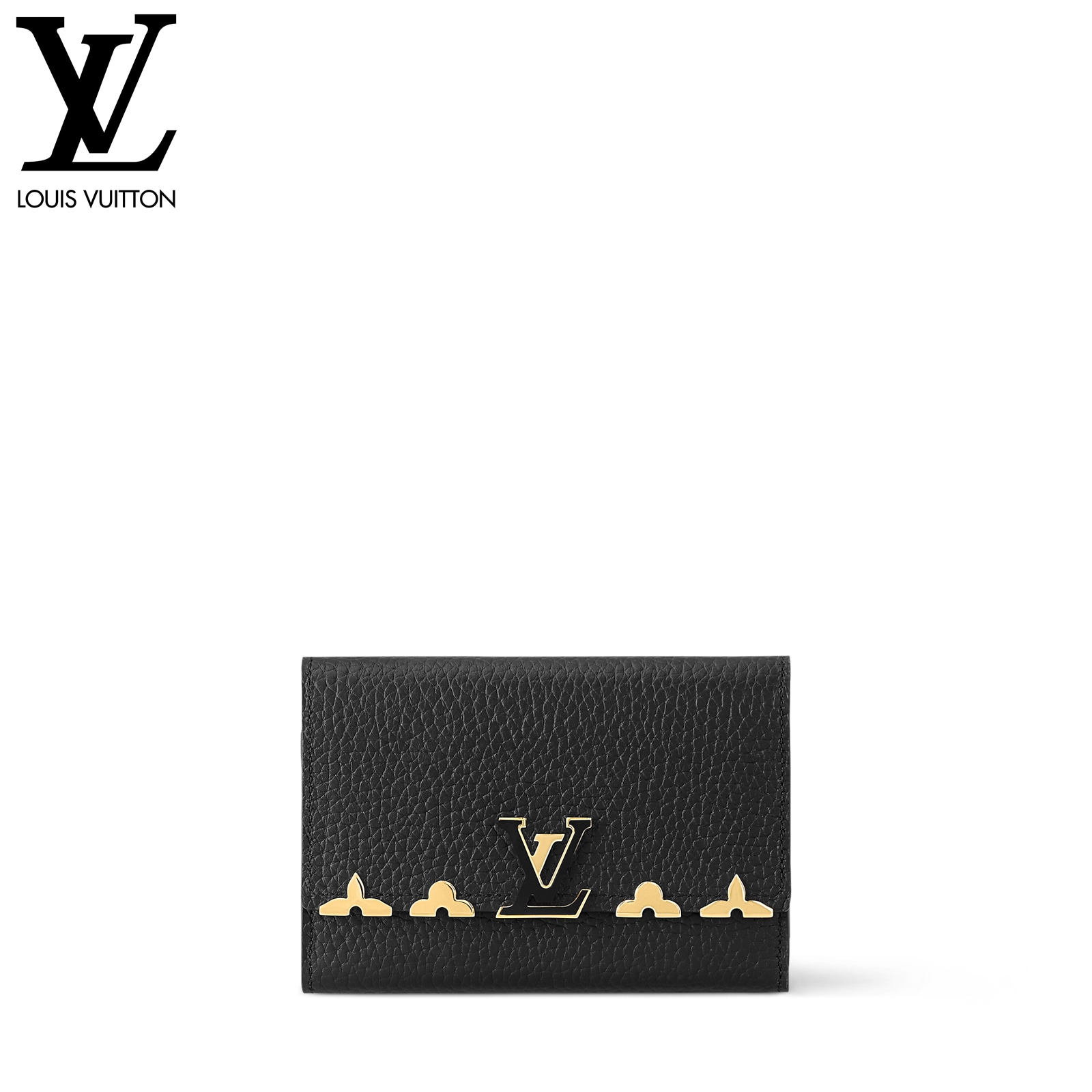スタイルと実用性を併せ持つ「ポルトフォイユ・カプシーヌ コンパクト」。フルグレインのしなやかなトリヨンレザーで仕立てた小ぶりの財布は、8つのカードスロット、ファスナー付きコインケース、紙幣のためのポケット、2つのフラットポケットを備えています。中の物を安全に守るLV イニシャルのスナップボタンタイプの留め具も魅力です。