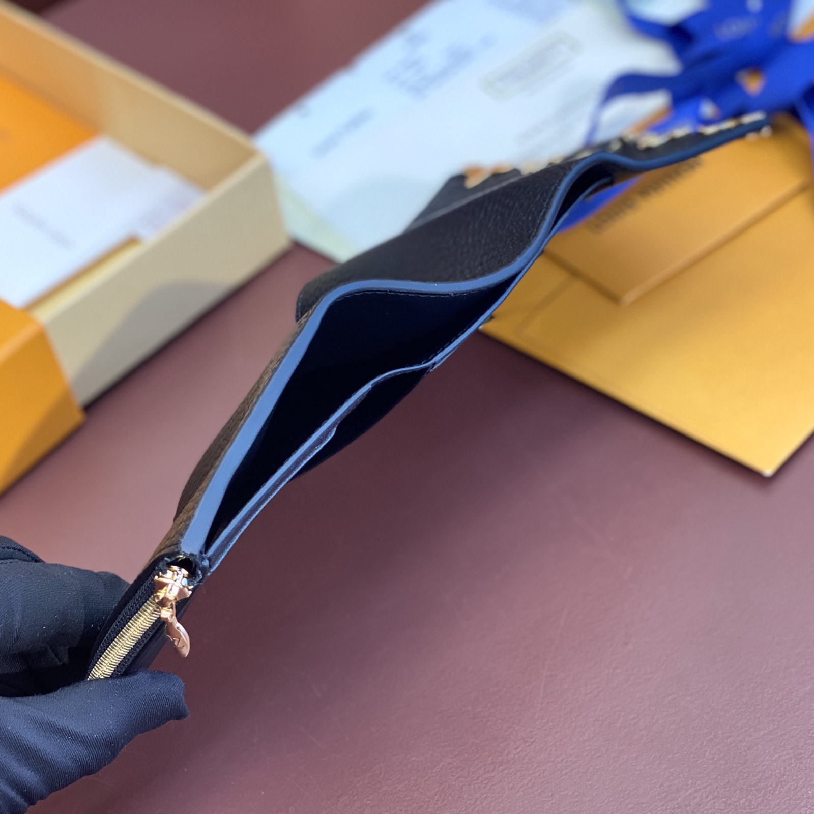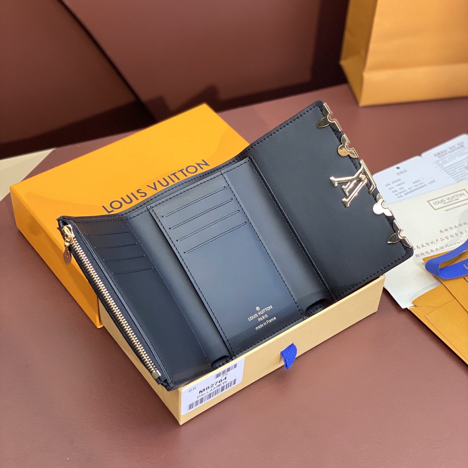 13.5 x 9.5 x 3 cm(幅 x 高さ x マチ)素材:トリヨンレザー(皮革の種類:牛革)ライニング:レザー(皮革の種類:牛革)金具(色:ゴールド)カード用ポケットx8ファスナー式コインポケット紙幣用ポケットフラットポケットx2LV スナップボタン開閉式