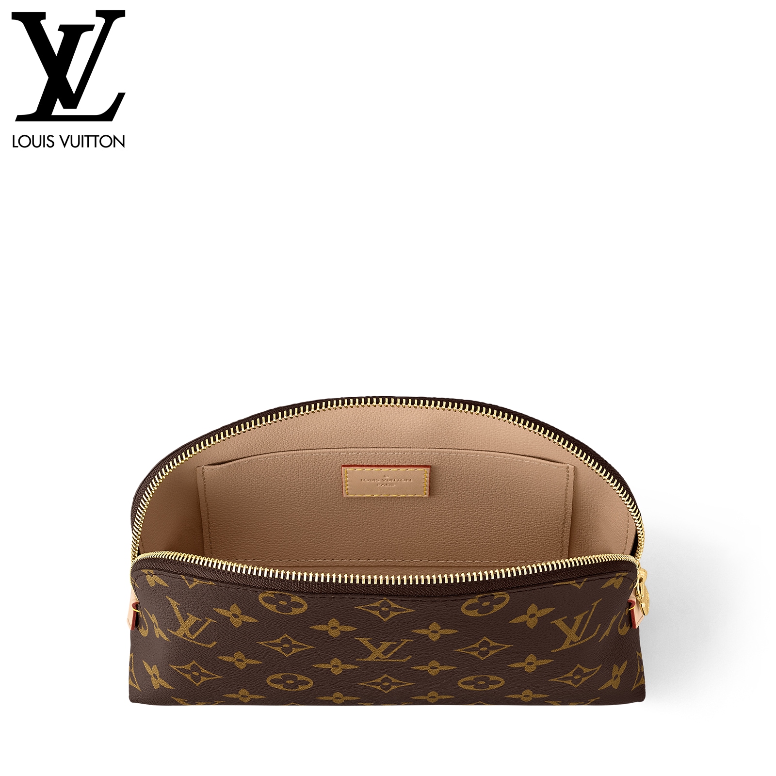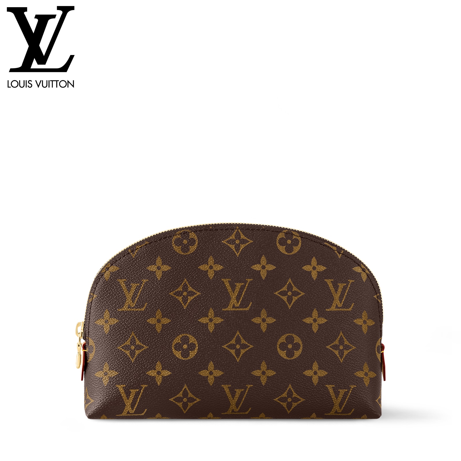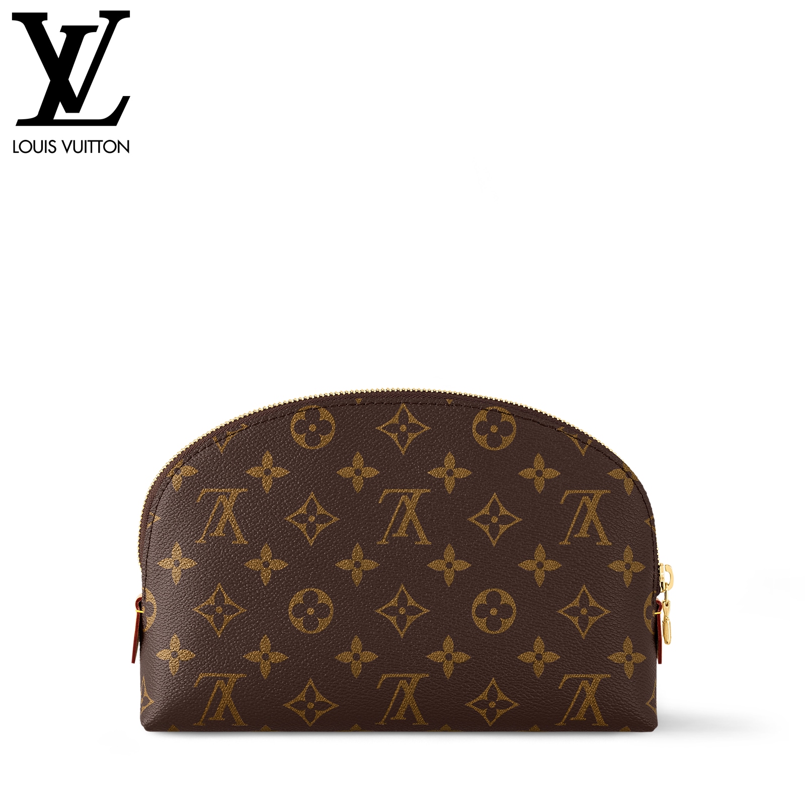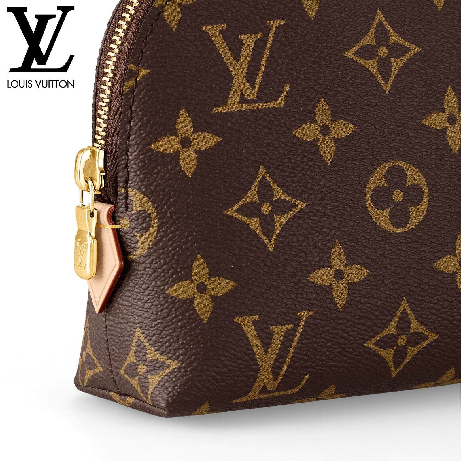 スタイリッシュなモノグラム・キャンバスで仕立てたラグジュアリーな「ポシェット・コスメティック MM」。光沢感のあるゴールドカラーのメタルパーツのディテールとテキスタイルのライニングが、エレガントな雰囲気を完成させます。