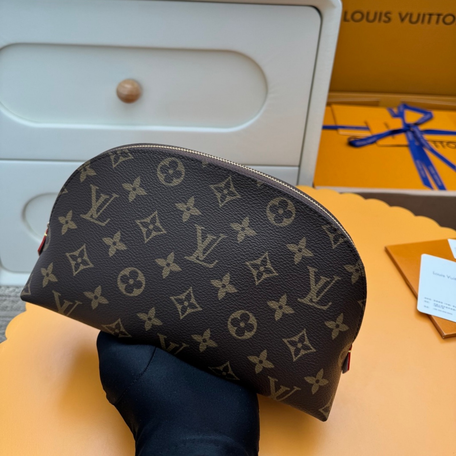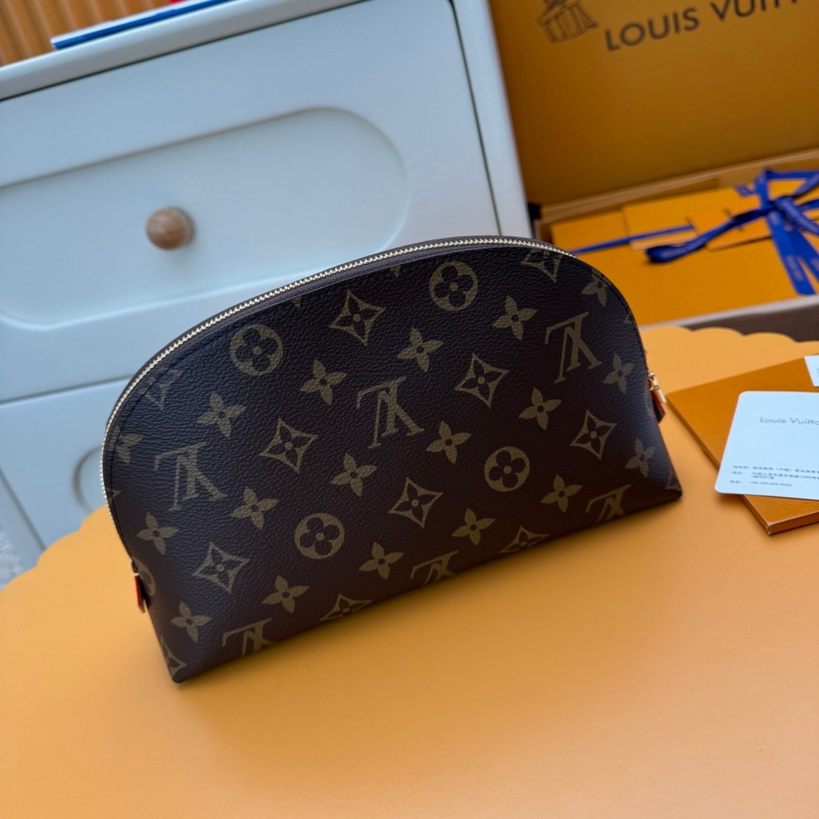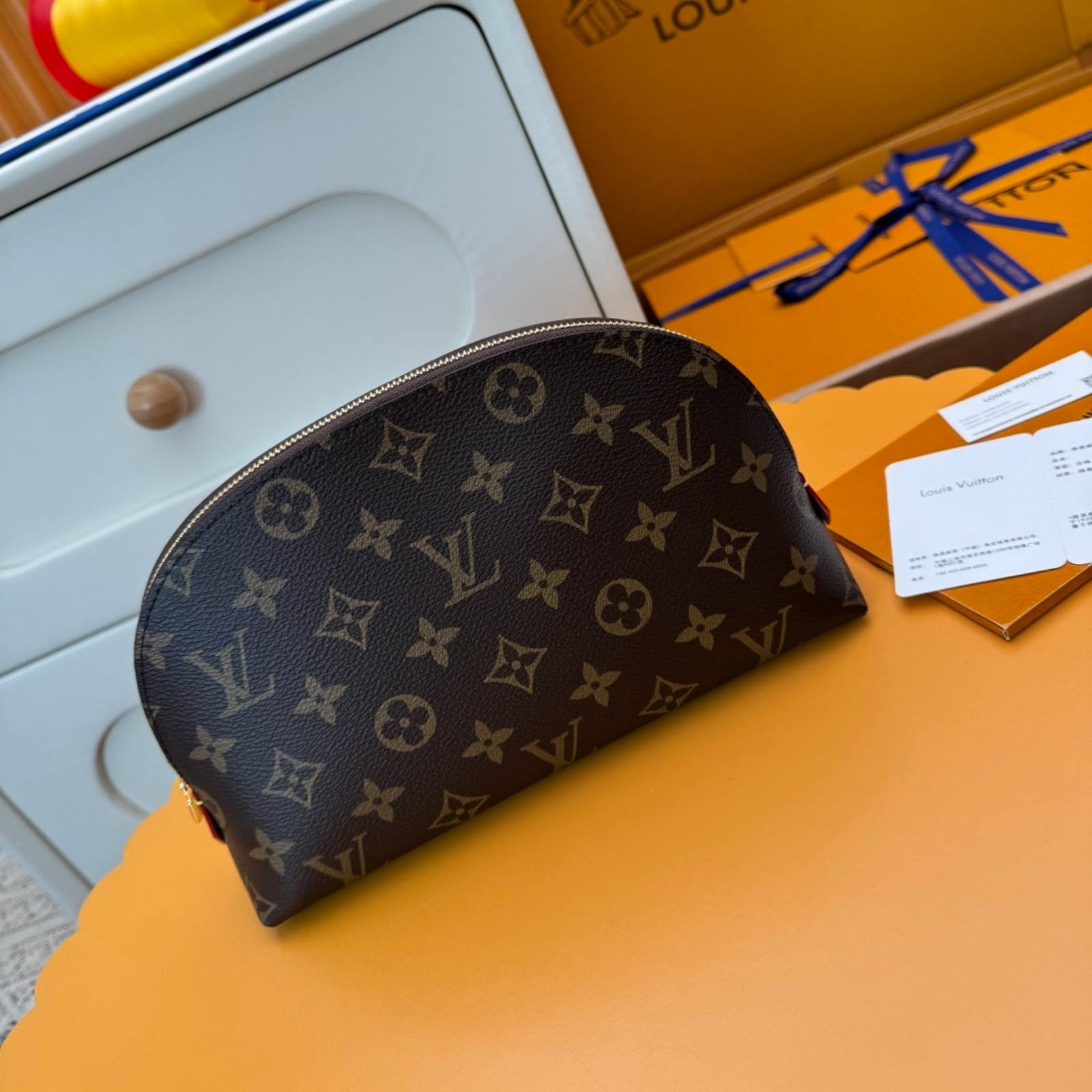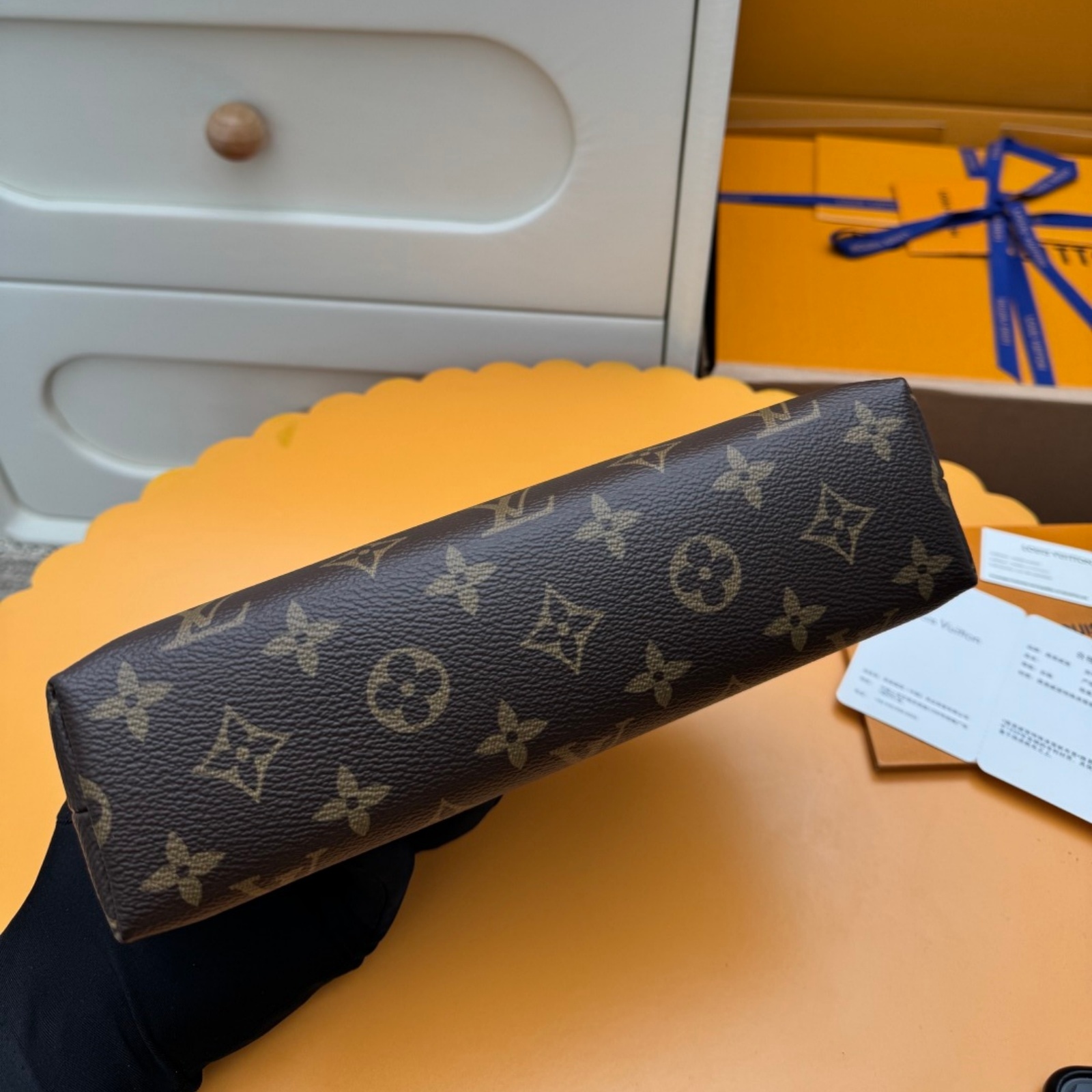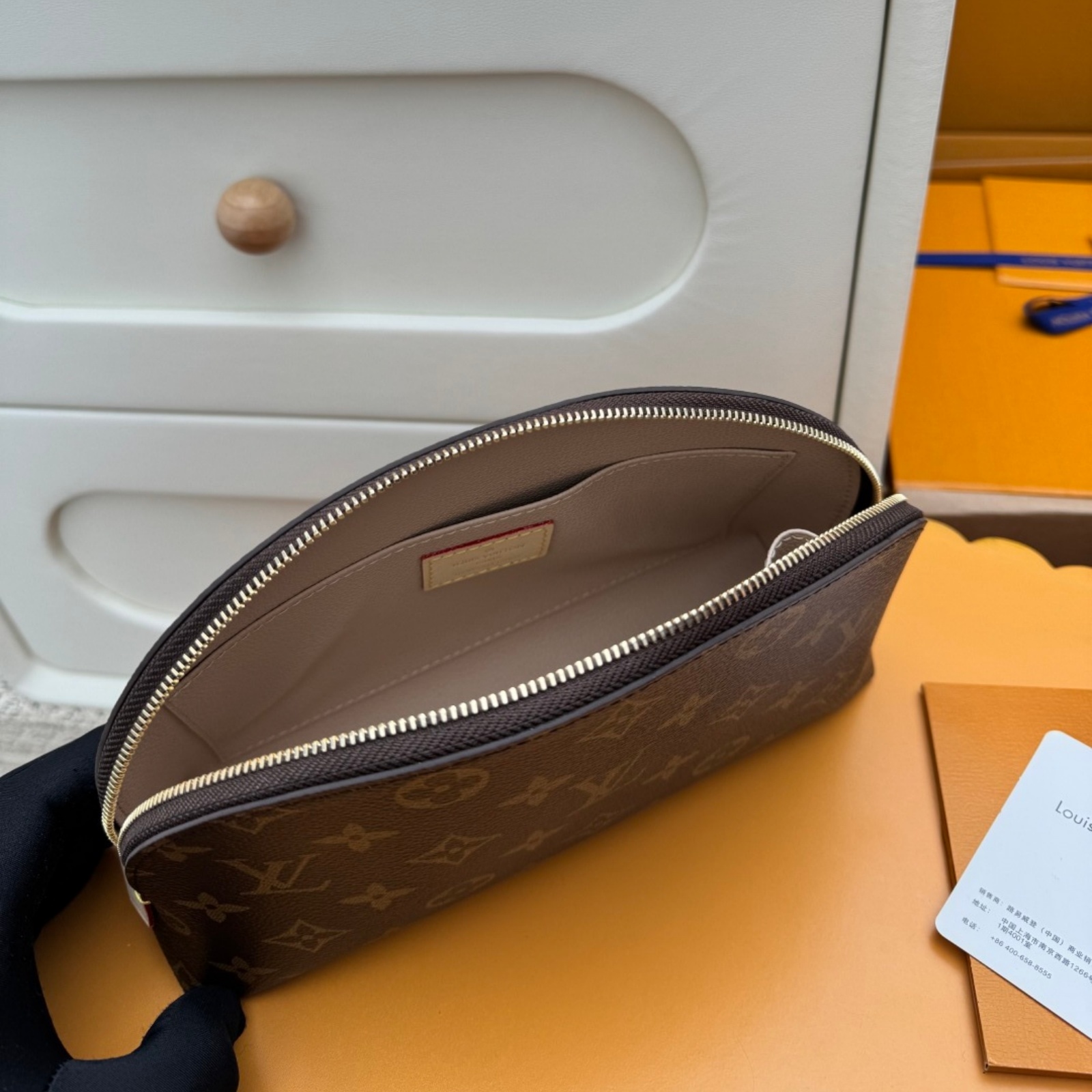 スタイリッシュなモノグラム・キャンバスで仕立てたラグジュアリーな「ポシェット・コスメティック MM」。光沢感のあるゴールドカラーのメタルパーツのディテールとテキスタイルのライニングが、エレガントな雰囲気を完成させます。