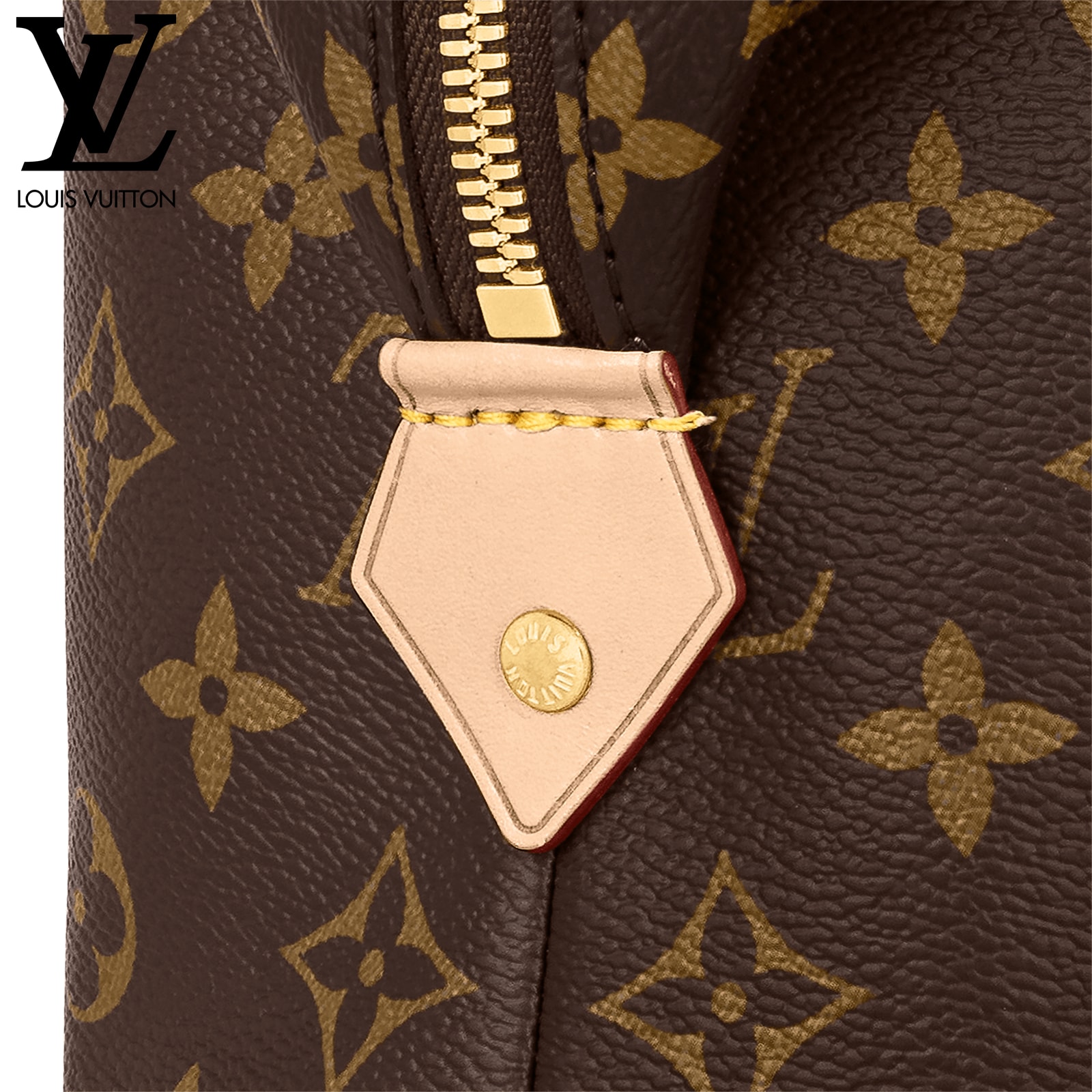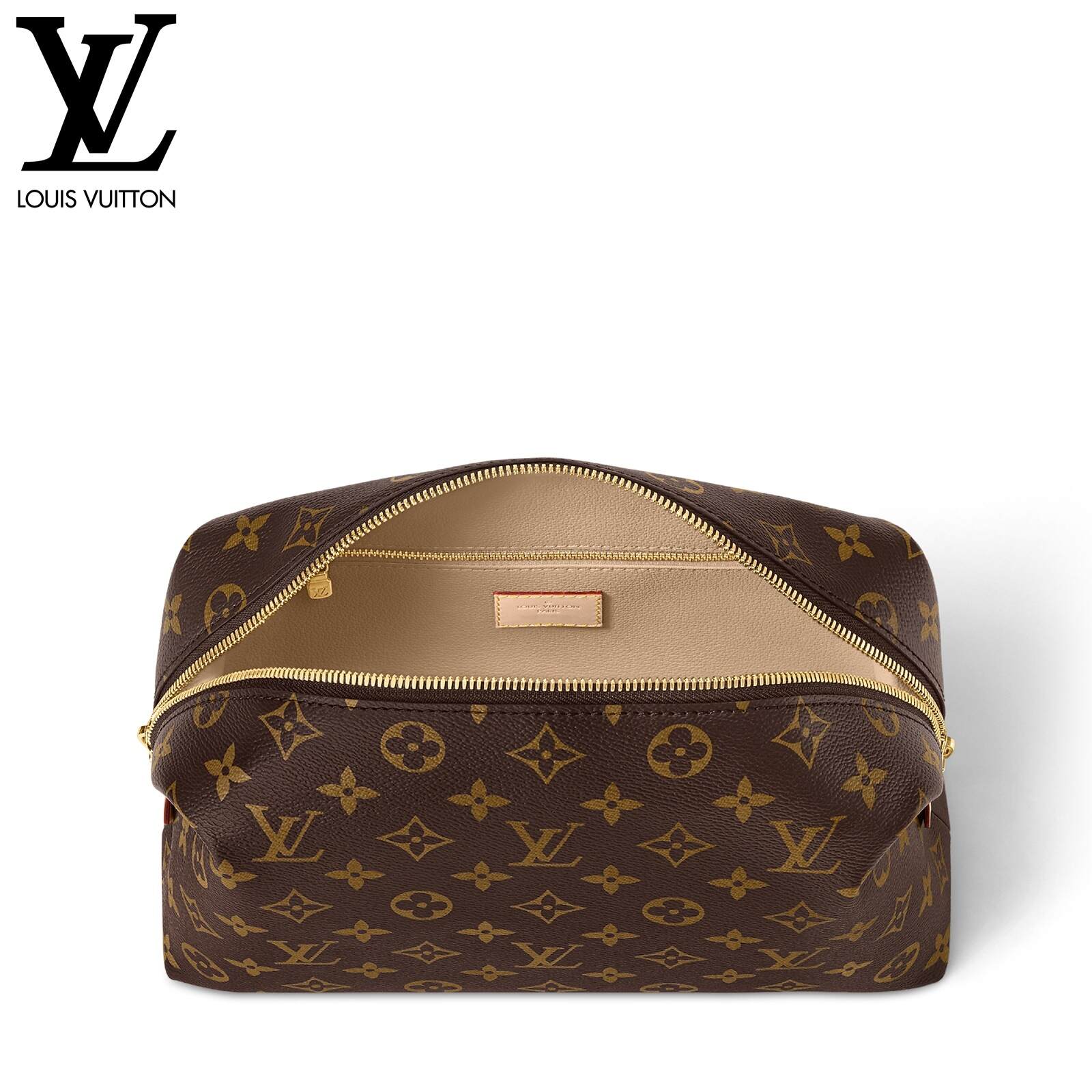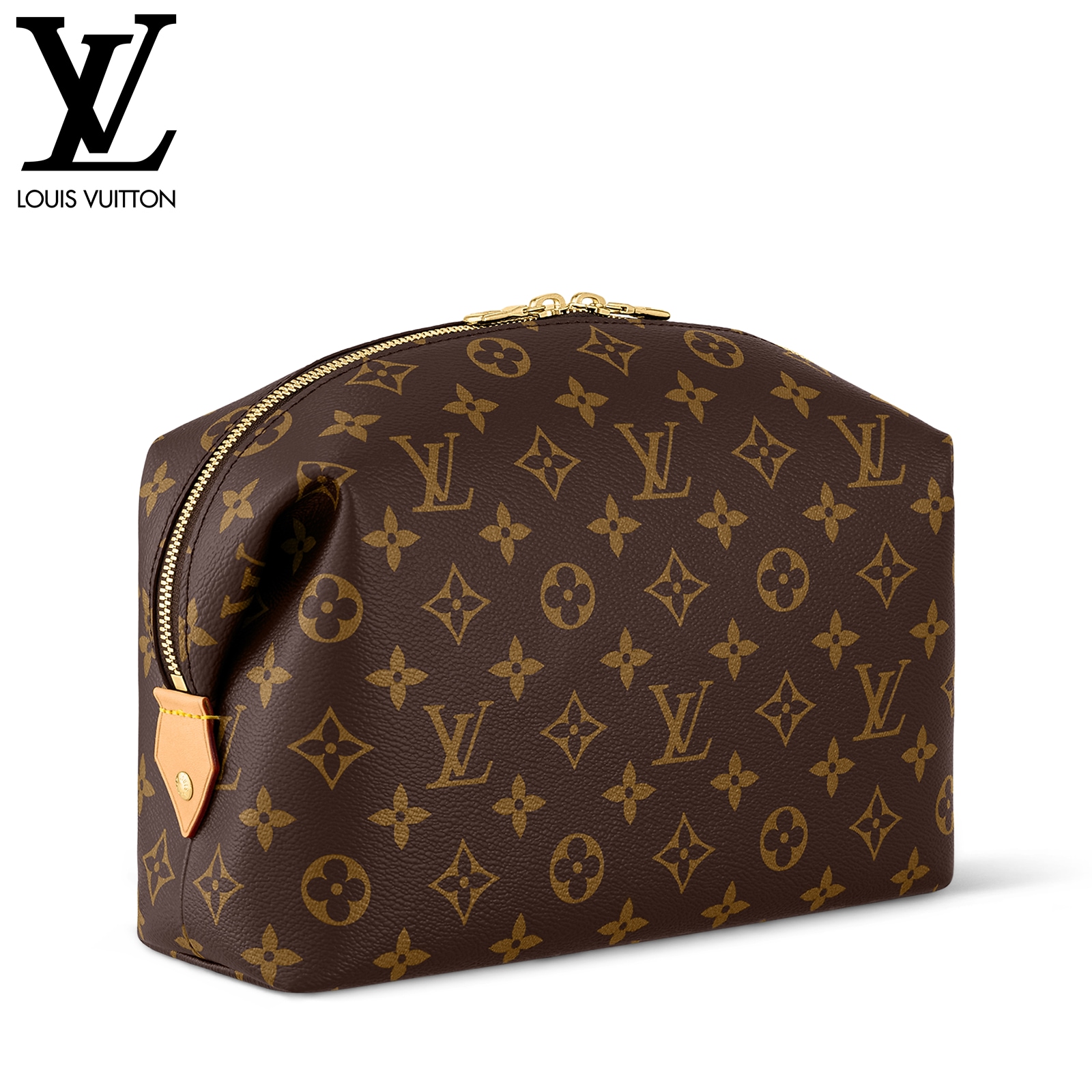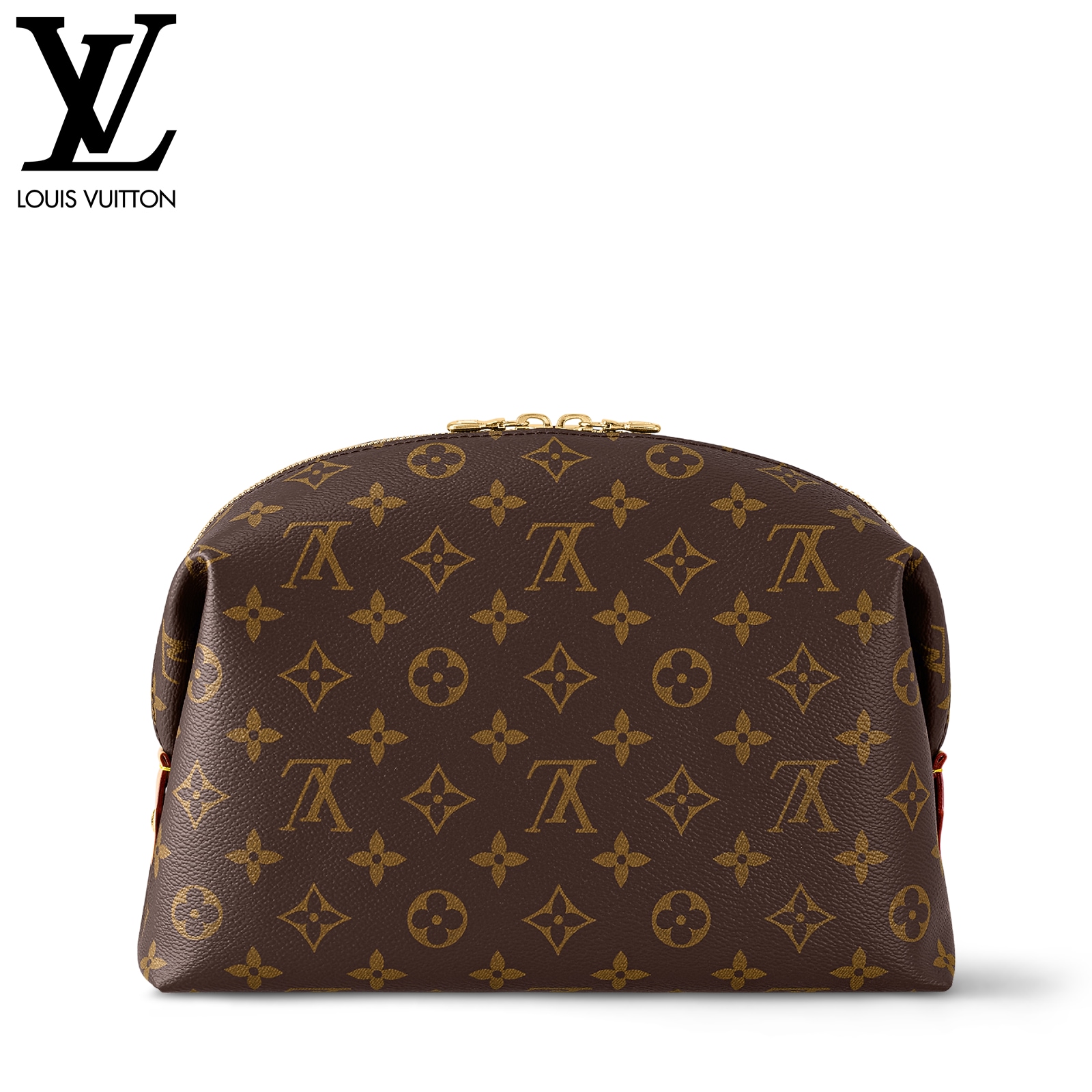 タイムレスなモノグラム・キャンバスで仕立てた「ポシェット・コスメティック GM」。ゴールドカラーのメタルパーツと、汚れても簡単にお手入できるコーティングを施したライニングをあしらいました。内側に配したフラットポケットとファスナー付きポケットで、化粧品をすっきり整理できます。ファスナー開閉式。
