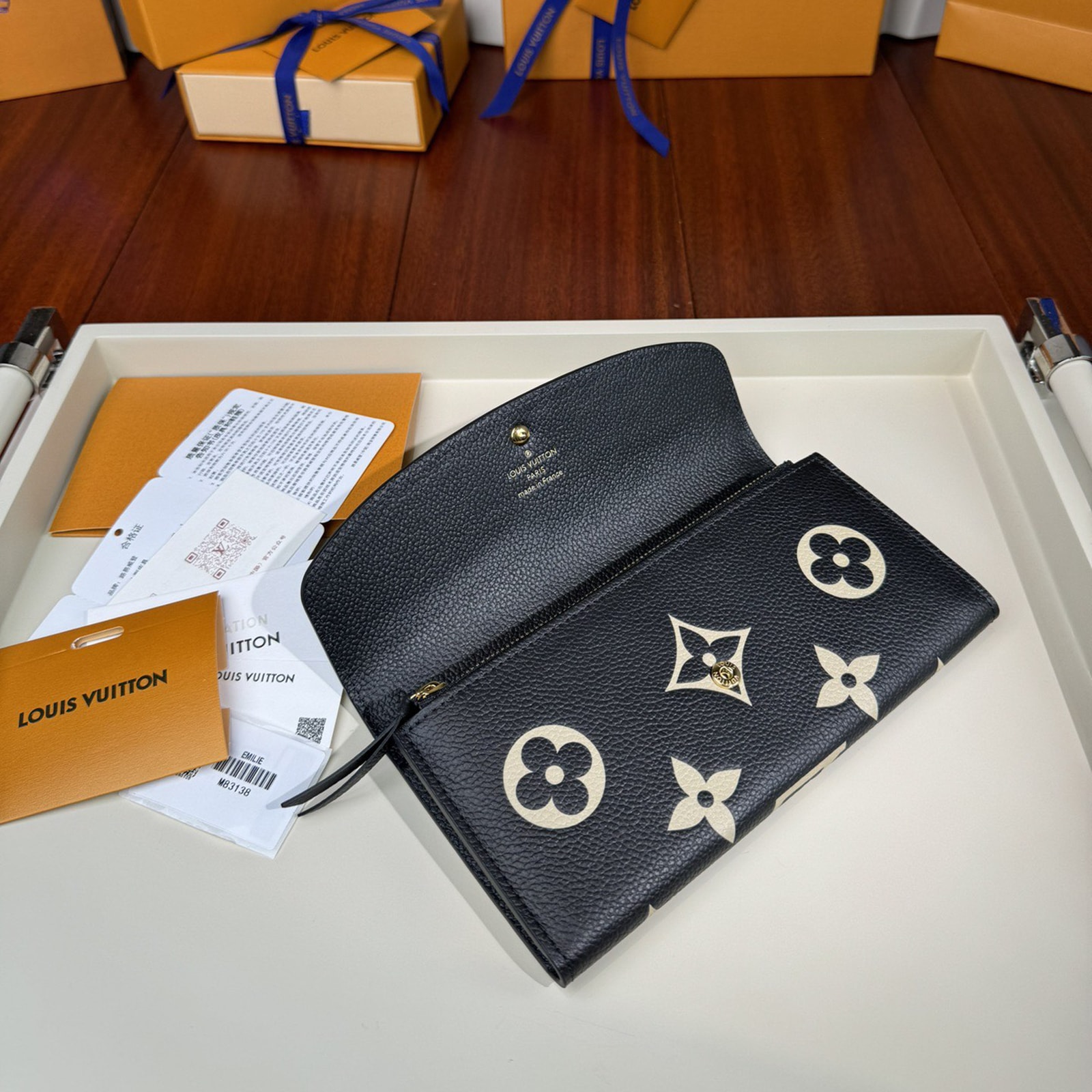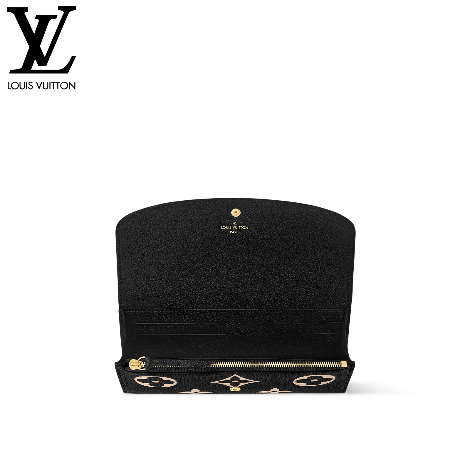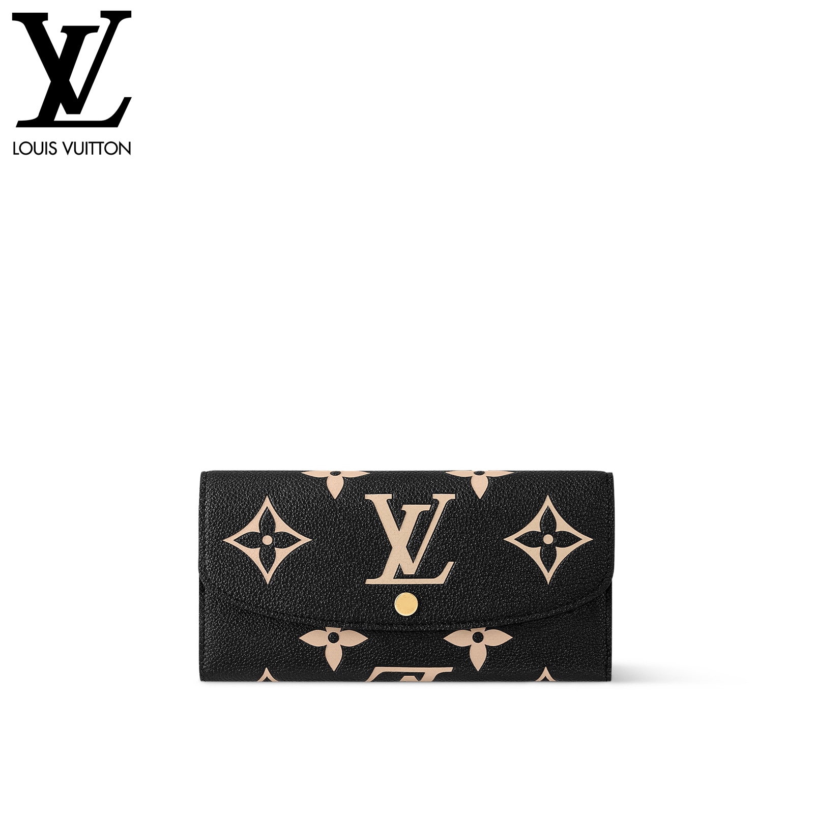 グレイン(しぼ)が美しいモノグラム・アンプラント レザーで仕立てた、スリムでエレガントなデザインの「ポルトフォイユ・エミリー」。財布としてもクラッチとしてもご使用いただけます。ブラックのレザーに目を引くオーバーサイズのクラシカルなモノグラム・パターンをエンボス加工し、さらにベージュでプリント加工を施しました。ファスナー付きコインポケットを備えた収納力も魅力。