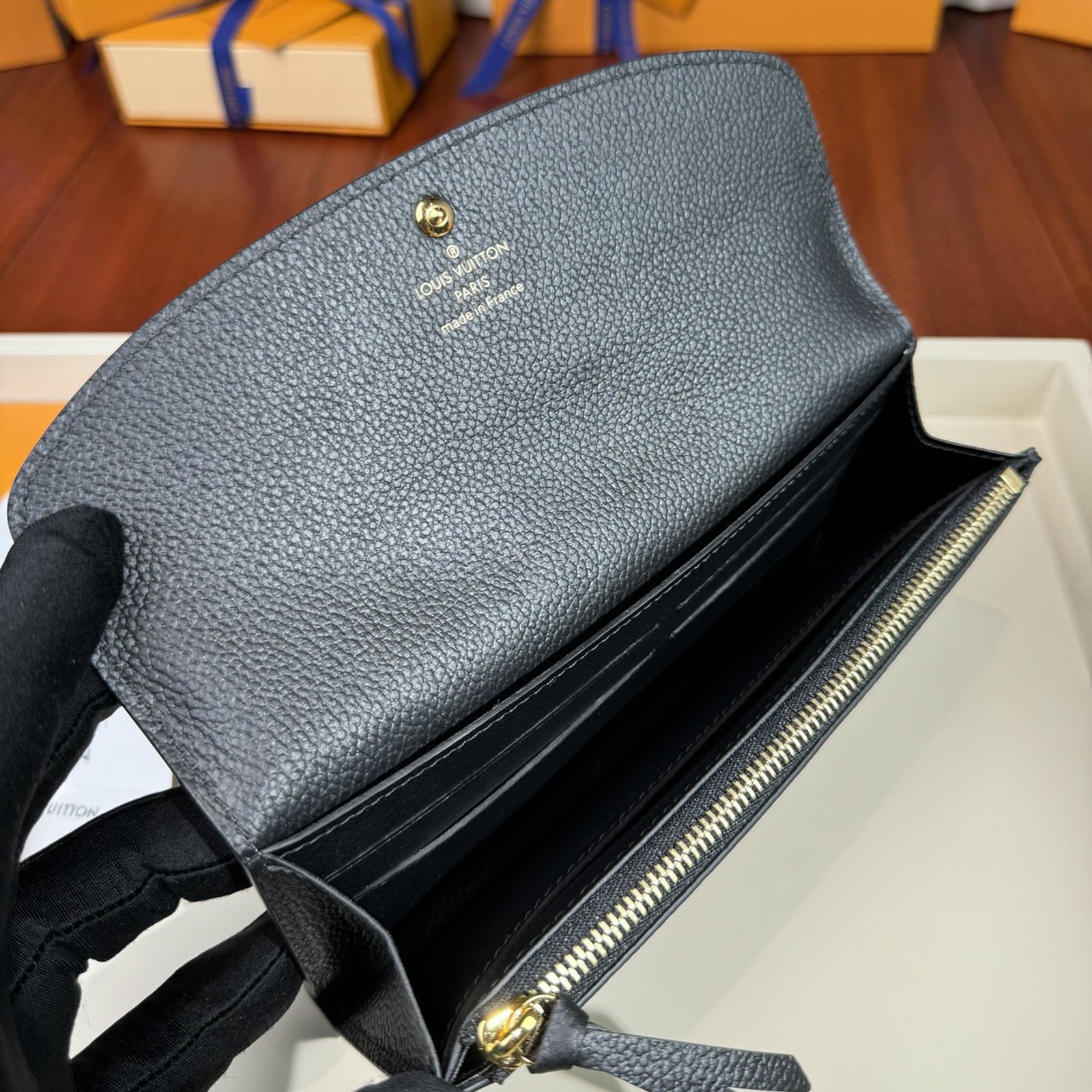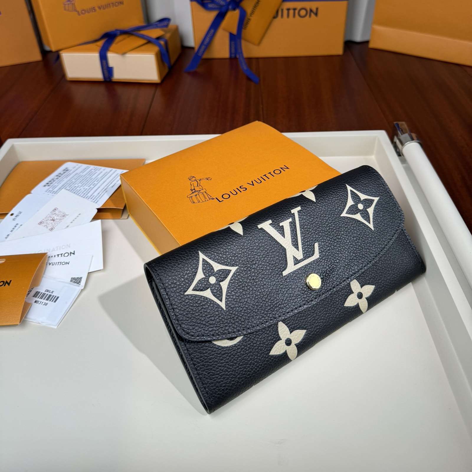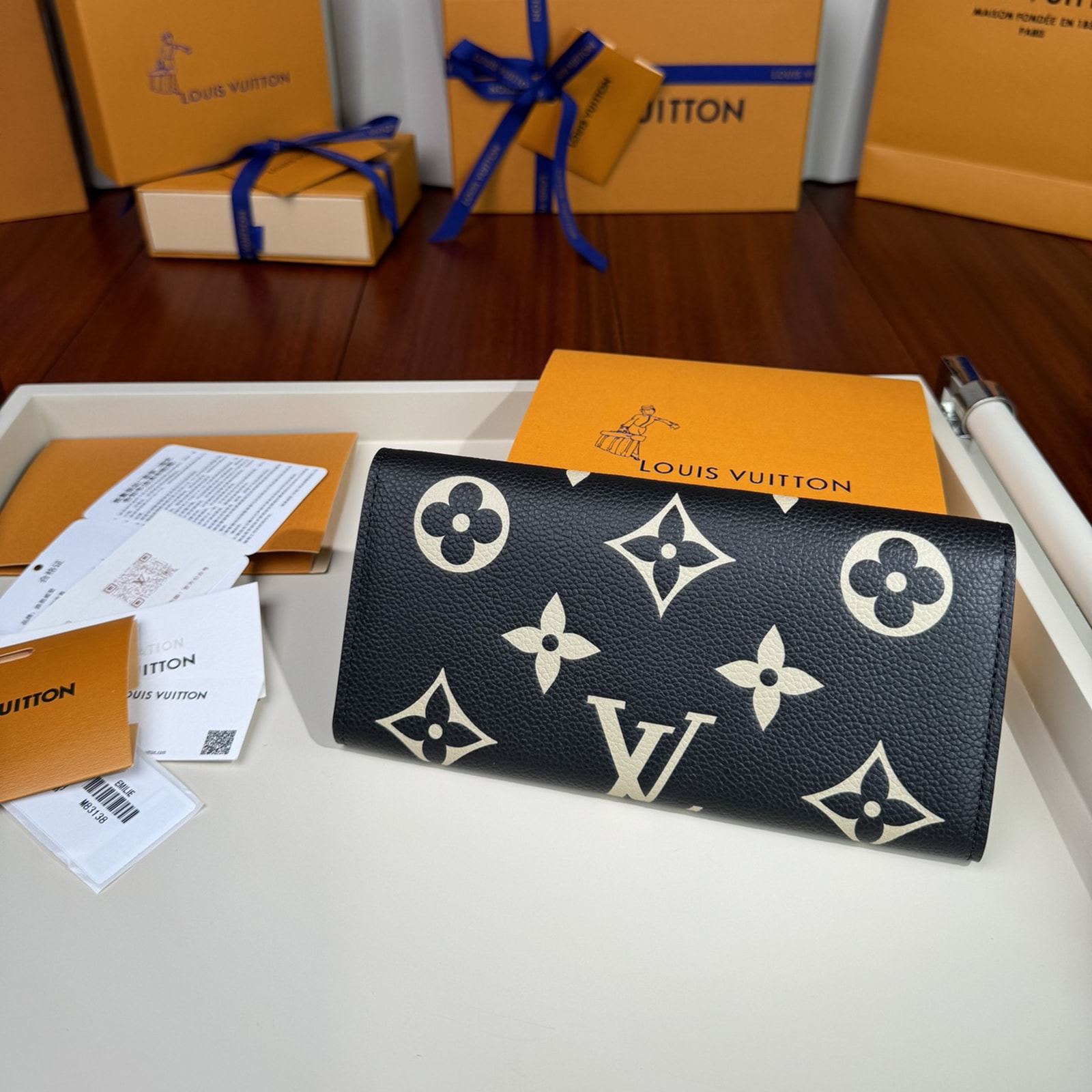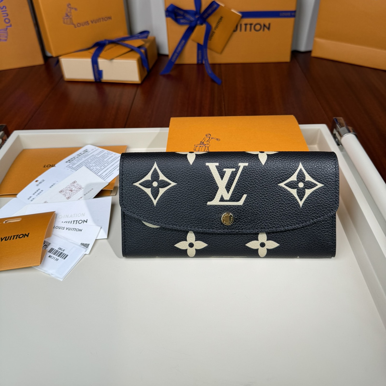 グレイン(しぼ)が美しいモノグラム・アンプラント レザーで仕立てた、スリムでエレガントなデザインの「ポルトフォイユ・エミリー」。財布としてもクラッチとしてもご使用いただけます。ブラックのレザーに目を引くオーバーサイズのクラシカルなモノグラム・パターンをエンボス加工し、さらにベージュでプリント加工を施しました。ファスナー付きコインポケットを備えた収納力も魅力。