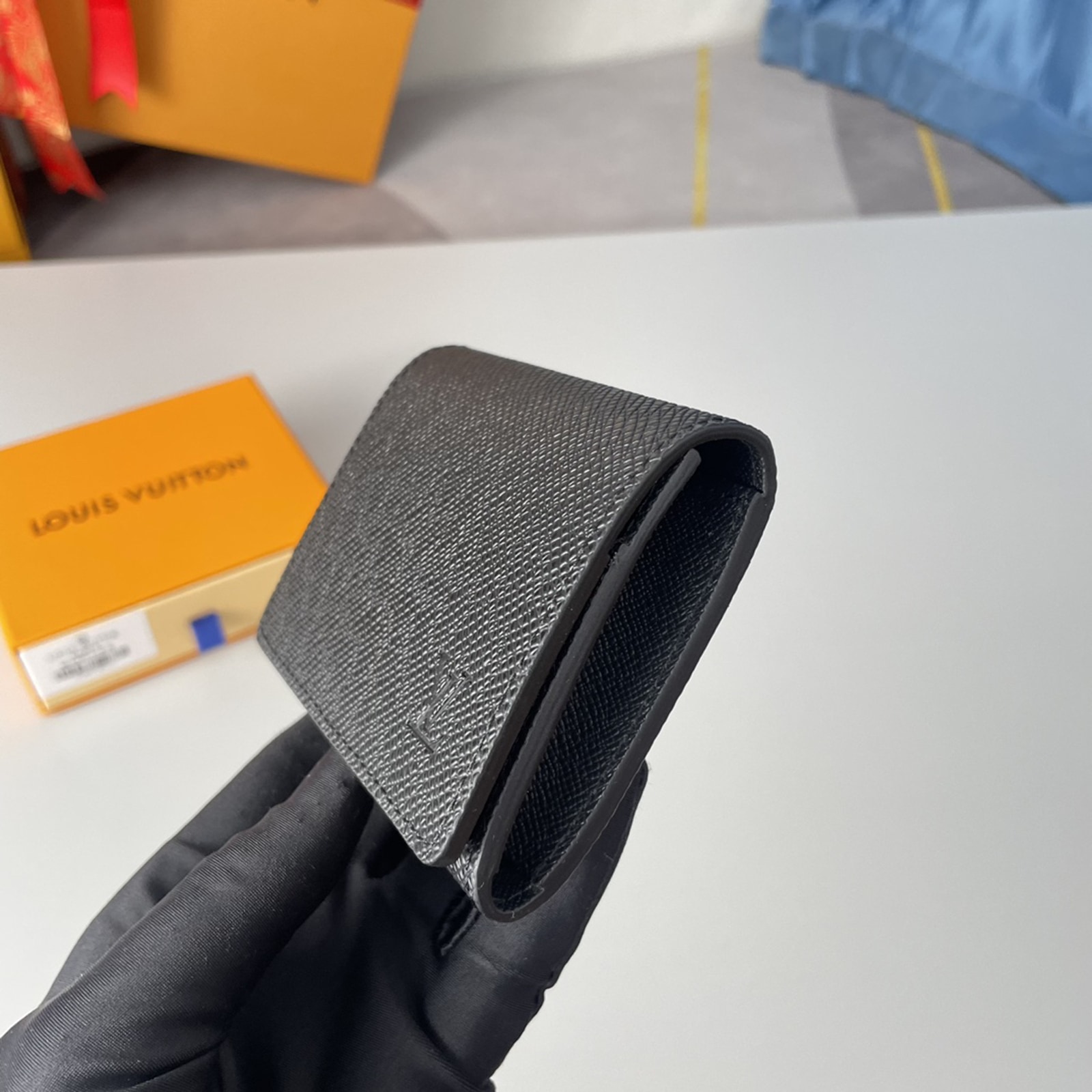 タイガ・レザーを使用した「アンヴェロップ・カルト ドゥ ヴィジット NM」。クレジットカード用の2つのスロットと名刺用に1つのコンパートメントを備えています。
