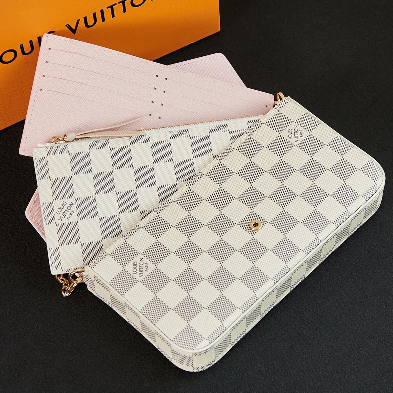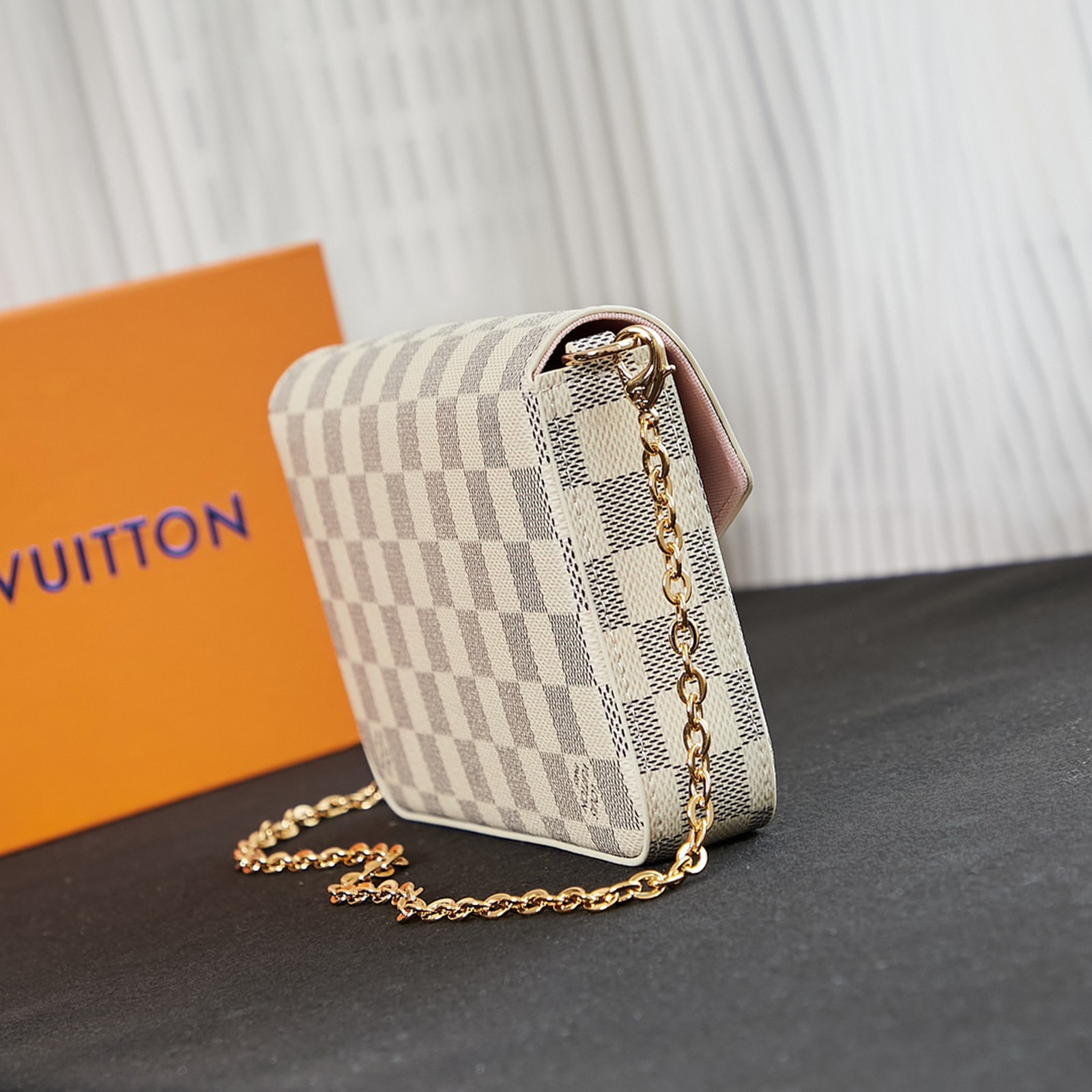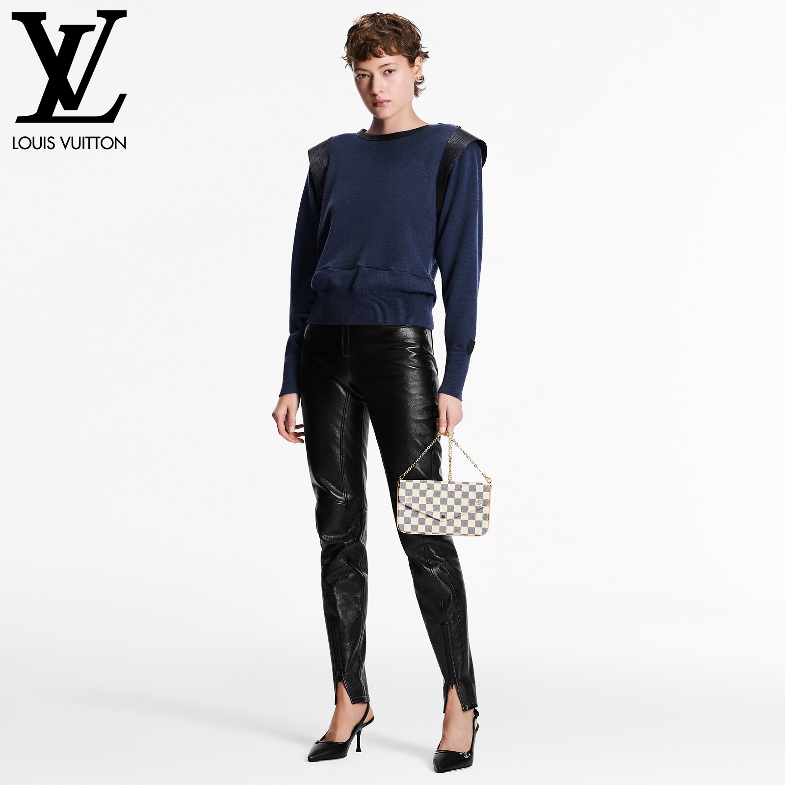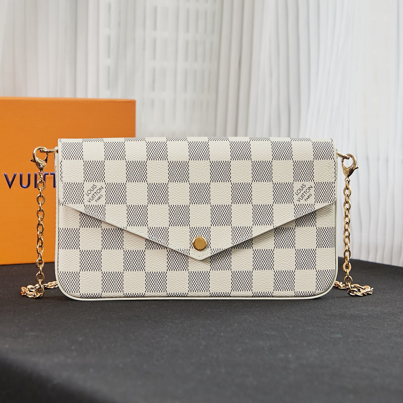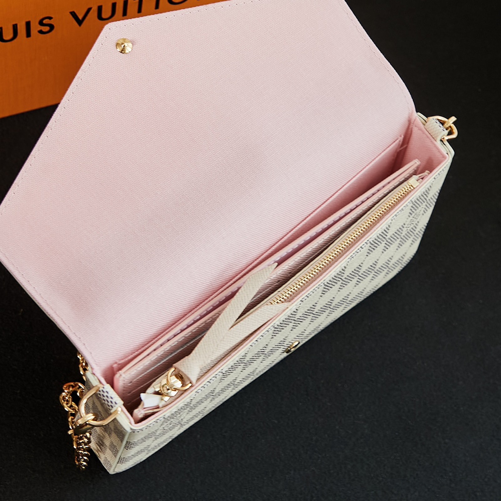 21 x 12 x 3 cm (幅 x 高さ x マチ) 素材:ダミエ・アズール キャンバス、カウハイドレザー(皮革の種類:牛革) トリミング:ダミエ・アズール キャンバス、カウハイドレザー(皮革の種類:牛革) ライニング:マイクロファイバー 金具(色:ゴールド) スナップボタン開閉式 大きなコンパートメント 取外し可能なファスナー式ポケット 8つのカードスロット付き取外し可能なフラットポケット 内フラットポケット 6.7インチのスマートフォン、ポルト カルト・LV チャーム、イヤホン、鍵、リップスティックなど収納可能 チェーン:取り外し可能 チェーンの頂点からバッグ上部までの長さ(最短):53.0 cm
