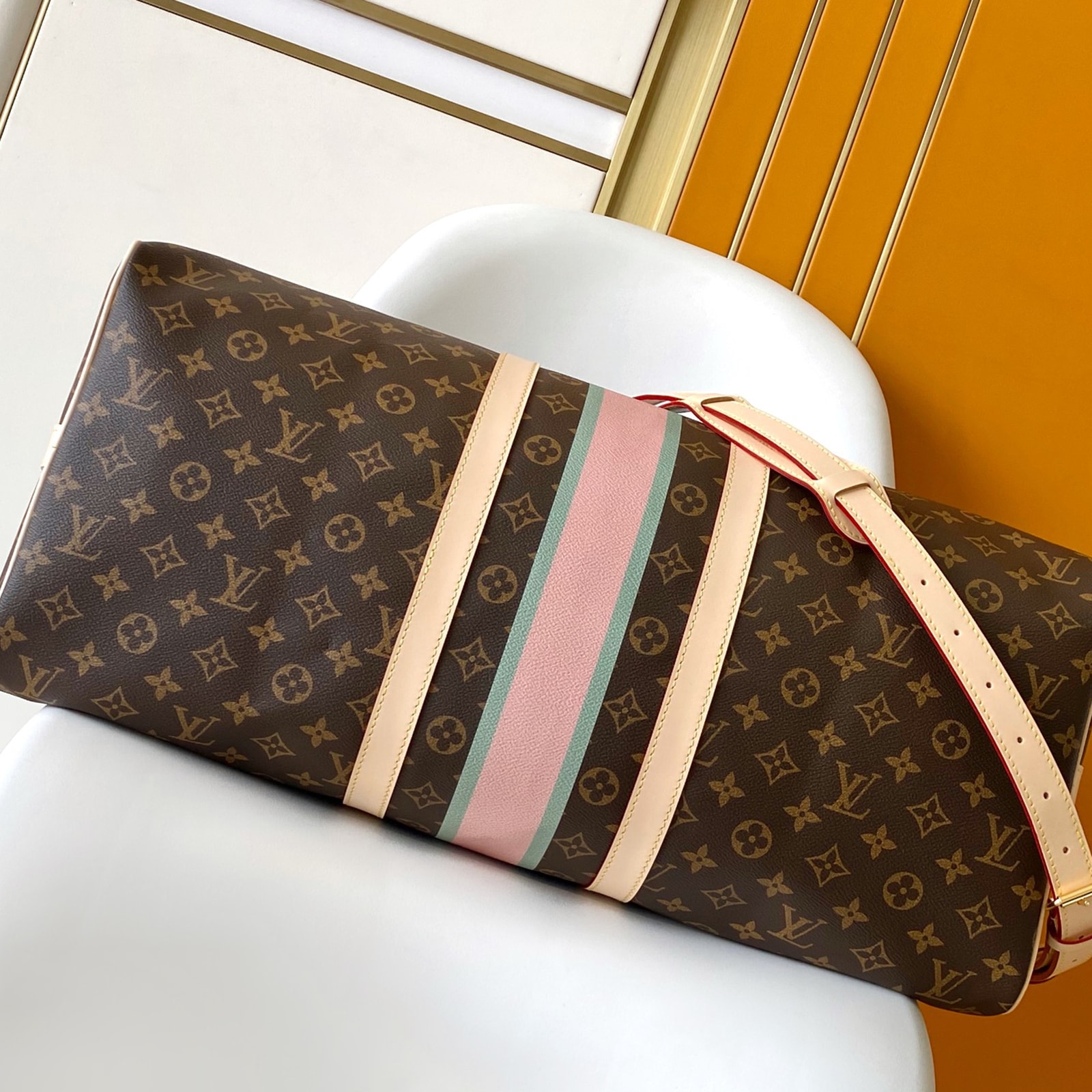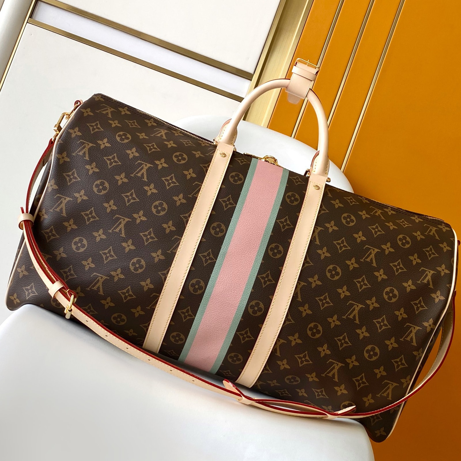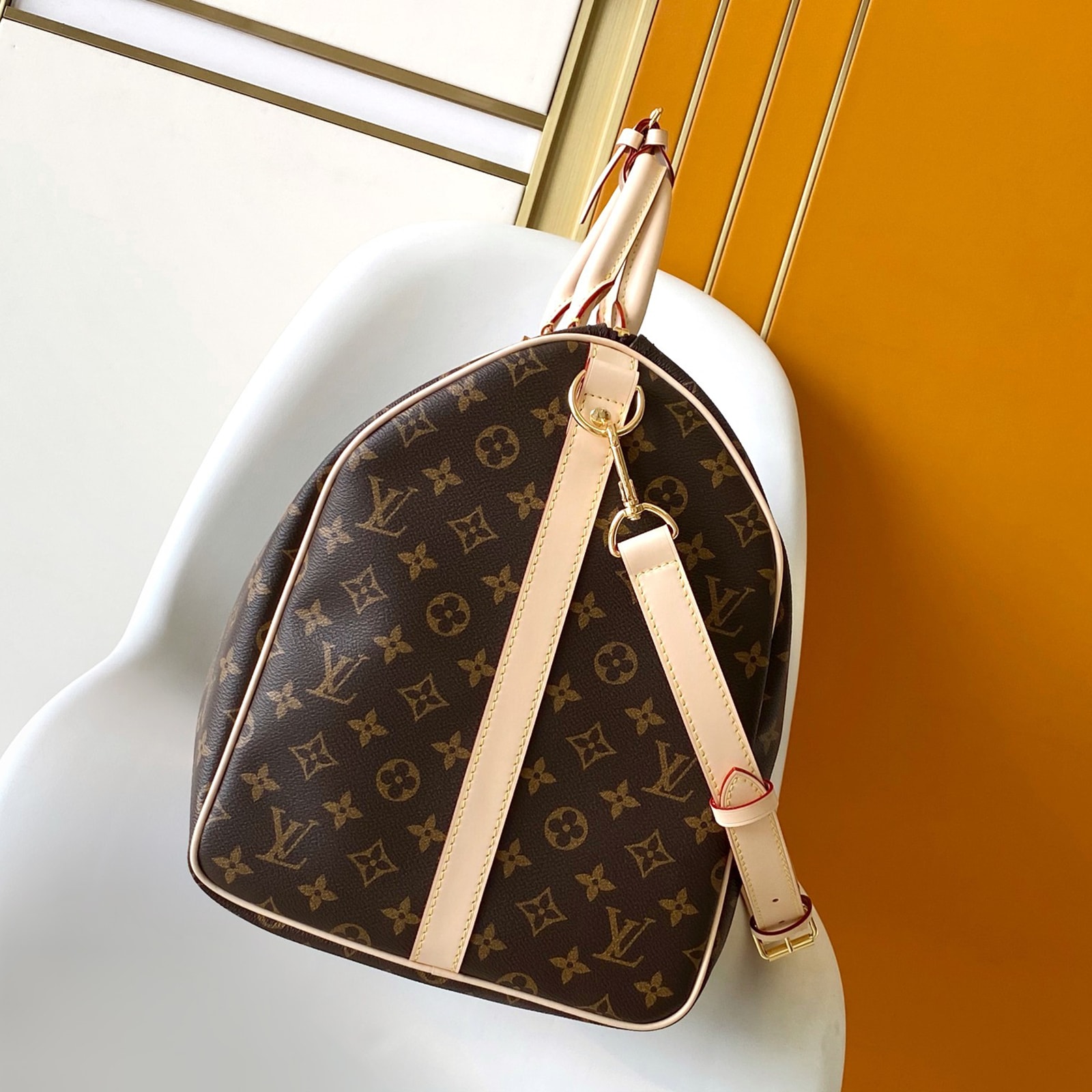 55 x 31 x 26 cm (幅 x 高さ x マチ) 素材:モノグラム・キャンバス トリミング:ヌメ革(皮革の種類:牛革) ライニング:コットン 金具(色:ゴールド) ダブルファスナー開閉式 取外し可能なレザーのネームタグ パドロック(錠前) 機内持ち込み可能なサイズ(航空会社や使用する機材によって条件は異なります) ストラップ:取り外し可能, 調整可能 ストラップの頂点からバッグ上部までの長さ(最短):36.0 cm ストラップの頂点からバッグ上部までの長さ(最長):50.0 cm ハンドル:ダブル