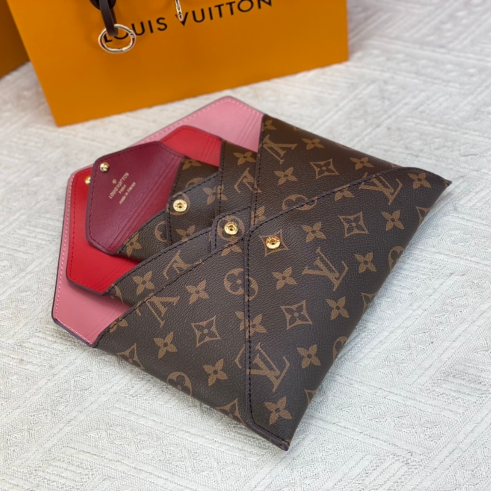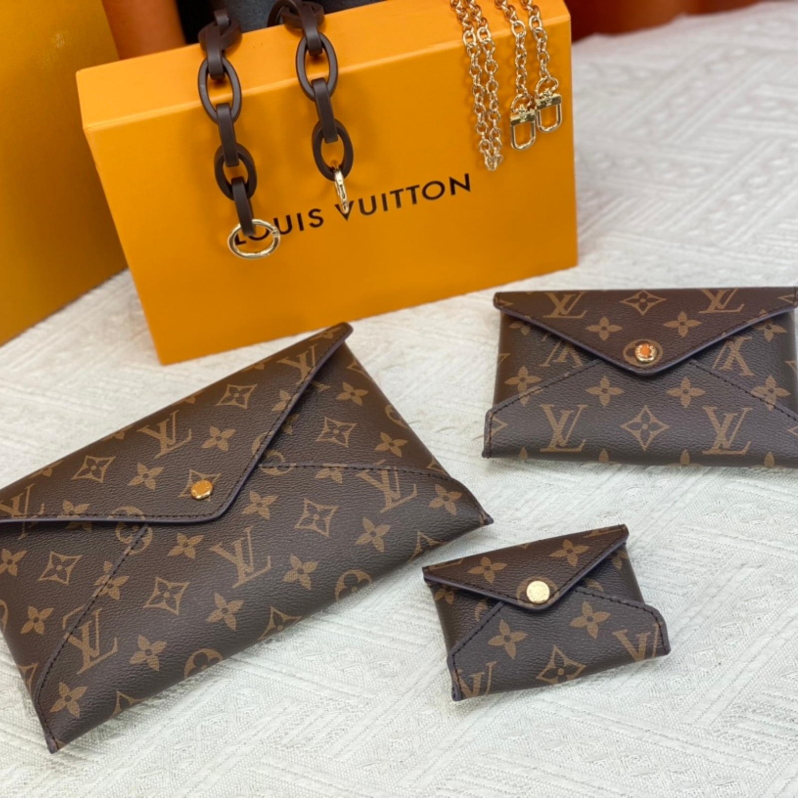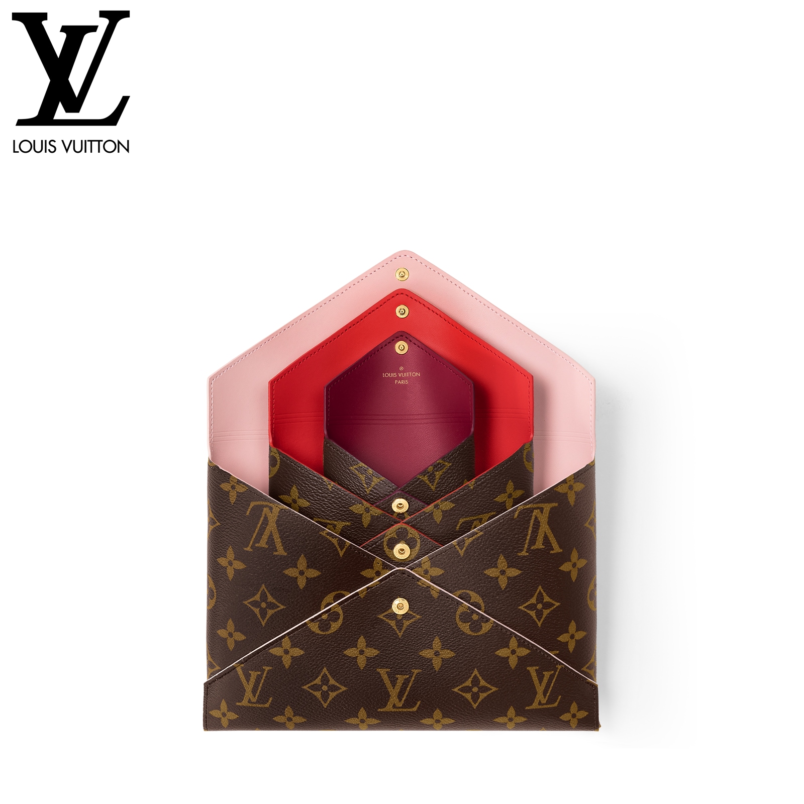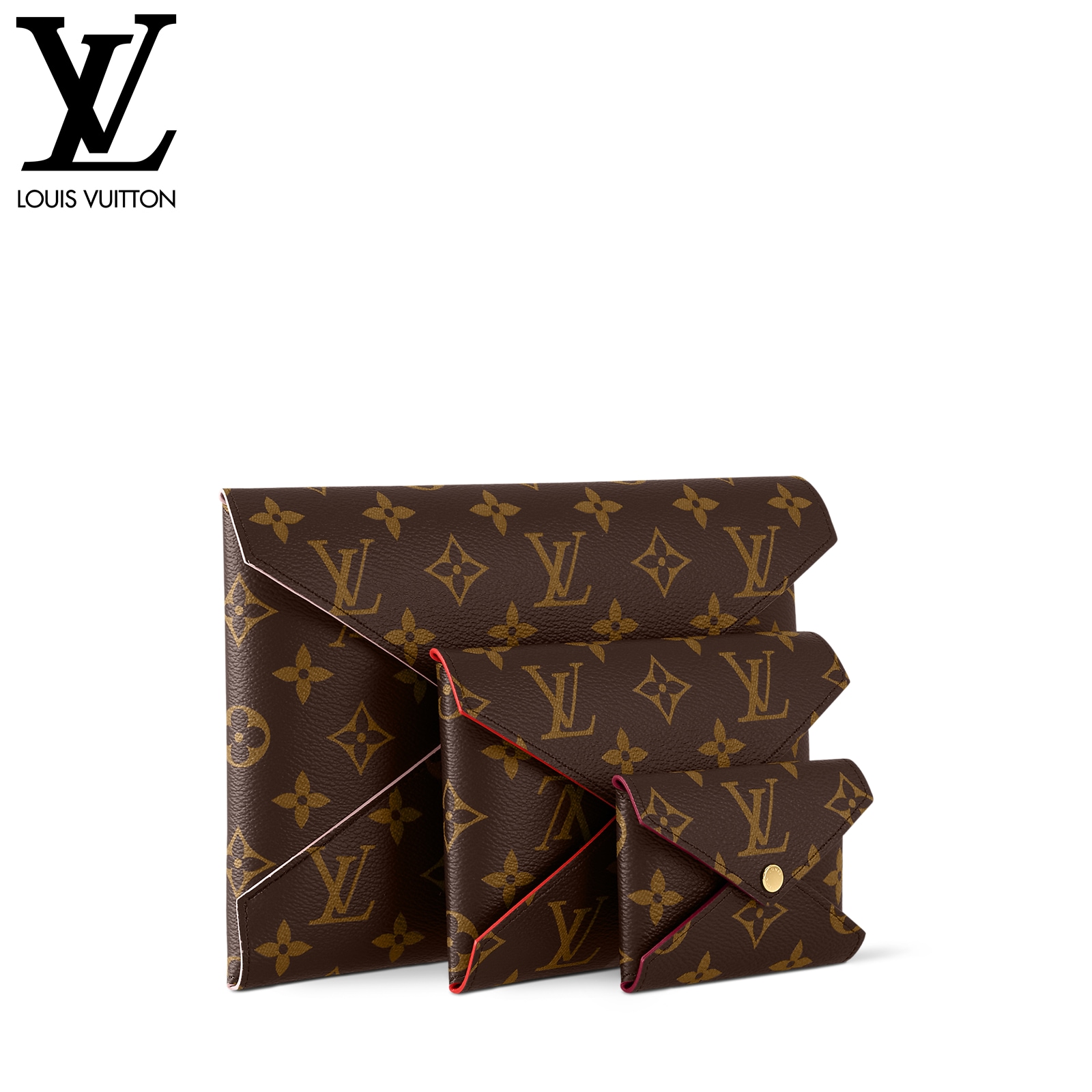 3つのエンヴェロップを1つに合わせた「ポシェット・キリガミ」。ロシアの人形 マトリョーシカのような構造は、日用品を持ち運ぶのに最適。大きなポシェットには書類、口紅、小切手帳などの日用品を、ミディアムサイズのポシェットにはパスポートや鍵を、そしてミニサイズのポシェットにはカードやコインを収納できます。
