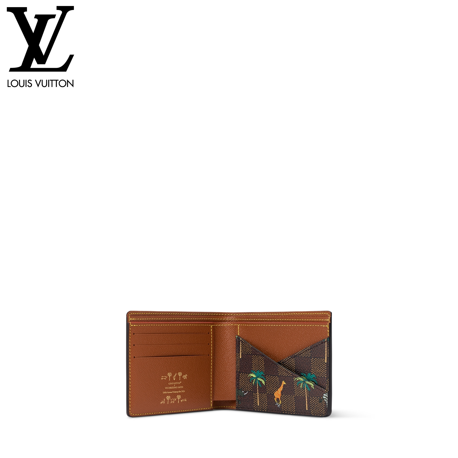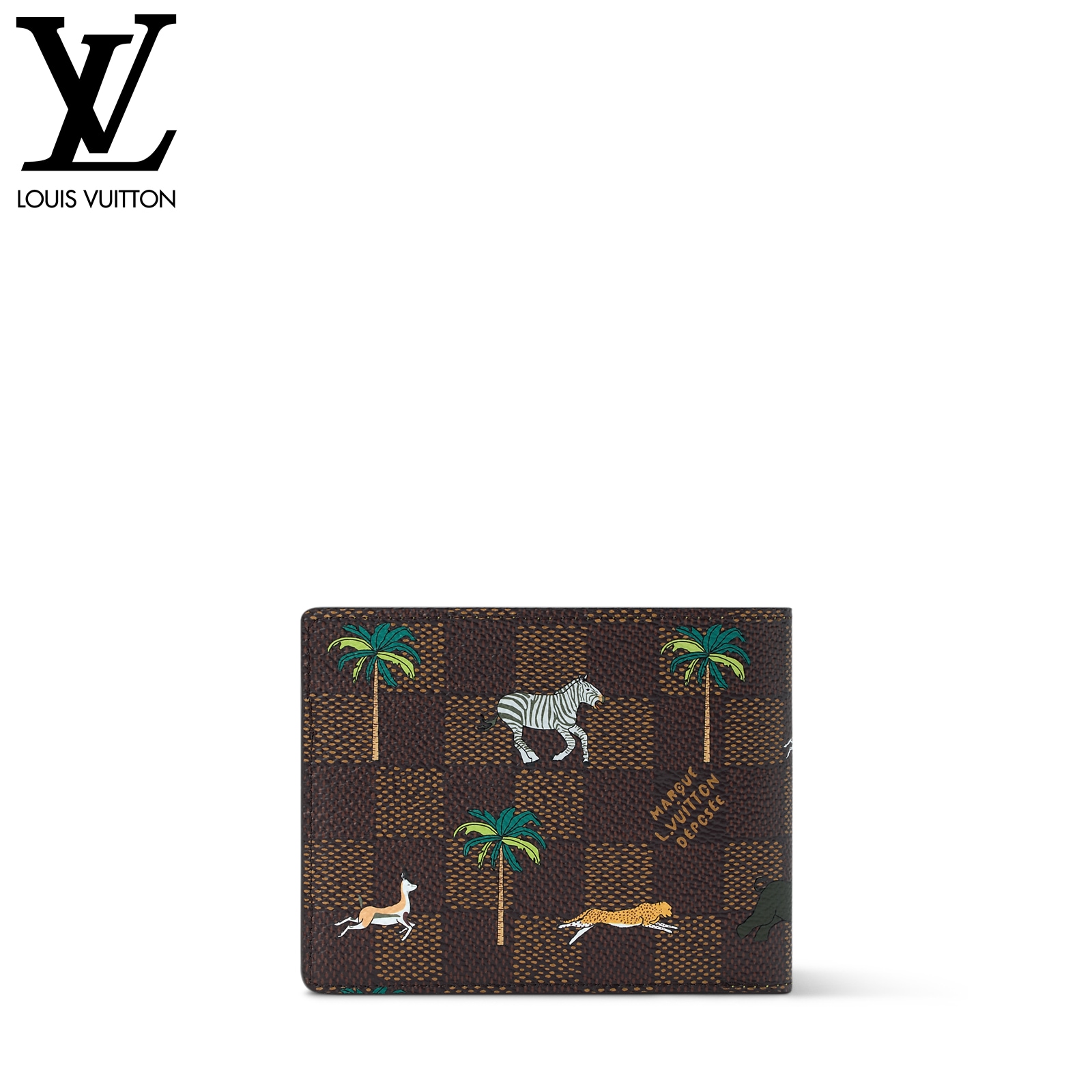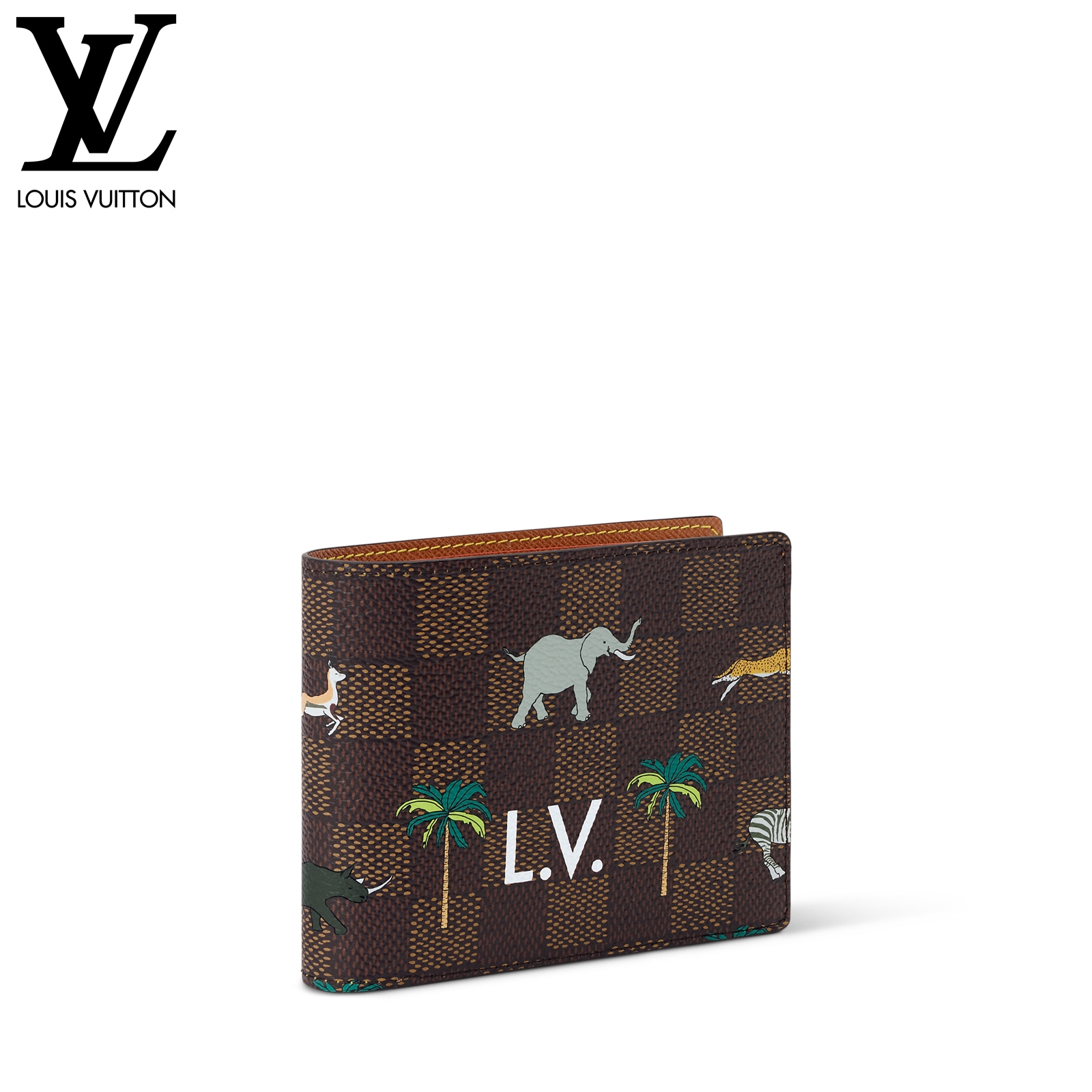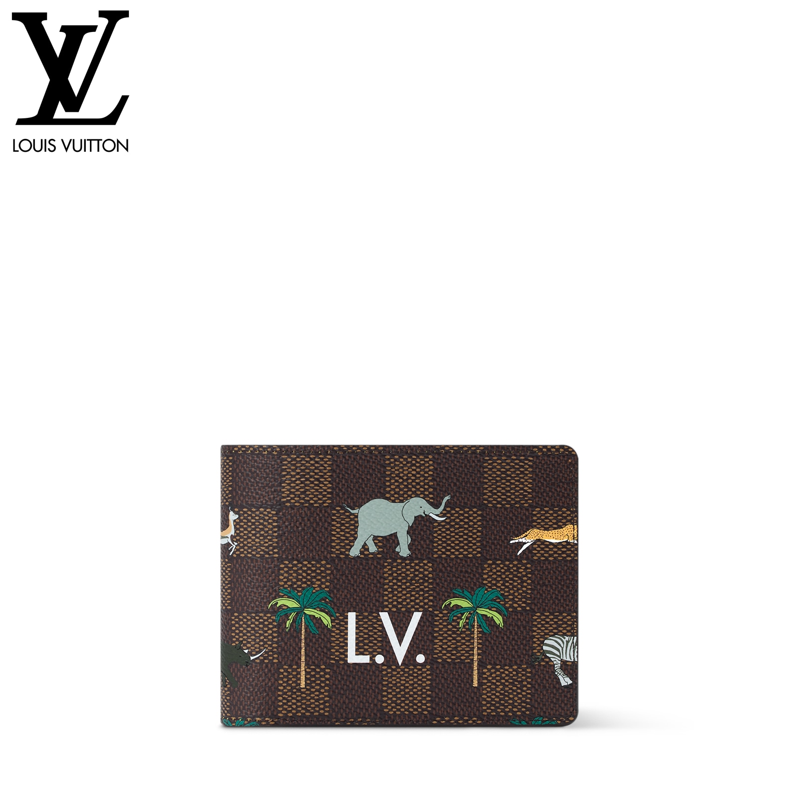 「LV × ザ・ダージリン リミテッド」コレクションの一部として登場した「LV × ザ・ダージリン リミテッド ポルトフォイユ・ミュルティプル」。ダミエ・ヘリテージ キャンバスに、太字ホワイトの「L.V.」イニシャルと活気ある動物たちのイラストをあしらいました。内装の明るいブラウンのレザーが、パターンをあしらったキャンバスとの美しいコントラストを生み出します。複数のポケットとカードスロットを備えた、エレガンスと実用性を叶えるコンパクトな財布。