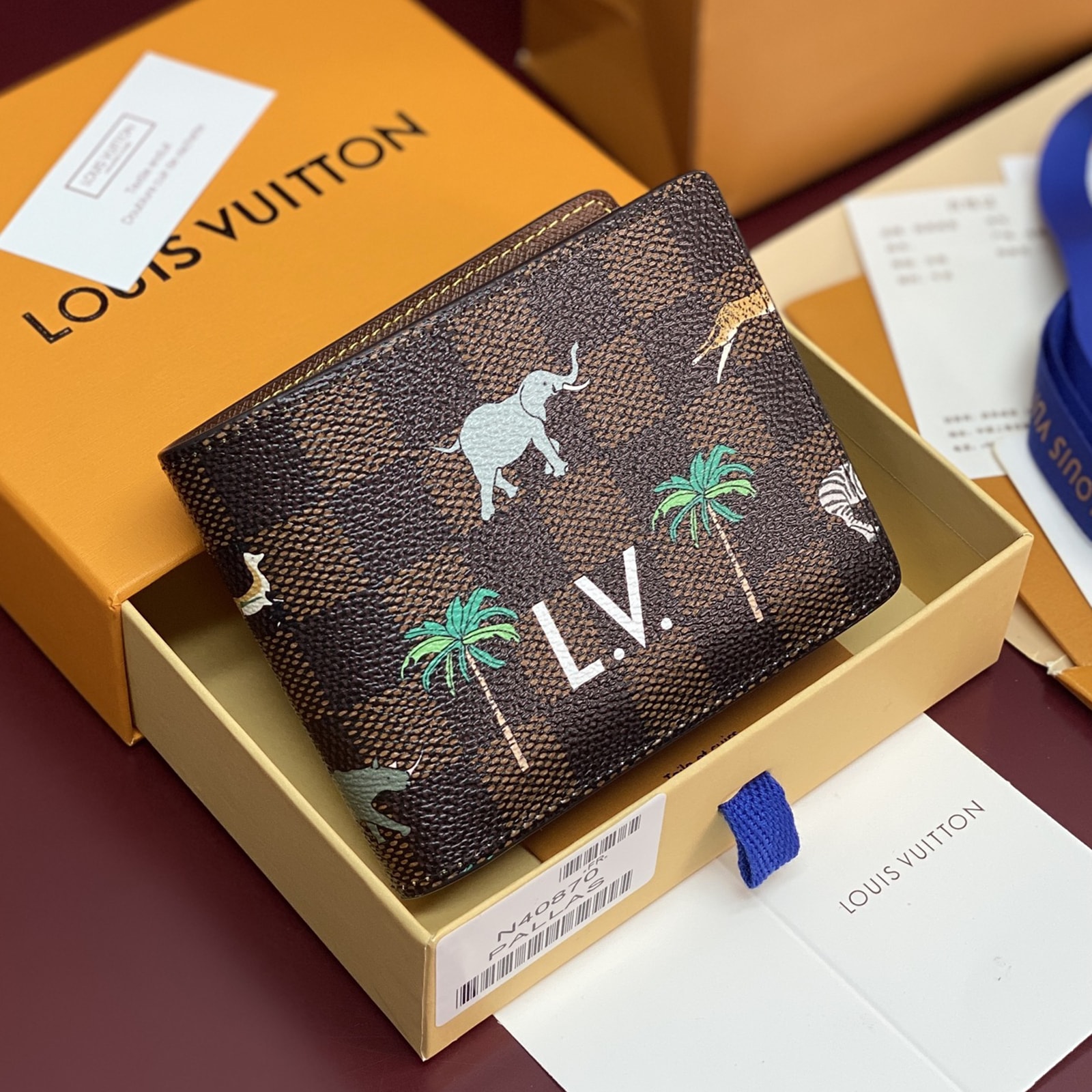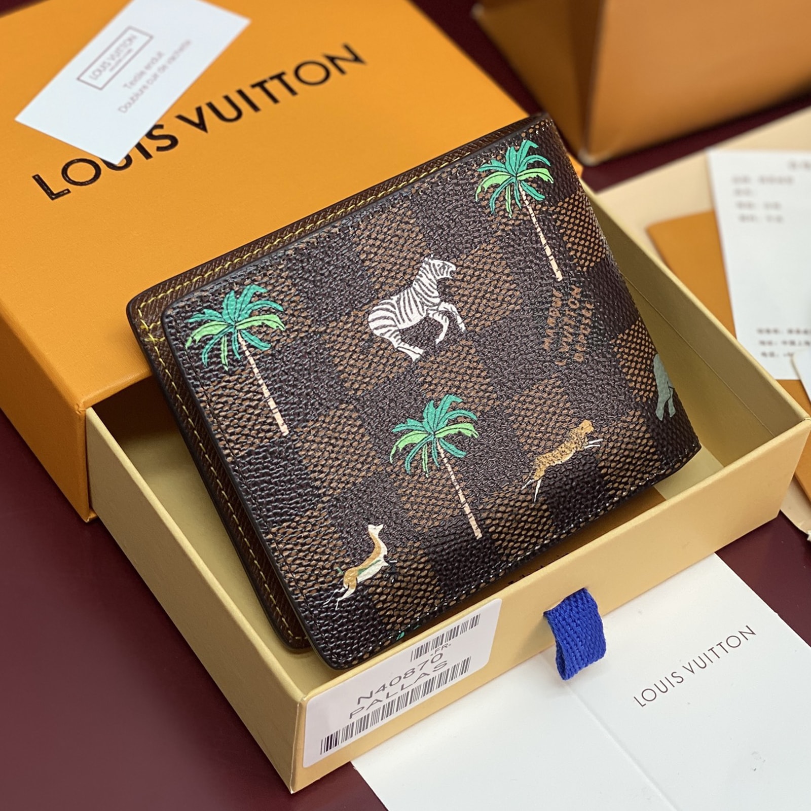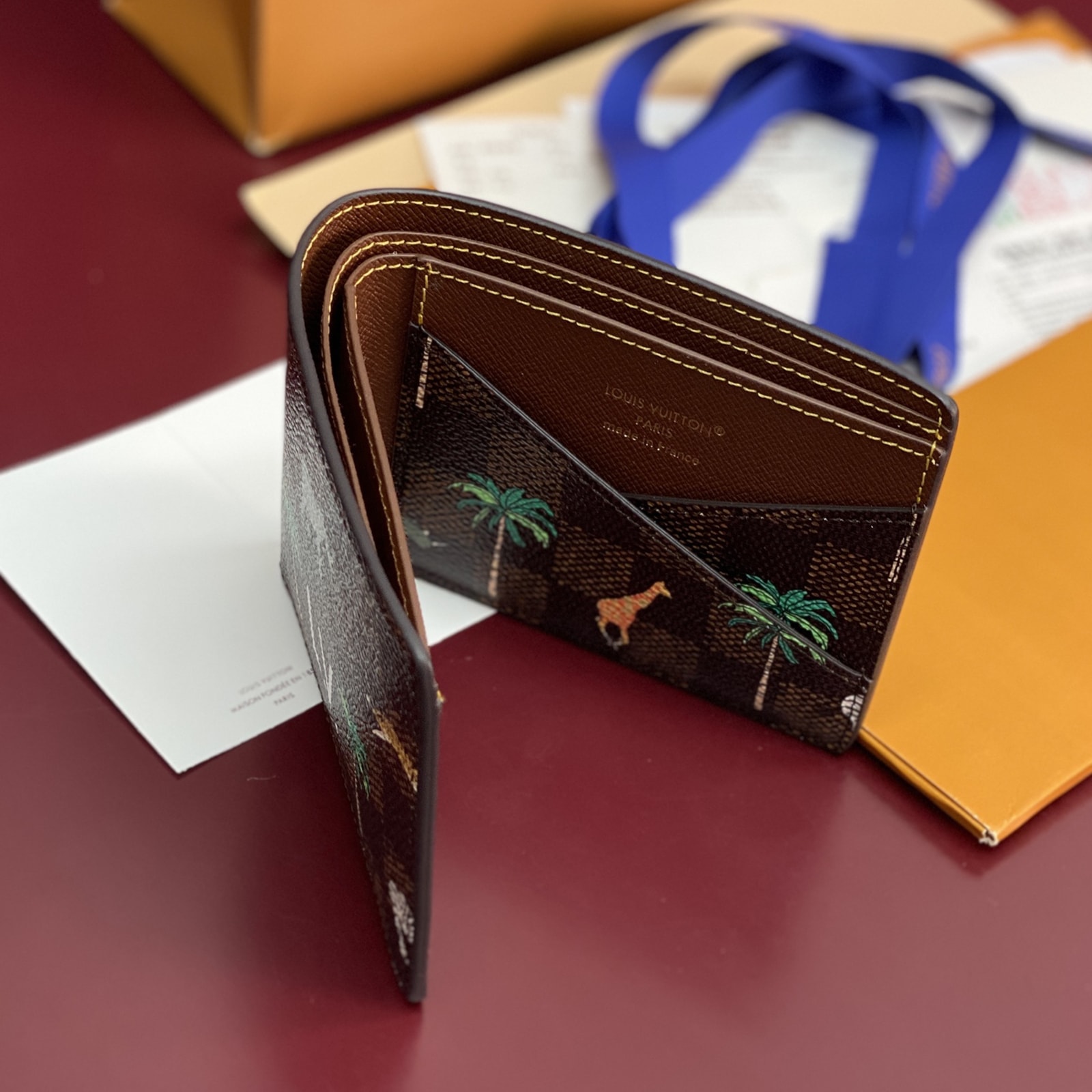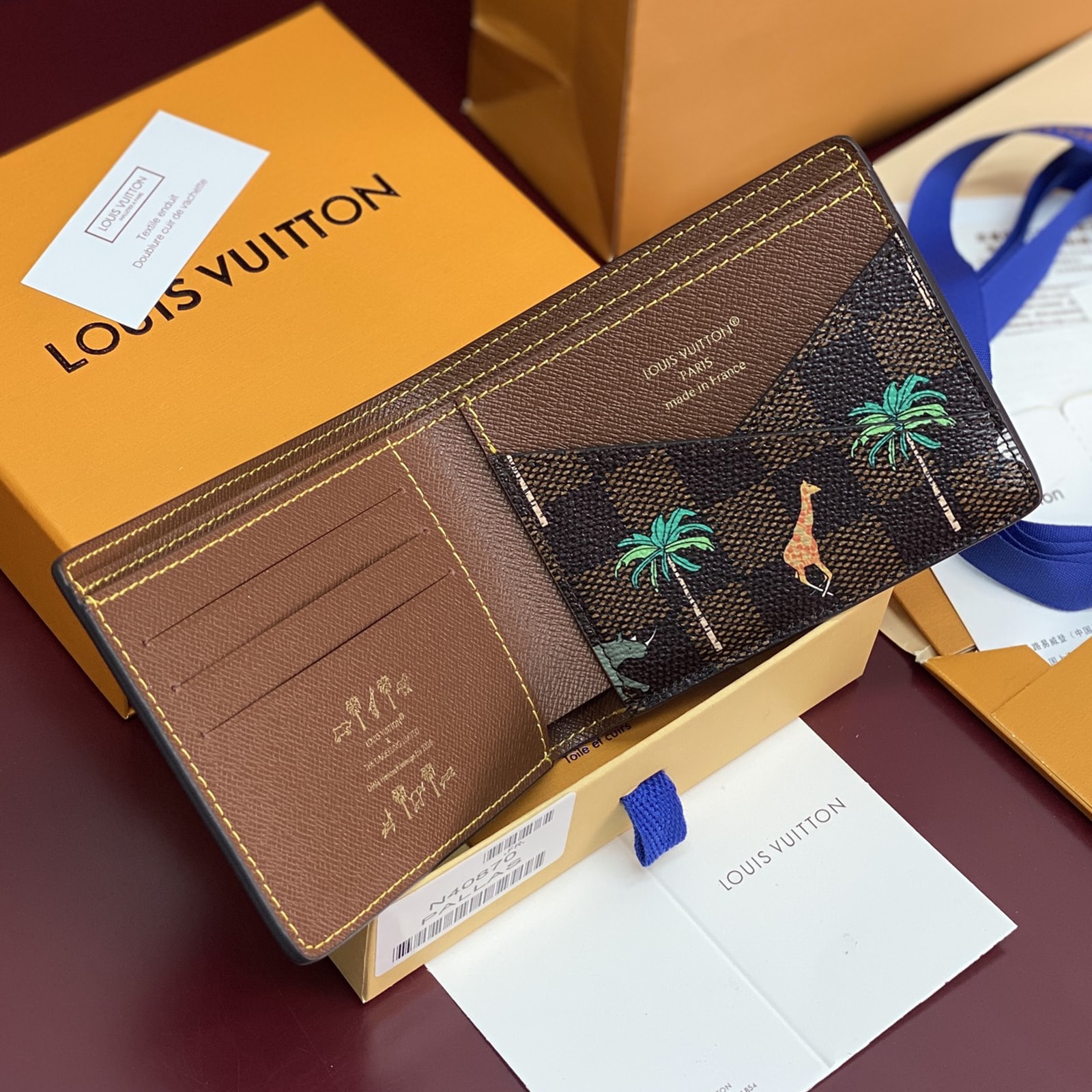 「LV × ザ・ダージリン リミテッド」コレクションの一部として登場した「LV × ザ・ダージリン リミテッド ポルトフォイユ・ミュルティプル」。ダミエ・ヘリテージ キャンバスに、太字ホワイトの「L.V.」イニシャルと活気ある動物たちのイラストをあしらいました。内装の明るいブラウンのレザーが、パターンをあしらったキャンバスとの美しいコントラストを生み出します。複数のポケットとカードスロットを備えた、エレガンスと実用性を叶えるコンパクトな財布。
