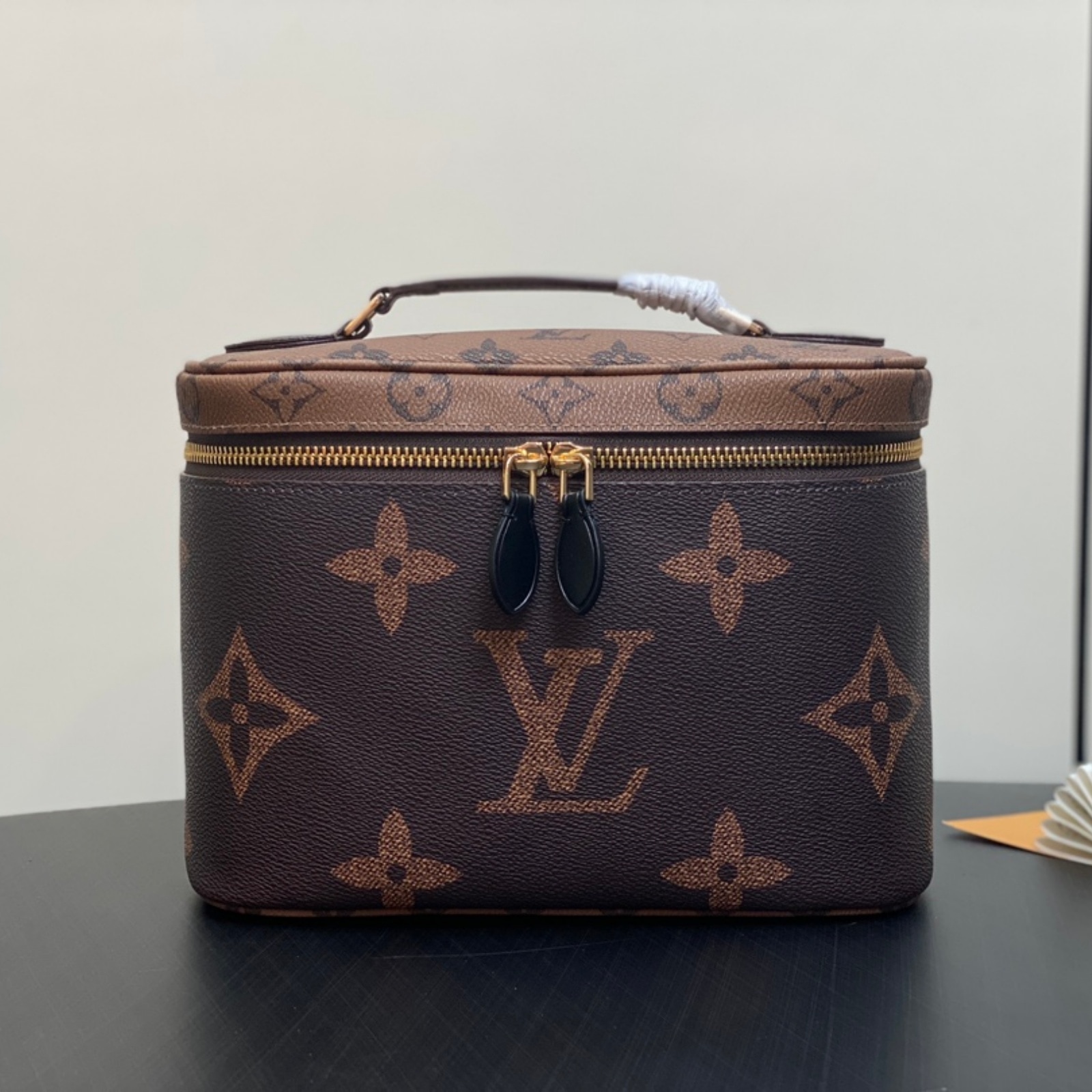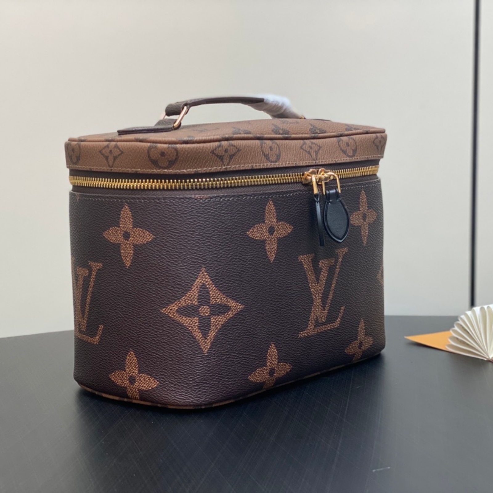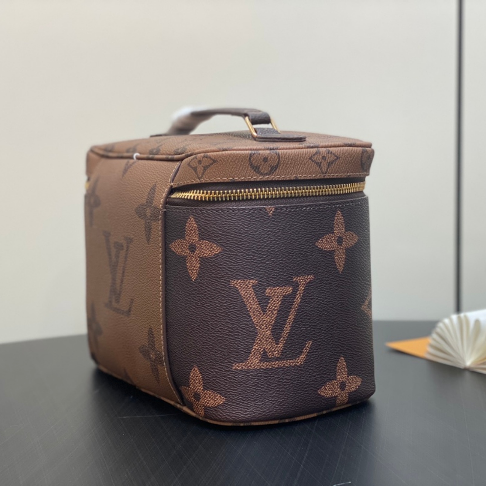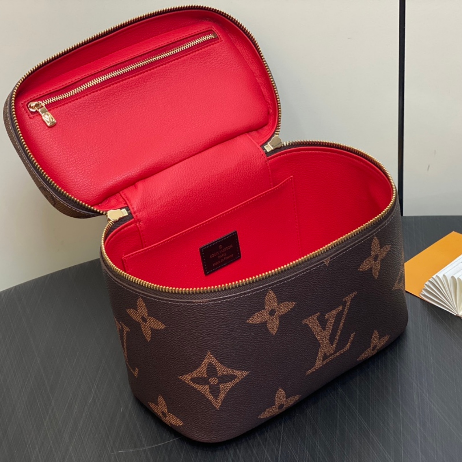 モノグラム・ジャイアント キャンバスで仕立て、上部にはモノグラム・リバース キャンバスを使用した「ニース BB」。美容の必需品を持ち運ぶのに最適な、洗練された小ぶりのトイレタリーバッグです。フラップ下のファスナー付きポケットは、貴重品の収納にぴったり。ライニングには鮮やかなレッドのレザーをあしらいました。