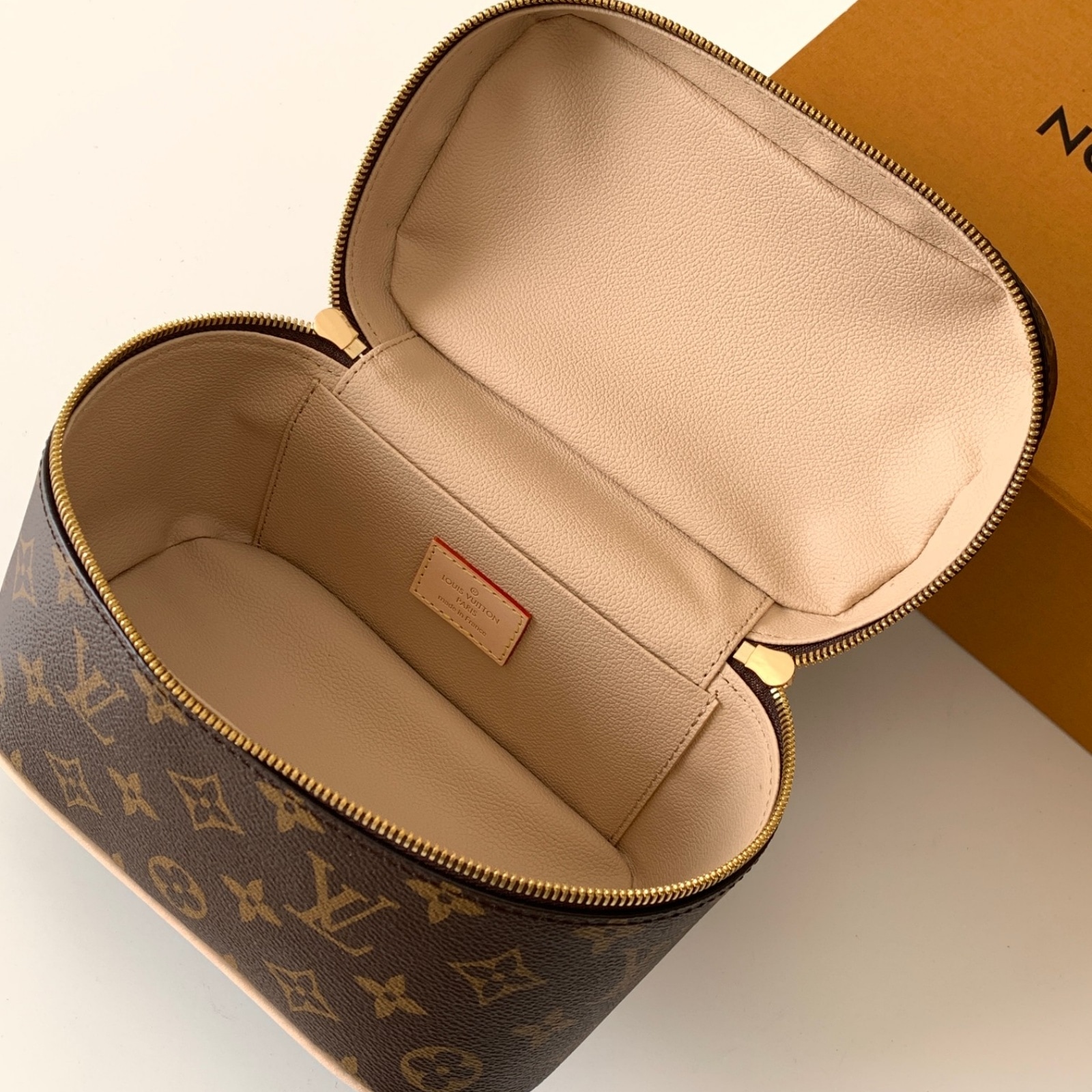 20 x 13.5 x 12 cm(幅 x 高さ x マチ)素材:モノグラム・キャンバストリミング:レザー(皮革の種類:牛革)ライニング:コーティングを施したテキスタイル金具(色:ゴールド)ダブルジップ開閉式引き手にLVの刻印内フラットポケットハンドル:シングル