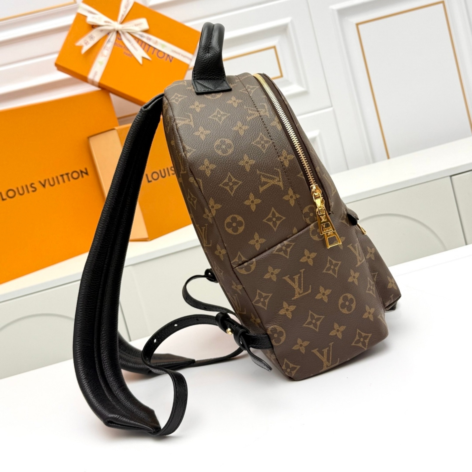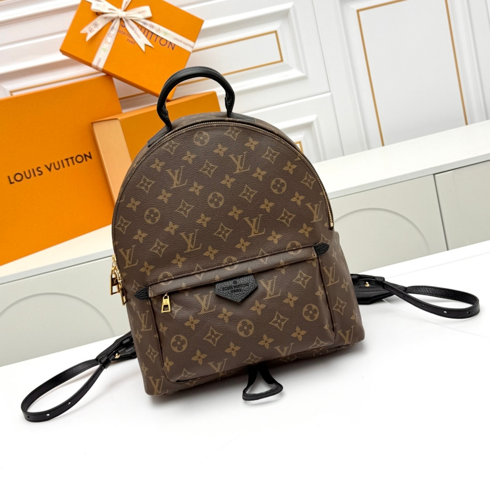 30 x 33 x 16 cm(幅 x 高さ x マチ)素材:モノグラム・キャンバストリミング:裏地を施したカウハイドレザー(皮革の種類:牛革)ライニング:テキスタイル金具(色:ゴールド)バックパックに使える調節可能なレザーのショルダーストラップ(最短:54 cm、最長:81 cm) × 2ファスナー開閉式レザーのスカーフホルダーフロントにファスナー式外ポケット内フラットポケット13インチのノートパソコン、スマートフォン、ジッピー・ウォレット、イヤホン、ポケットティッシュ、鍵、リップスティックなど収納可能ハンドル:シングル