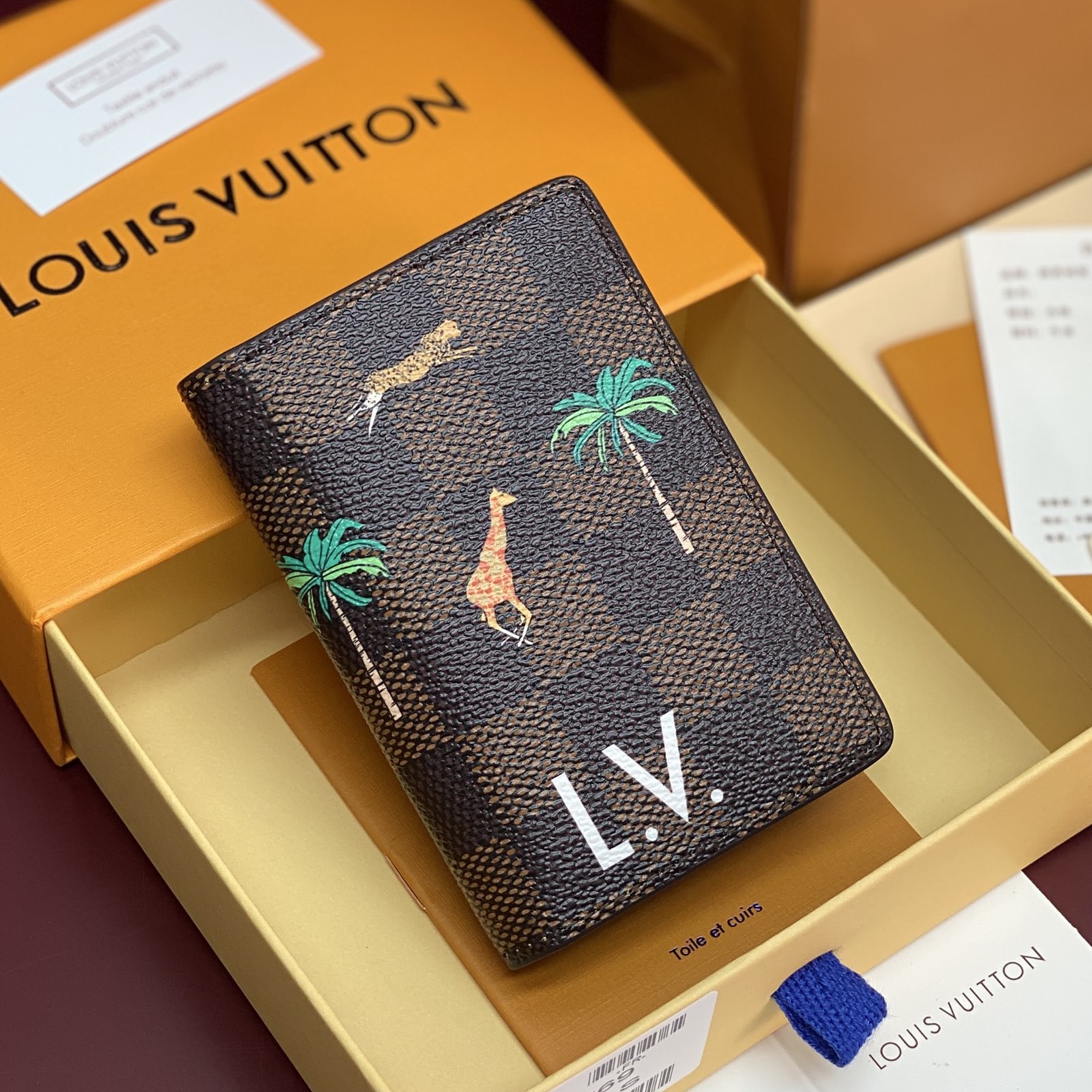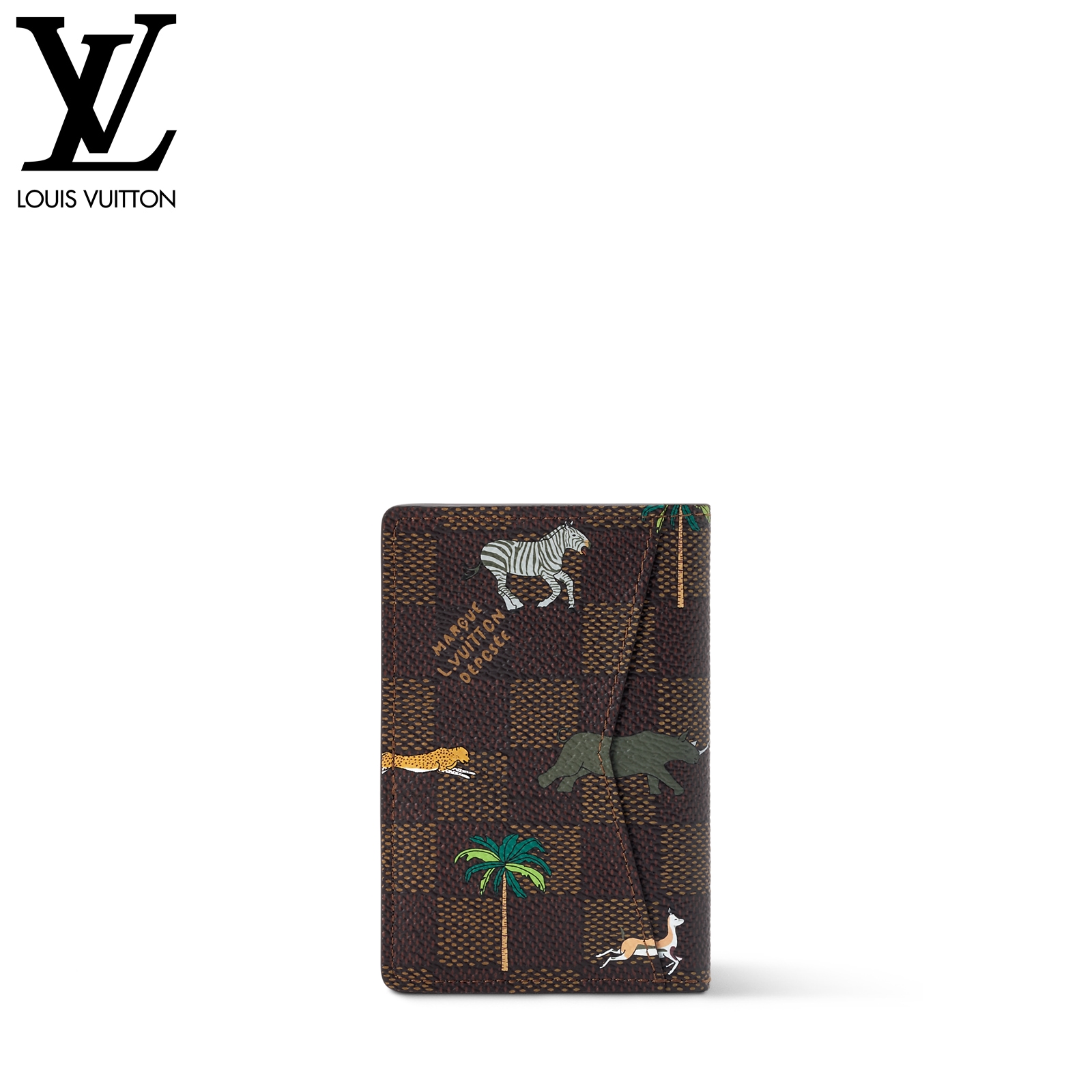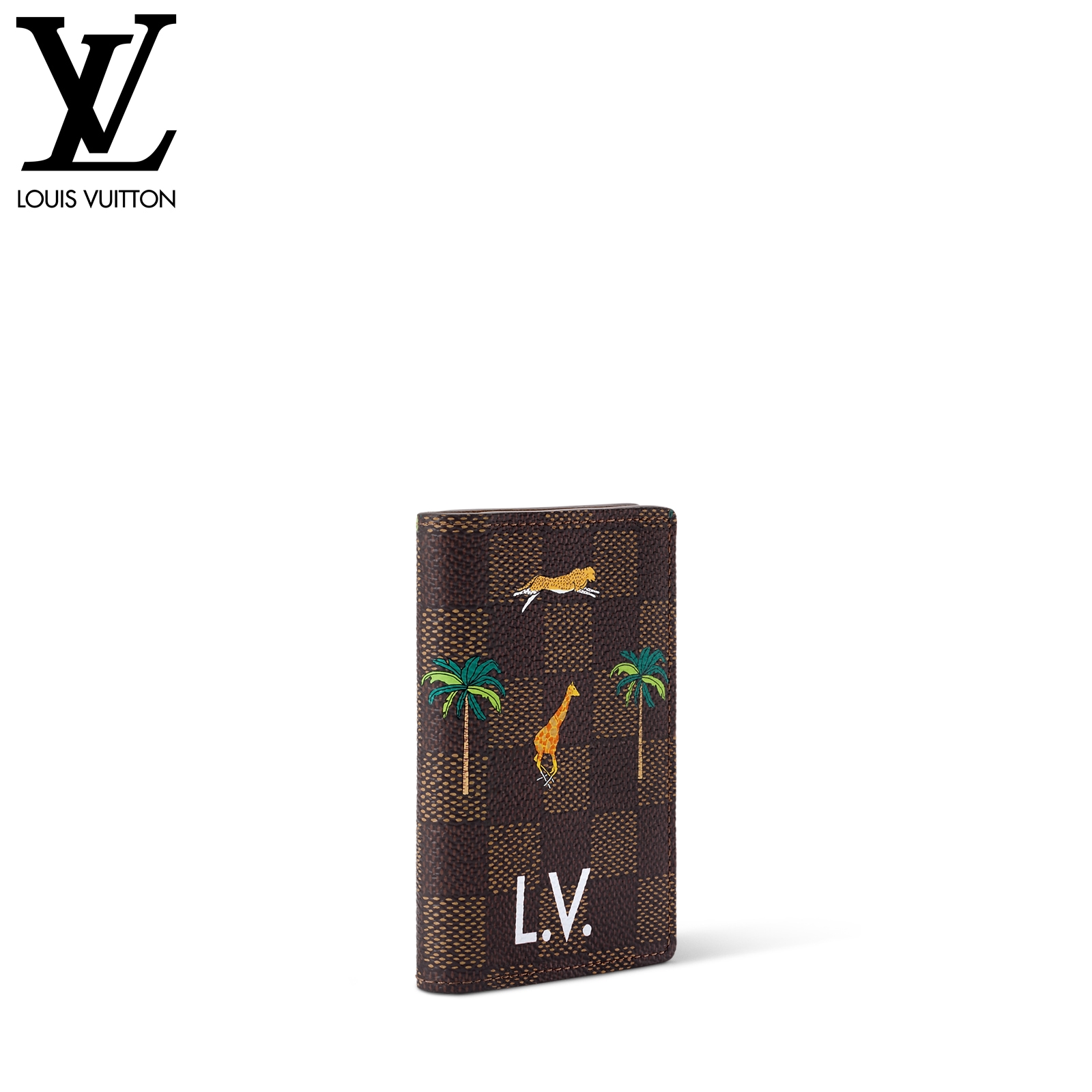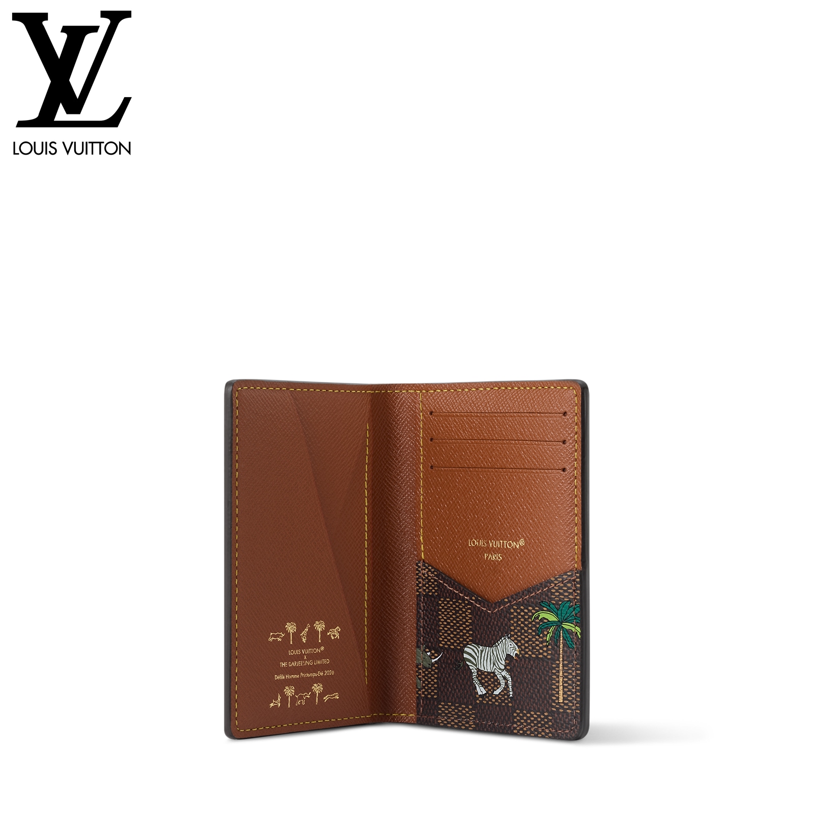 ダミエ・ヘリテージ キャンバスの内外に施された躍動感溢れる動物やヤシの木のモチーフが、プレイフルな雰囲気を演出する「LV × ザ・ダージリン リミテッド オーガナイザー・ドゥ ポッシュ」。前面には、映画『ダージリン急行』に登場するルイ・ヴィトンのラゲージを想起させる、太字ホワイトの「L.V.」イニシャルがあしらわれています。内装に配した5つのポケットと3つのカードスロット、さらに外ポケットが機能性を高めるデザイン。