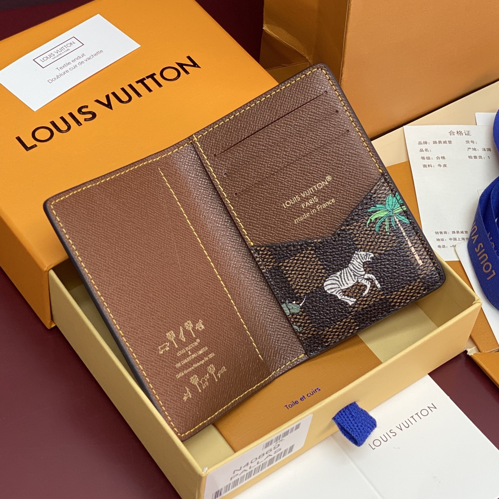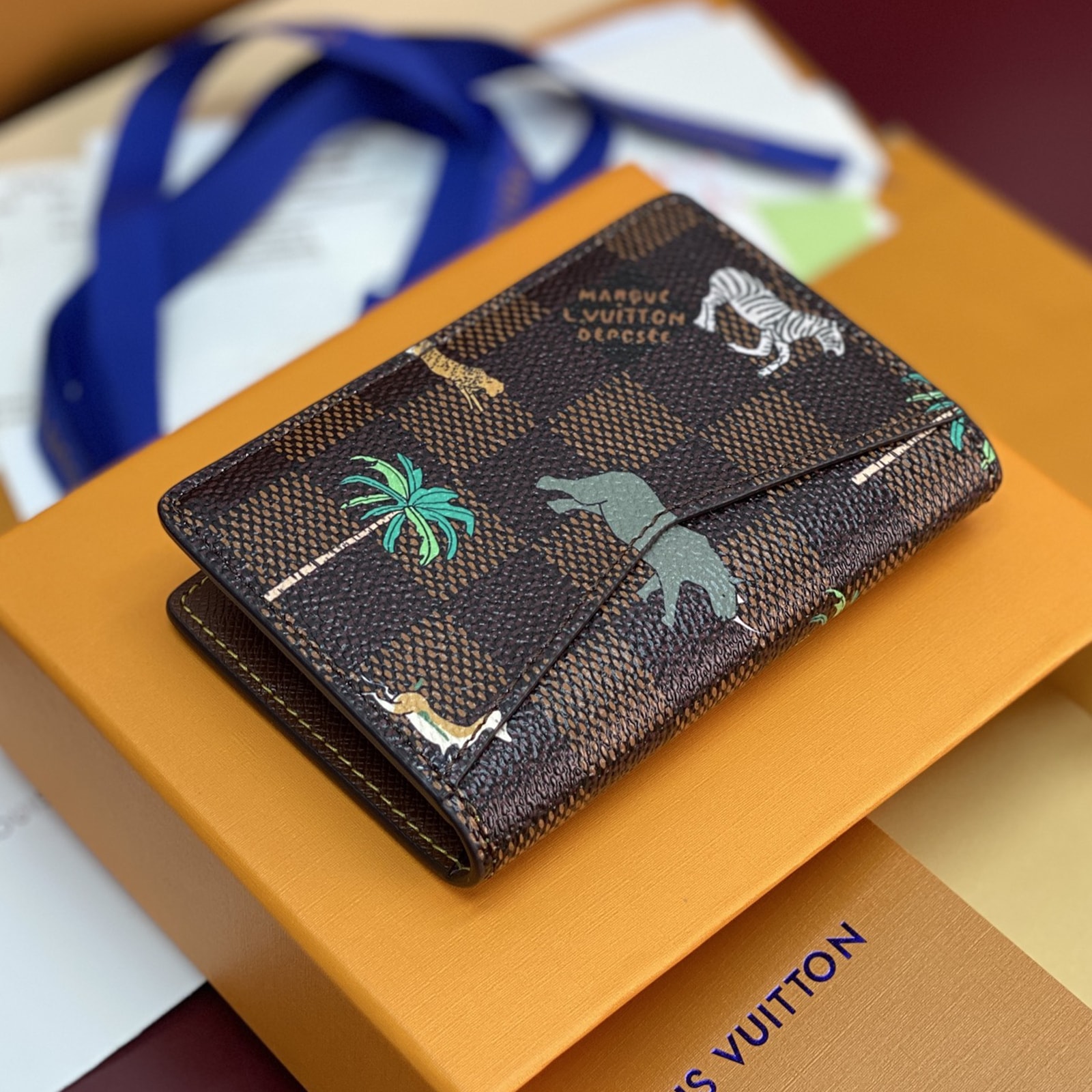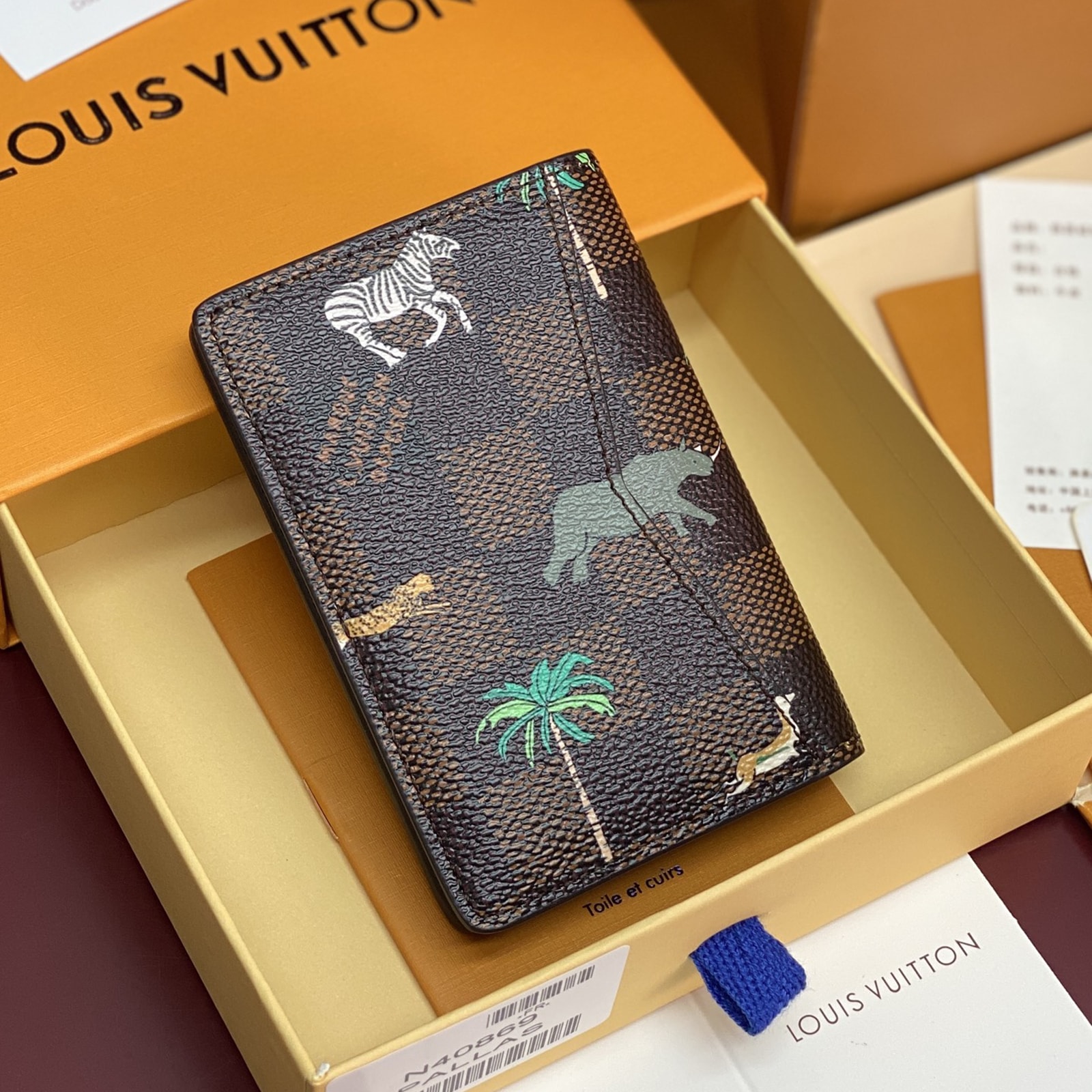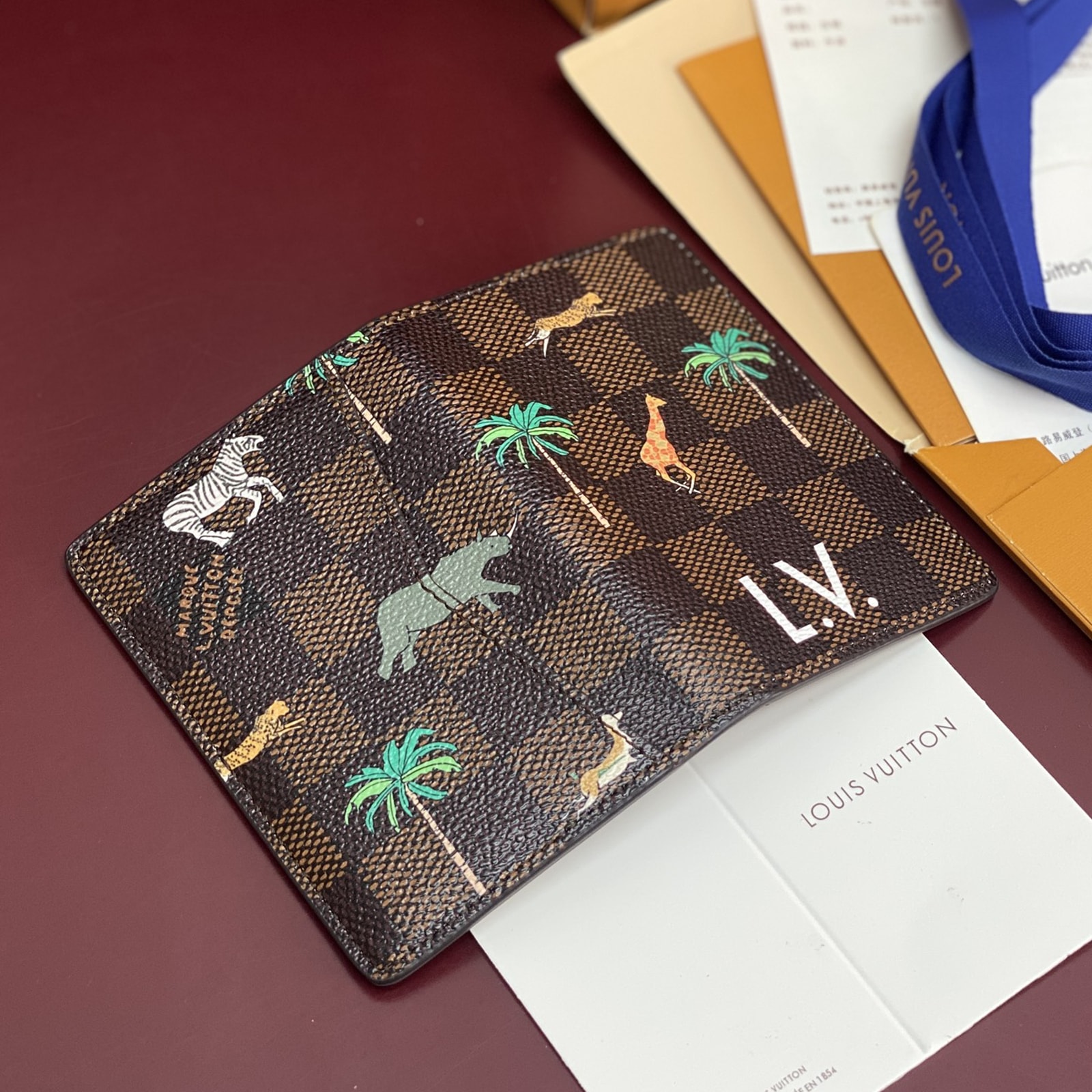 ダミエ・ヘリテージ キャンバスの内外に施された躍動感溢れる動物やヤシの木のモチーフが、プレイフルな雰囲気を演出する「LV × ザ・ダージリン リミテッド オーガナイザー・ドゥ ポッシュ」。前面には、映画『ダージリン急行』に登場するルイ・ヴィトンのラゲージを想起させる、太字ホワイトの「L.V.」イニシャルがあしらわれています。内装に配した5つのポケットと3つのカードスロット、さらに外ポケットが機能性を高めるデザイン。