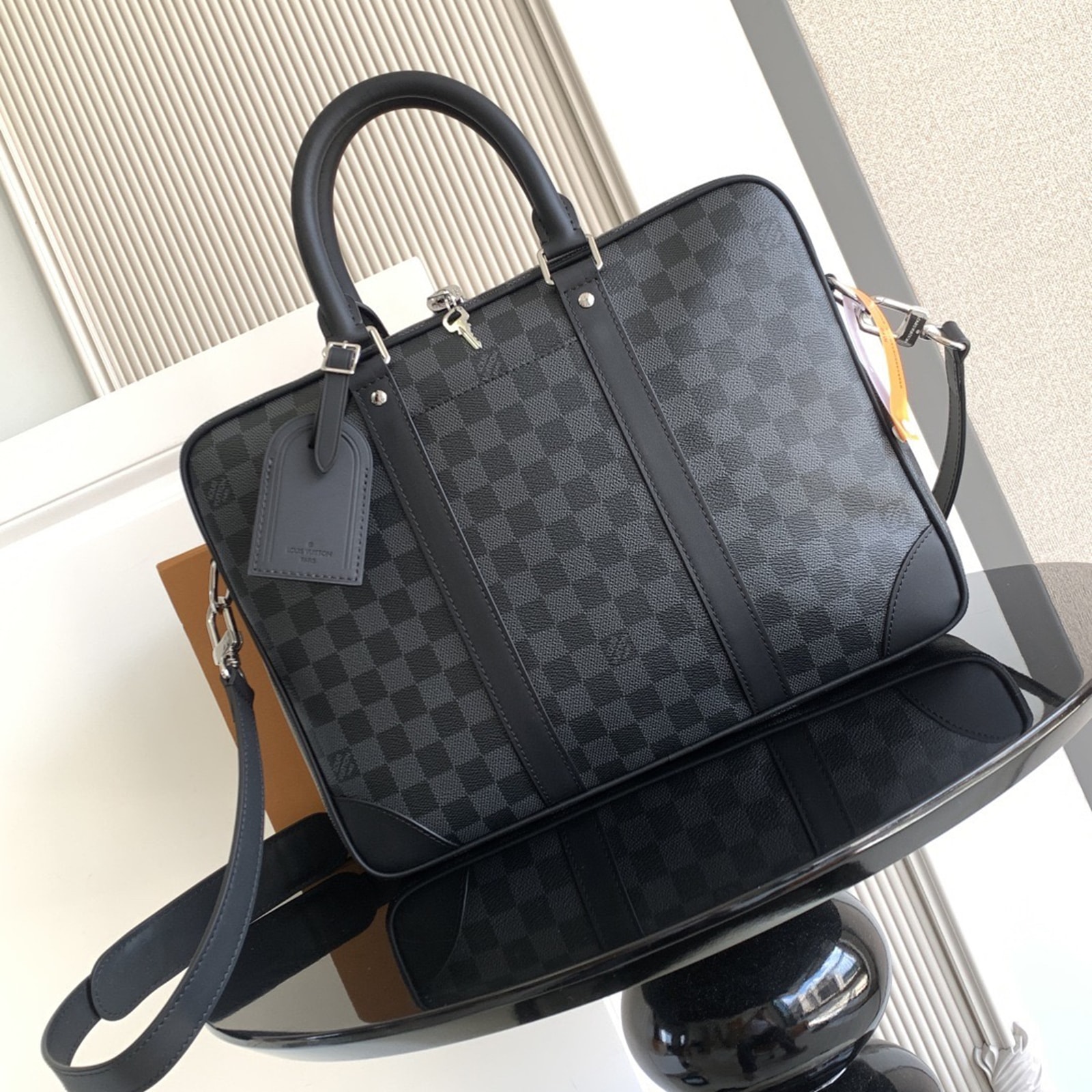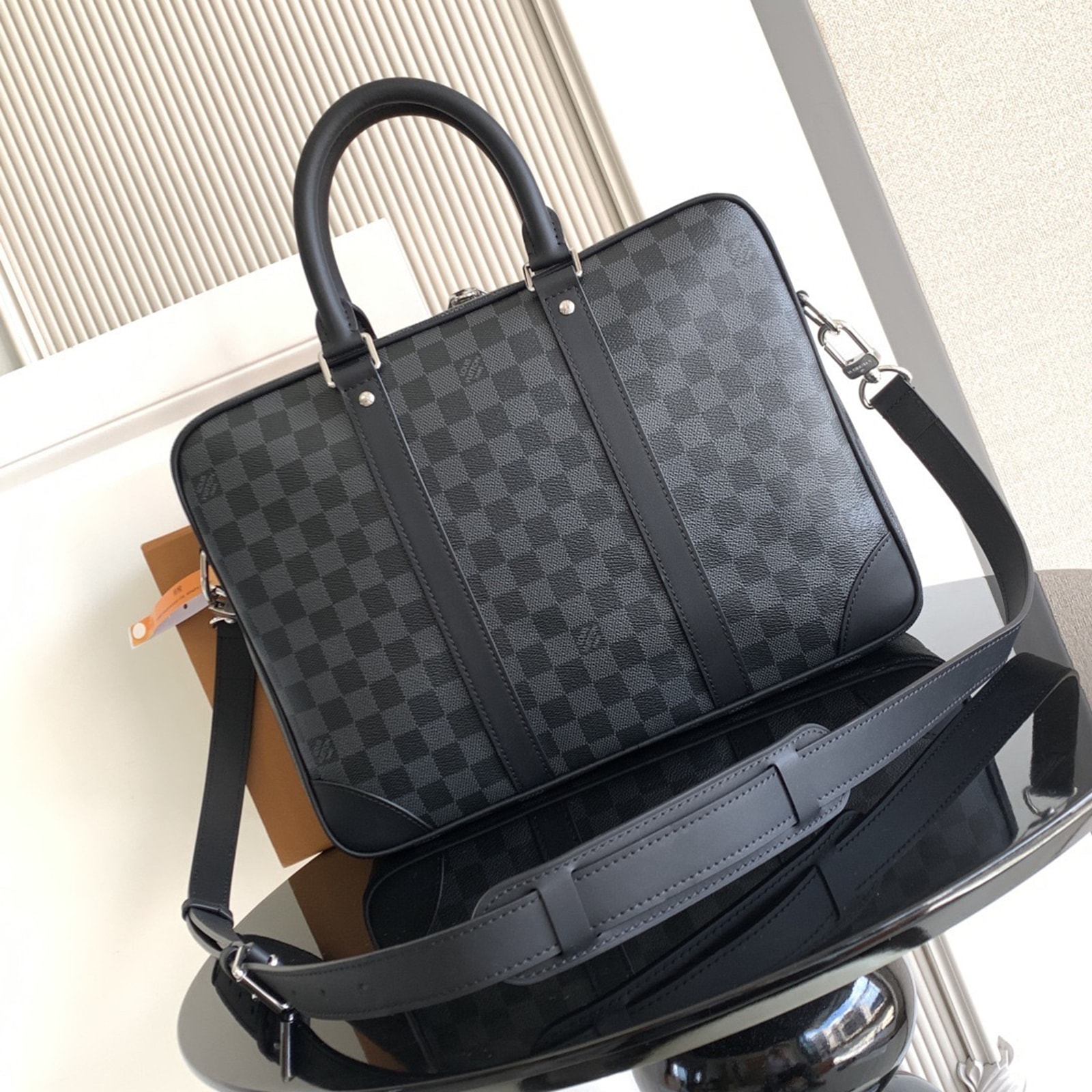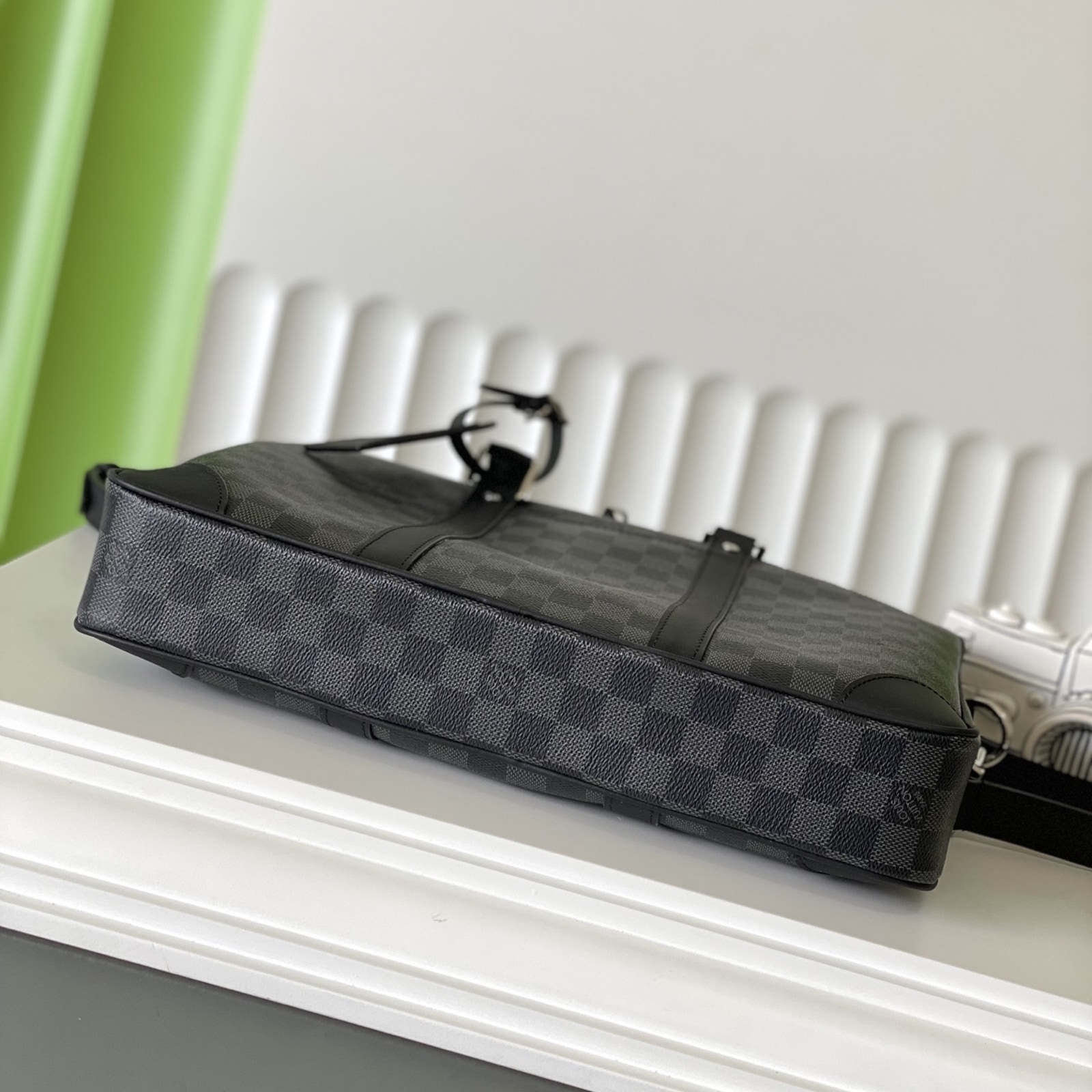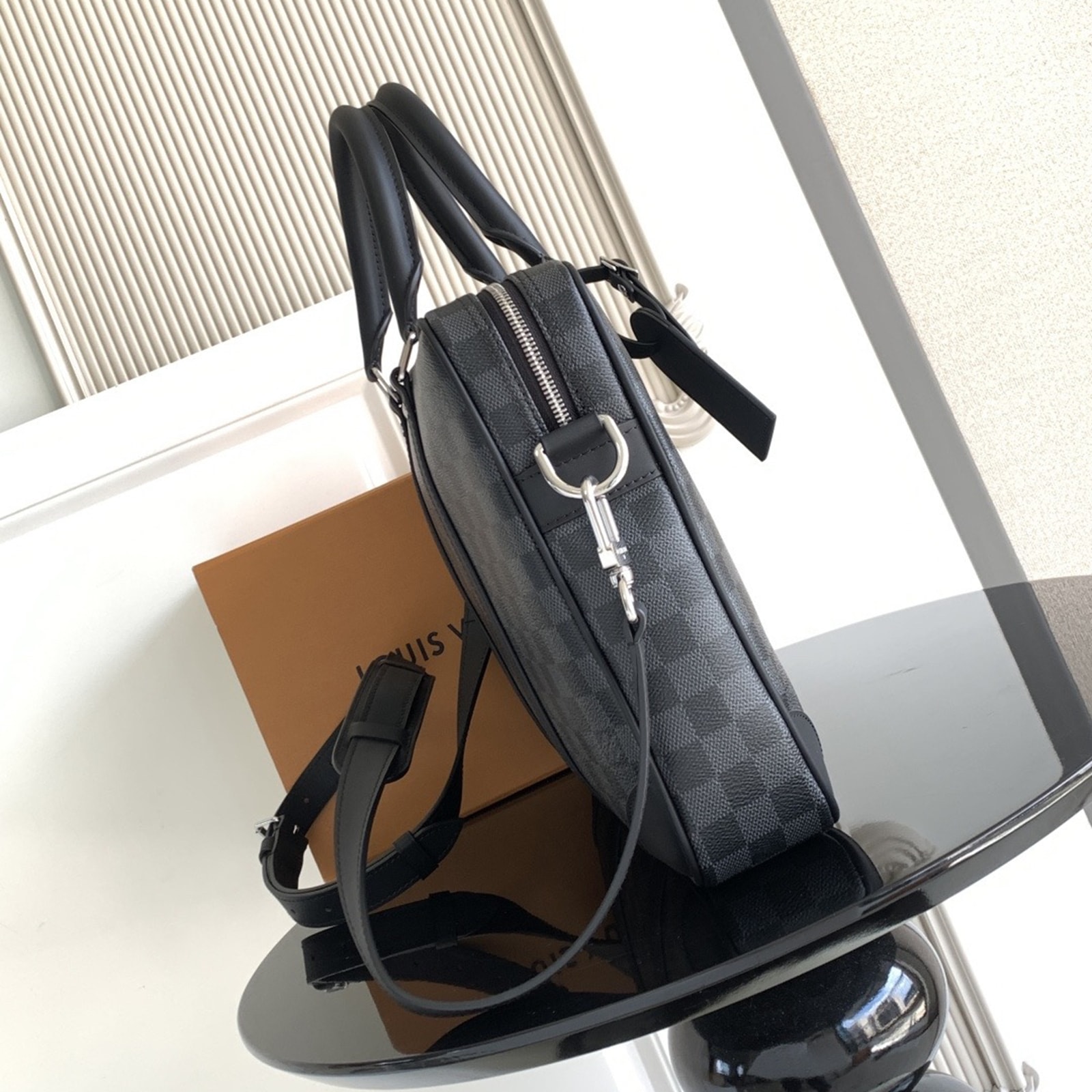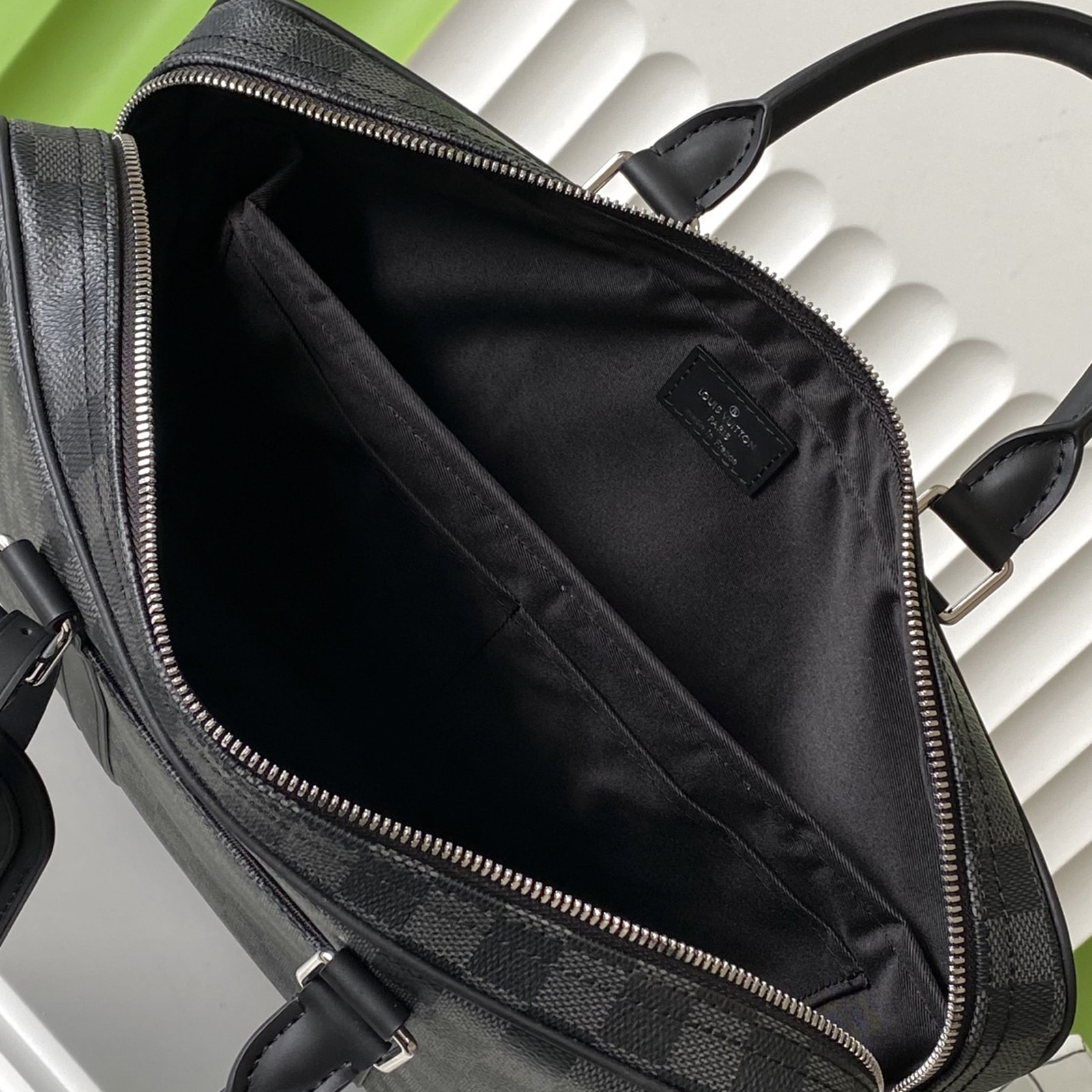36.5 x 27.5 x 6 cm (幅 x 高さ x マチ) 素材:ダミエ・グラフィット キャンバス トリミング:レザー(皮革の種類:牛革) ライニング:テキスタイル 金具(色:シルバー) ファスナー開閉式 取外し可能なラゲージタグ フロントにフラットポケット パッド入り内側コンパートメント 内フラットポケットx2 ストラップ:取り外し可能, 調整可能 ストラップの頂点からバッグ上部までの長さ(最短):44.0 cm ストラップの頂点からバッグ上部までの長さ(最長):55.0 cm ハンドル:ダブル