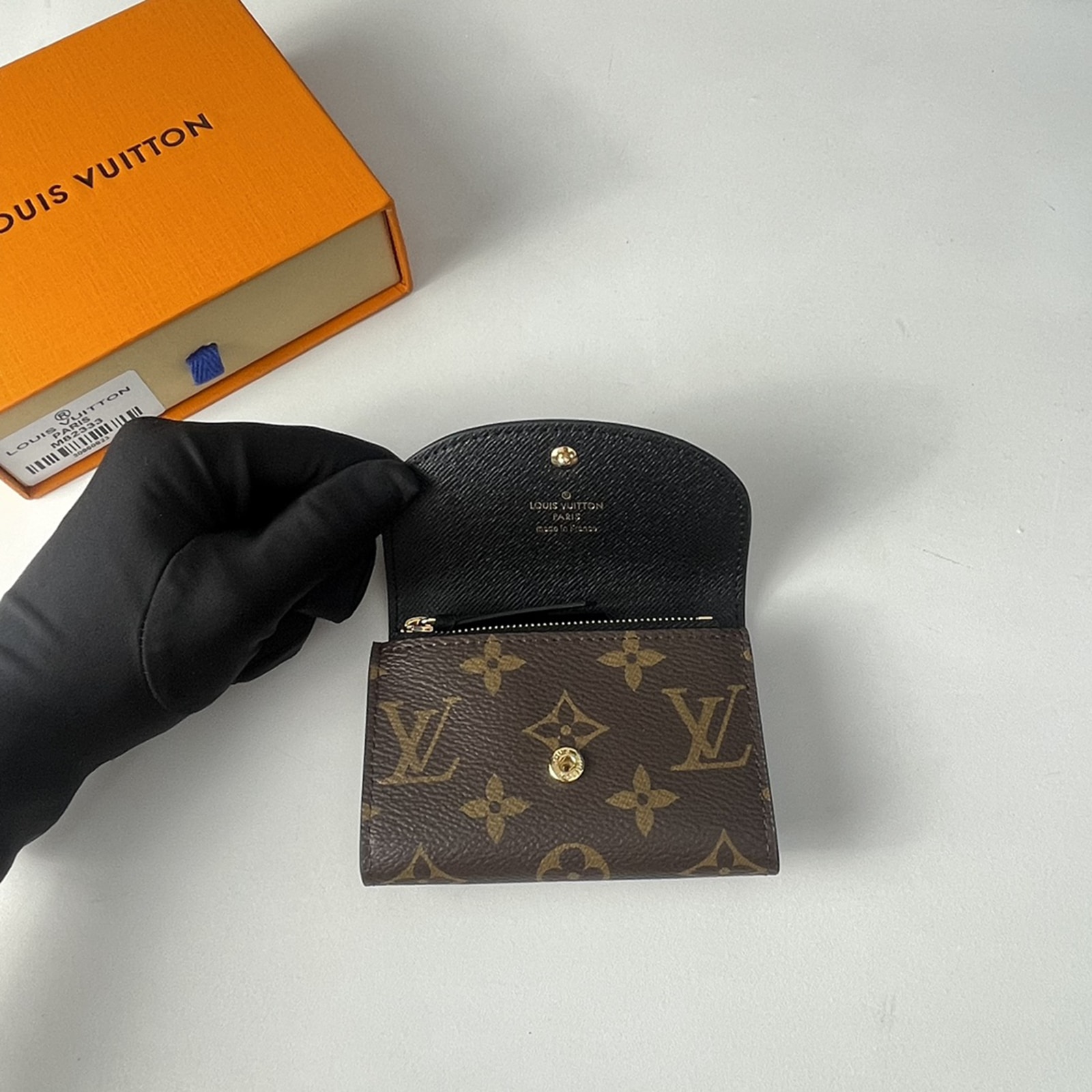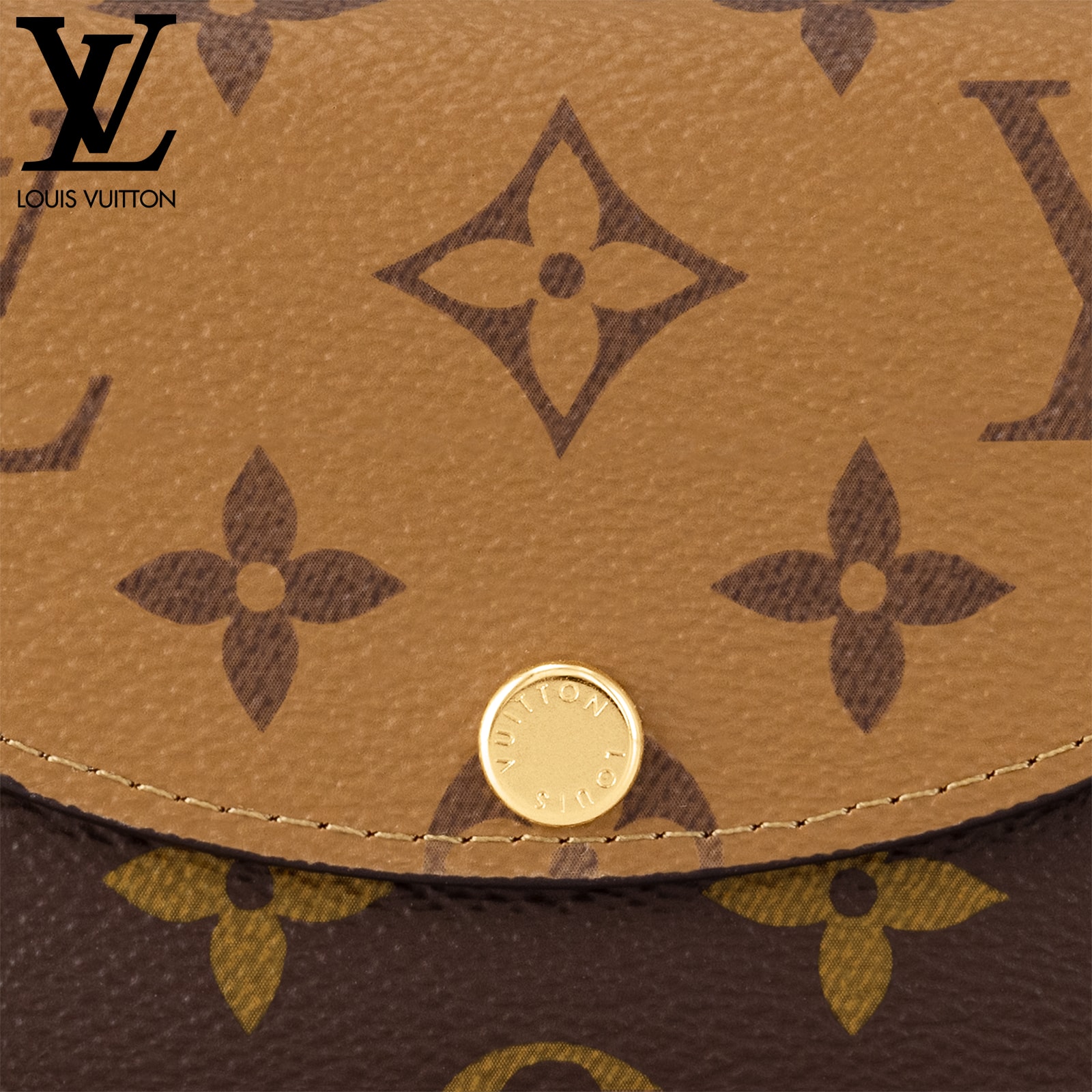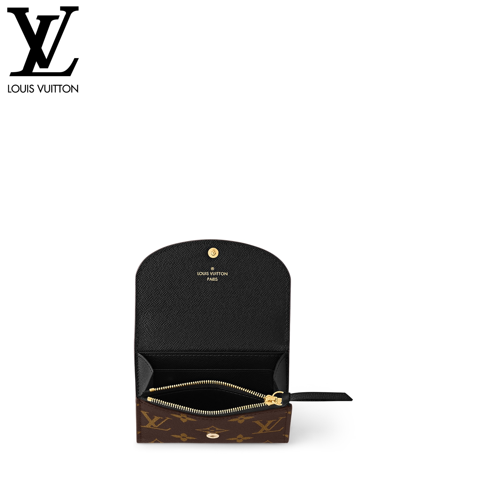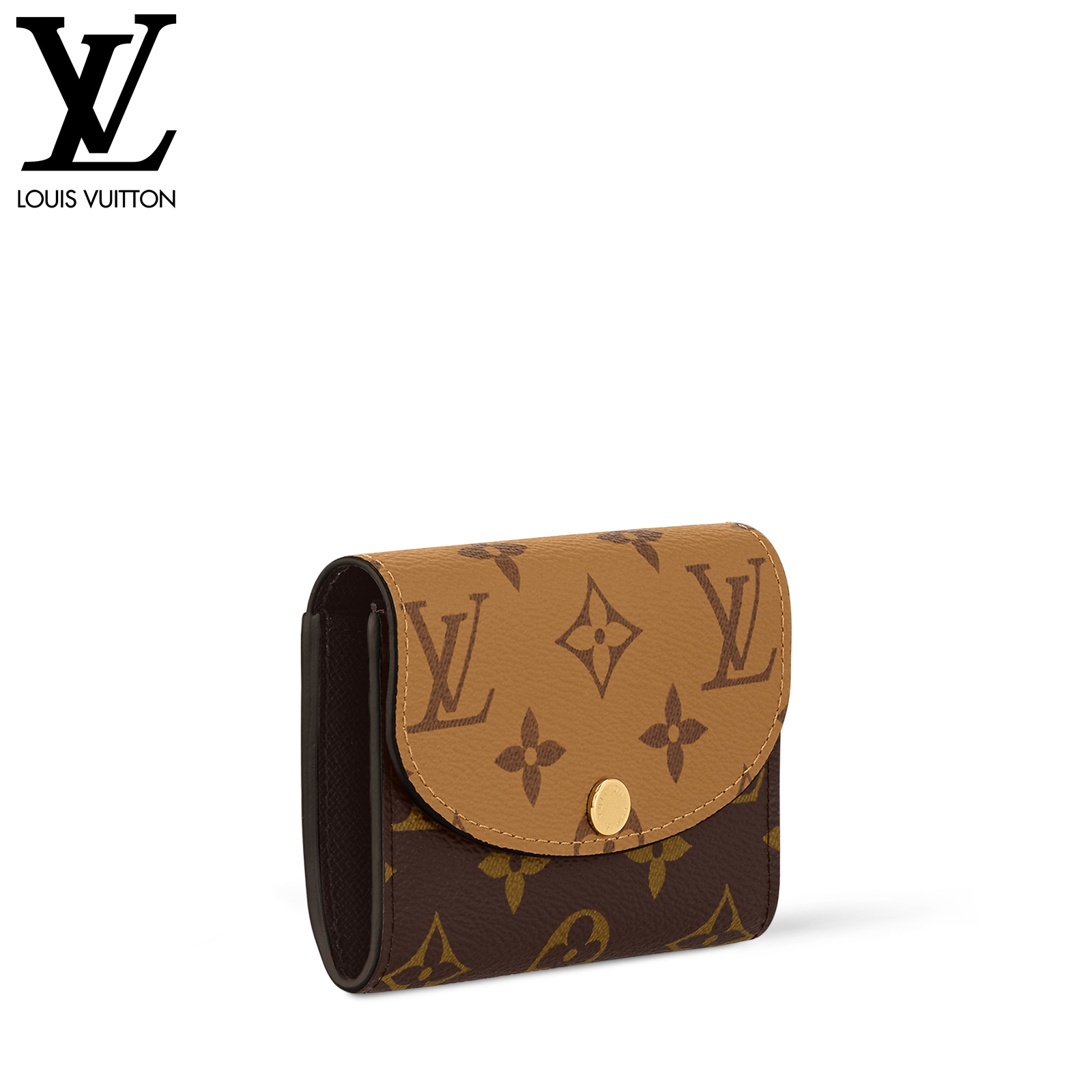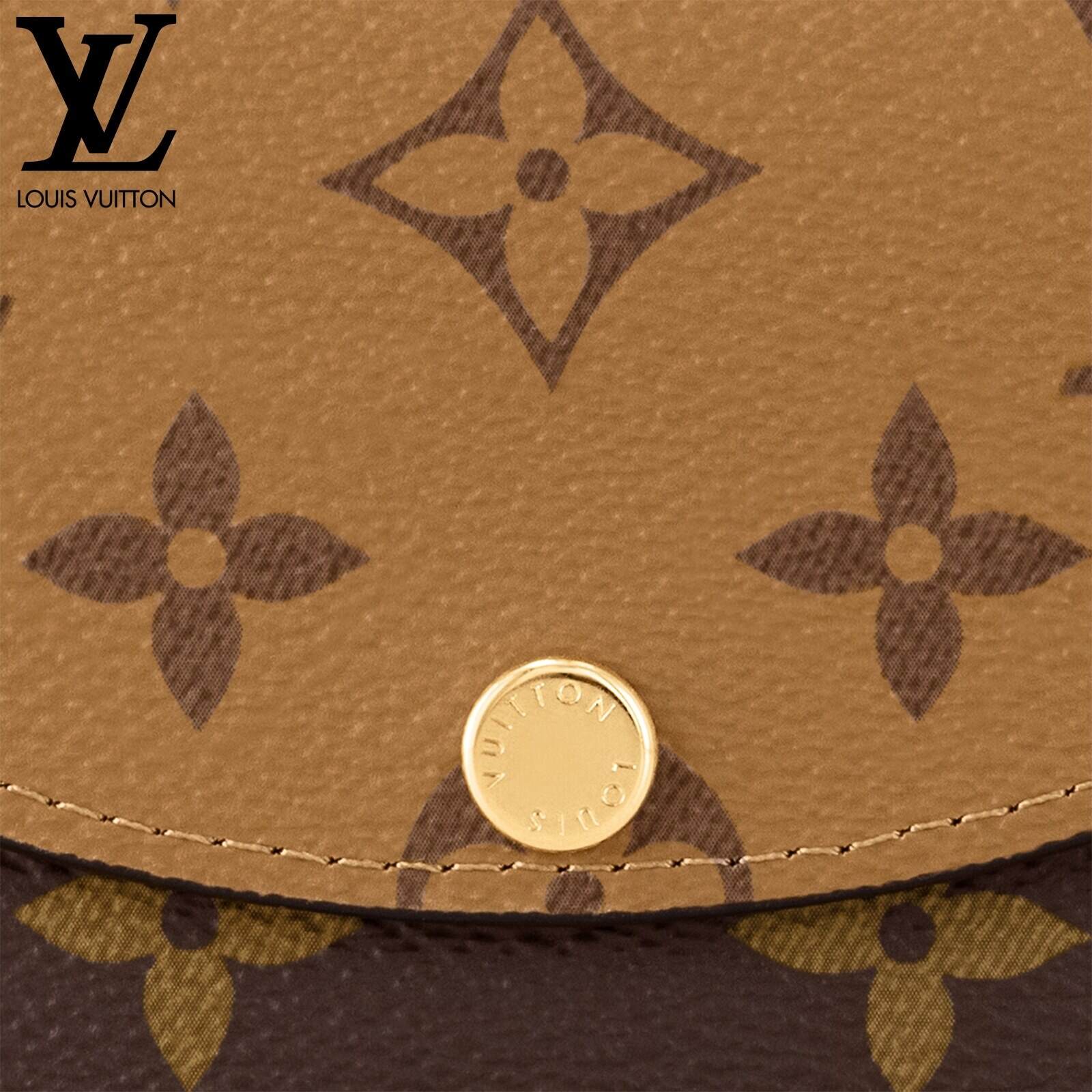 モノグラム & モノグラム・リバース キャンバスを組み合わせた、洗練された個性を放つ「ポルトモネ・ロザリ」。丸みを帯びたフラップに、刻印を施したゴールドカラーのスナップボタンをあしらった、小ぶりの財布です。内側にはフラットポケット、ファスナー付きコインポケット、2つのカードスロットを備え、背面にはフラットポケットが配されています。