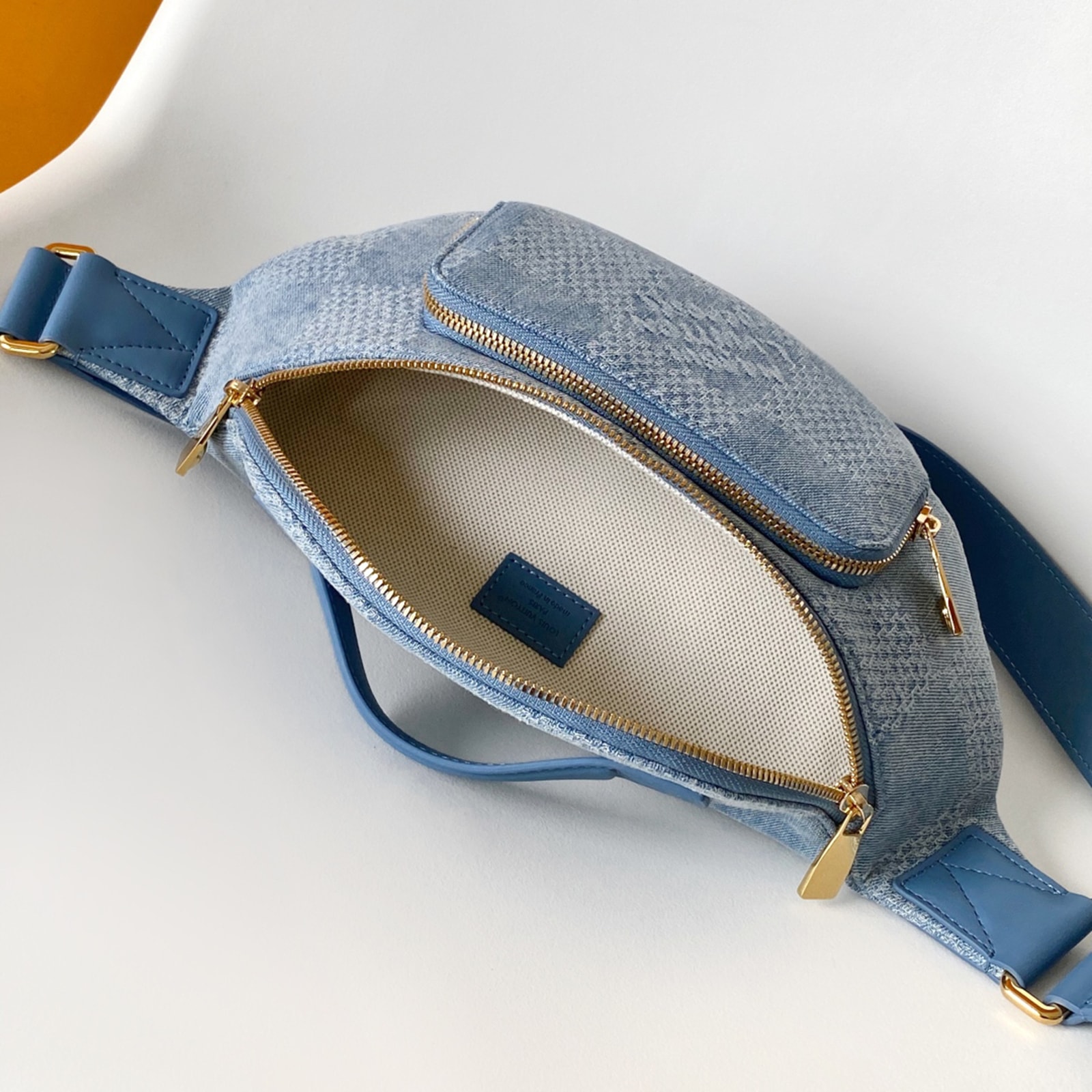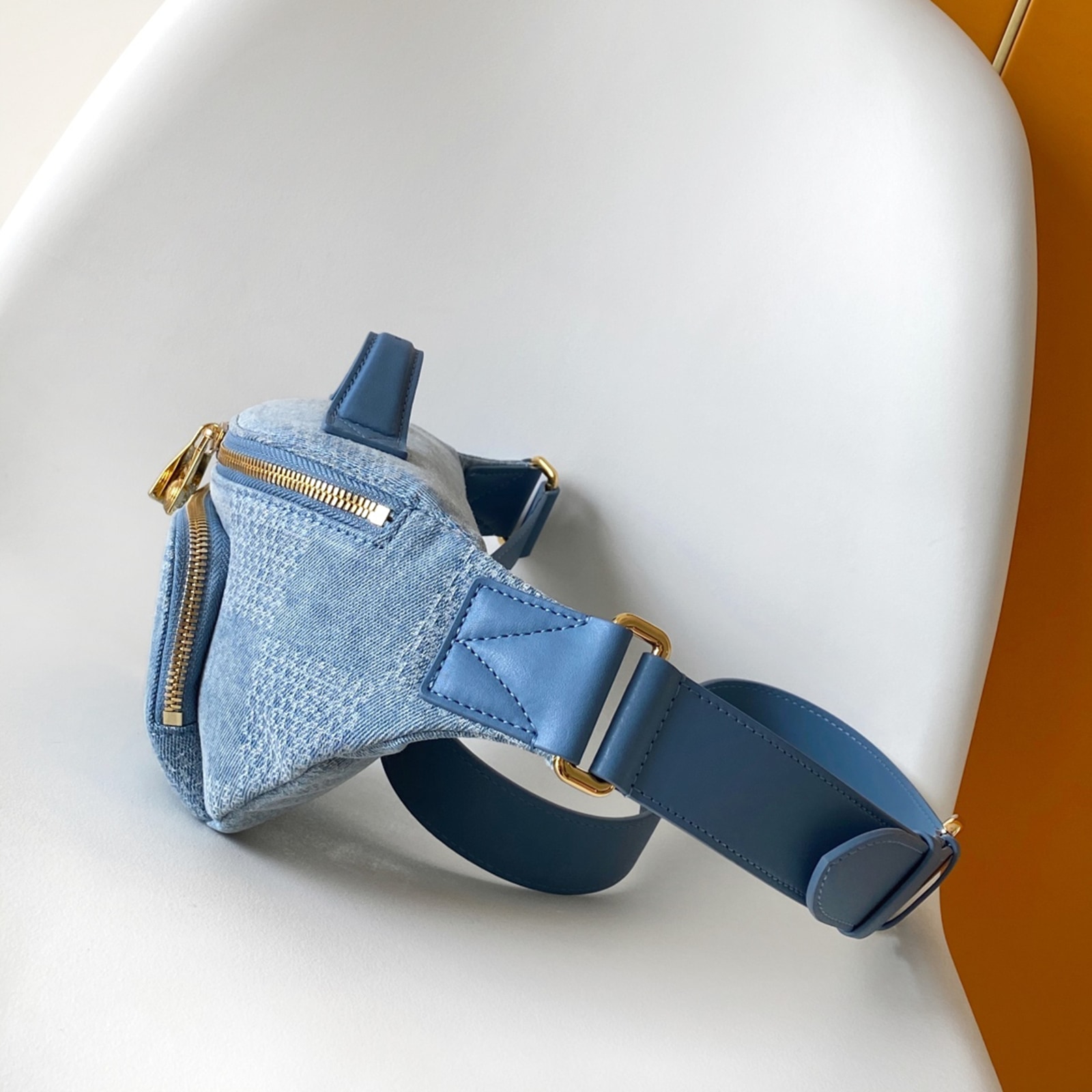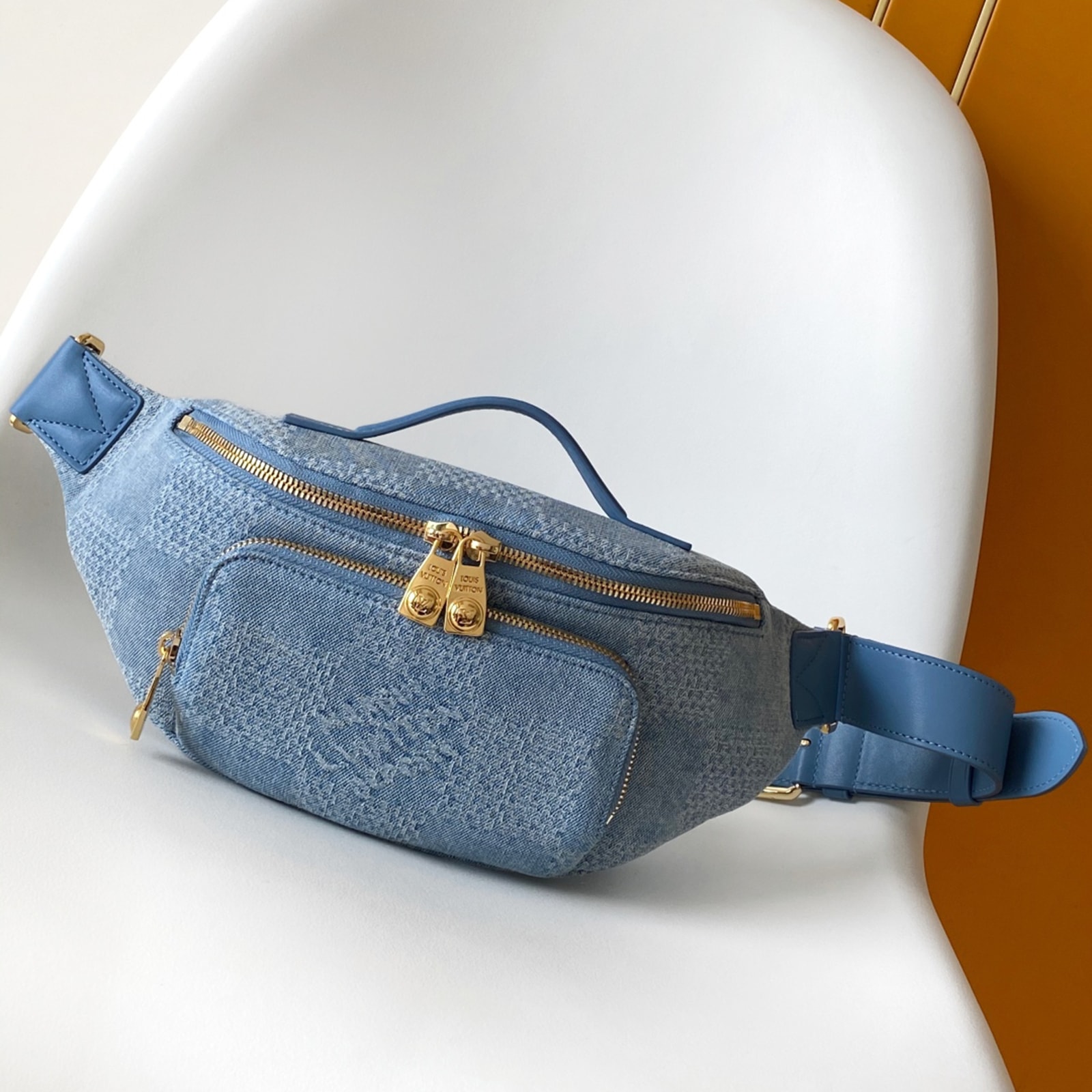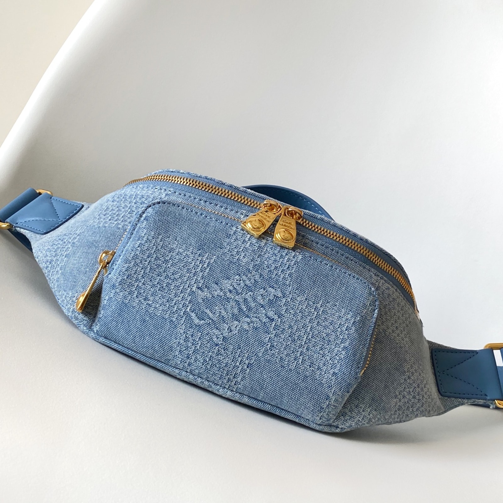 ダミエ・デニム 3D コットンキャンバスにゴールドカラーの金具を合わせた、普段の必需品の収納に最適な「ラッシュ・バムバッグ」。ファレル・ウィリアムスならではのパール風インサート付きのファスナー引き手をはじめとしたディテールが、メゾンを象徴するダミエ・モチーフから着想を得たオーバーサイズのチェック・パターンを引き立てます。調節可能なストラップで、ウエストキャリーやショルダーキャリー、クロスボディキャリーとしても快適に使えるアイテム。