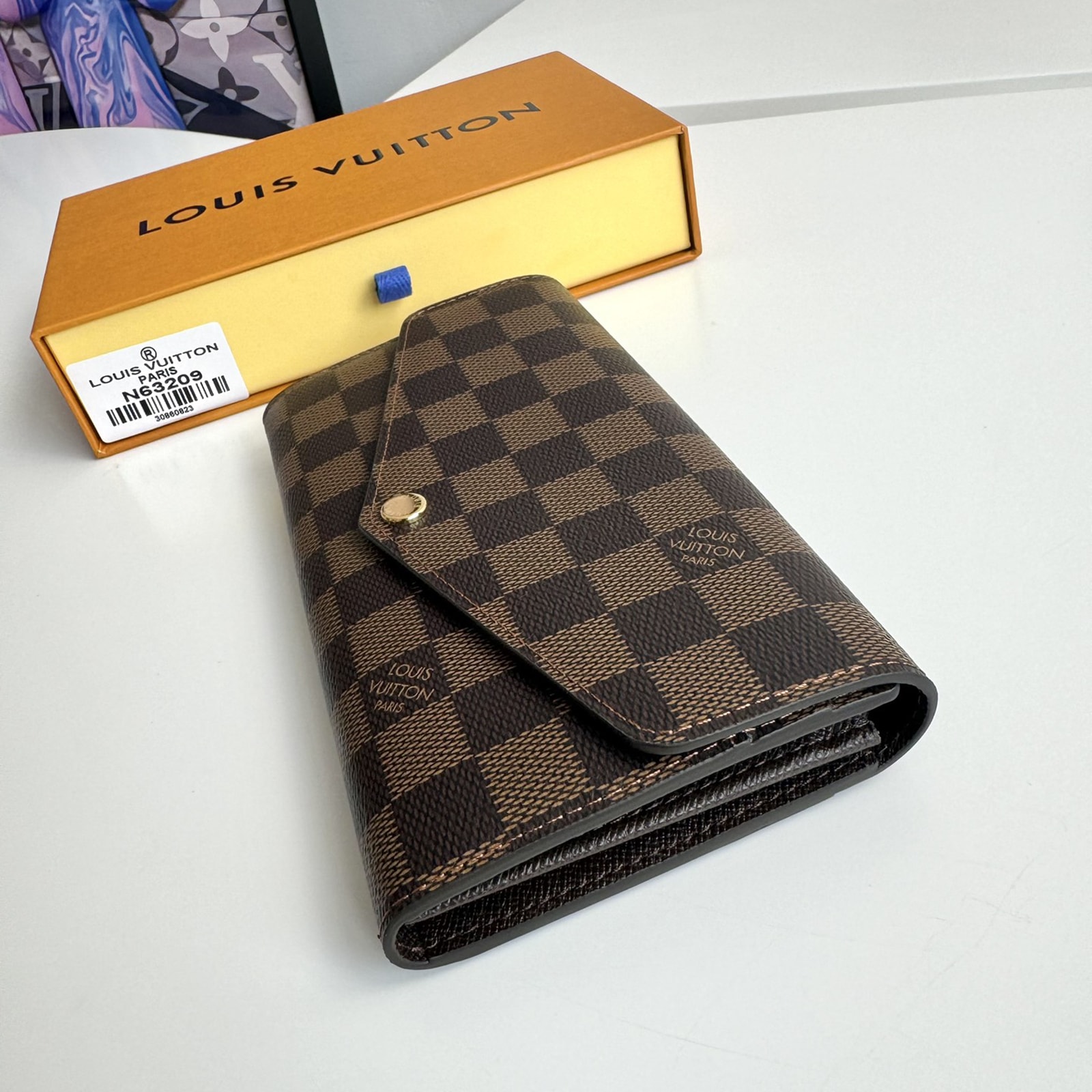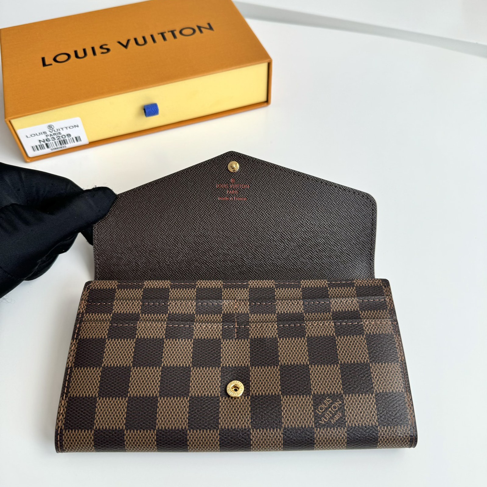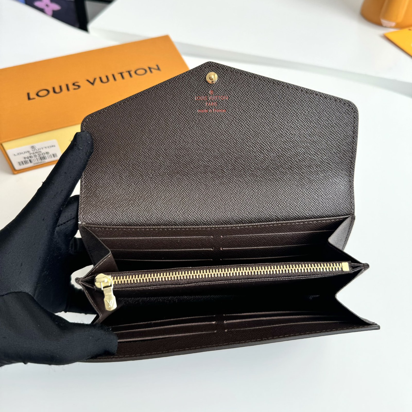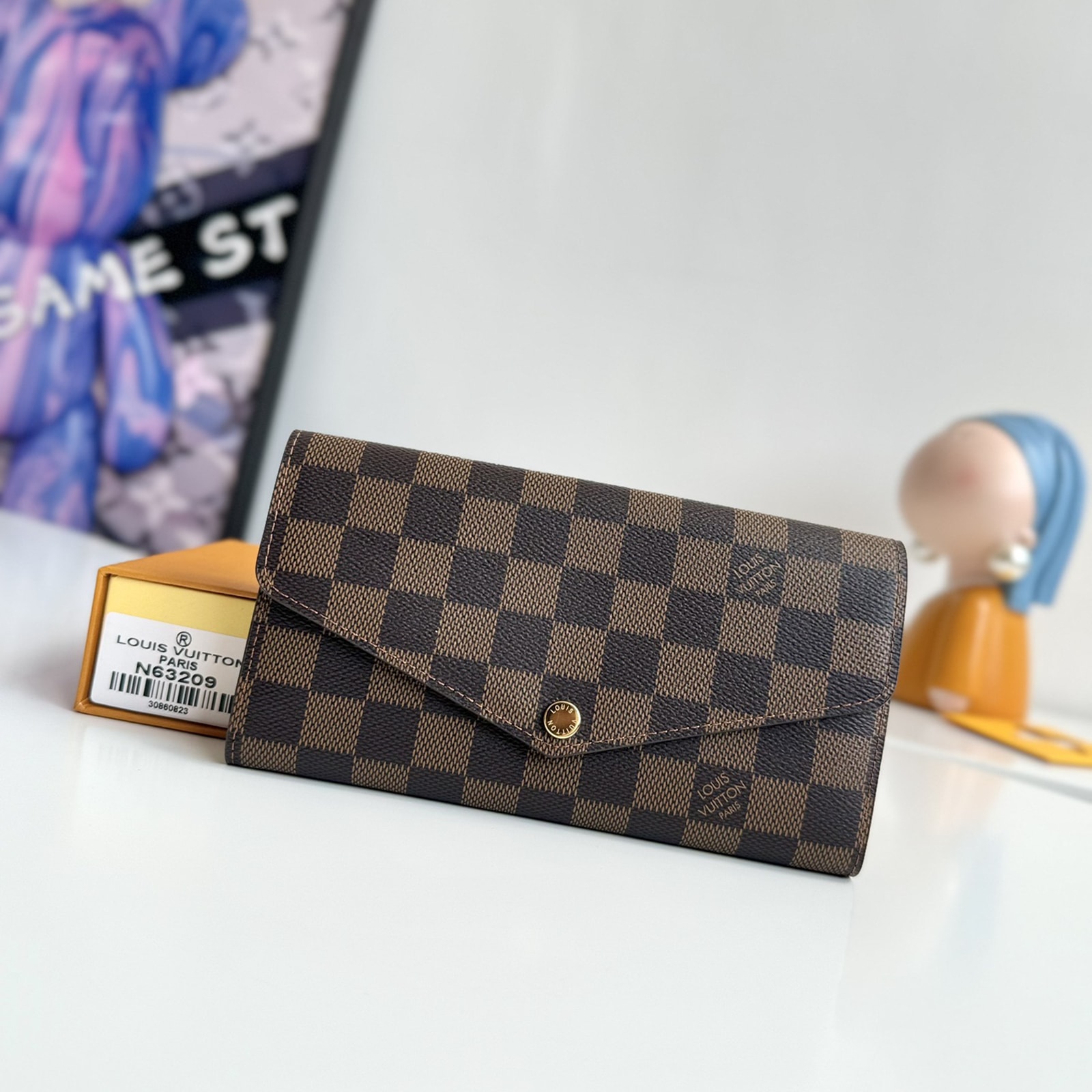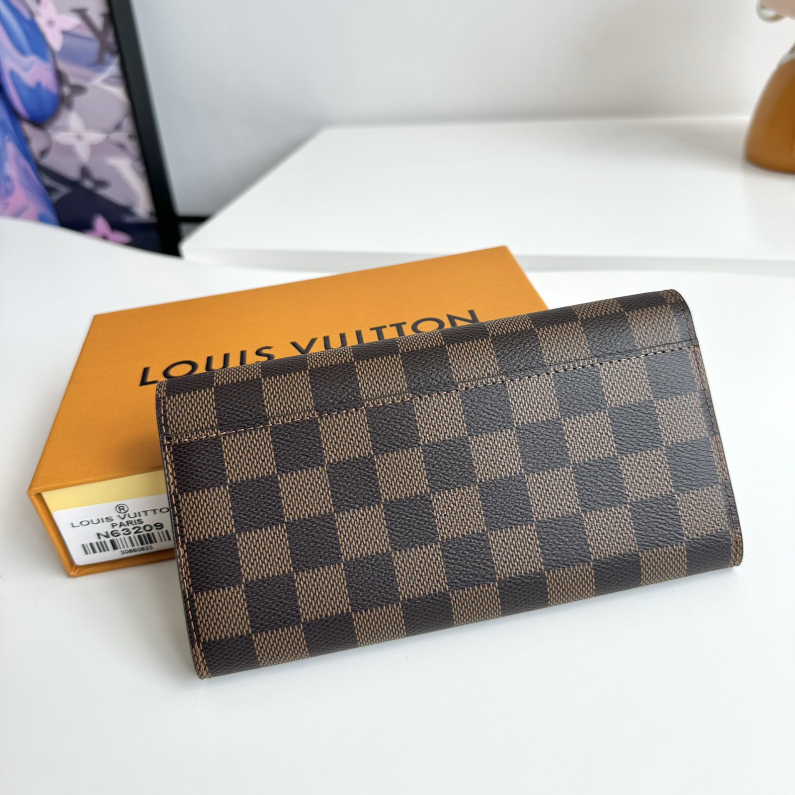ルイ・ヴィトンの伝統的なダミエ・キャンバスにグレインレザーのライニングを合わせたポルトフォイユ・サラ」。2つの充分な容量のコンパートメント、ファスナー付きコインポケット、複数のカードスロットを備えた機能性と、フェミニンな印象を併せ持つ定番アイテムです。エンヴェロップ型のフラップには、刻印を施したゴールドカラーのスナップをあしらいました。