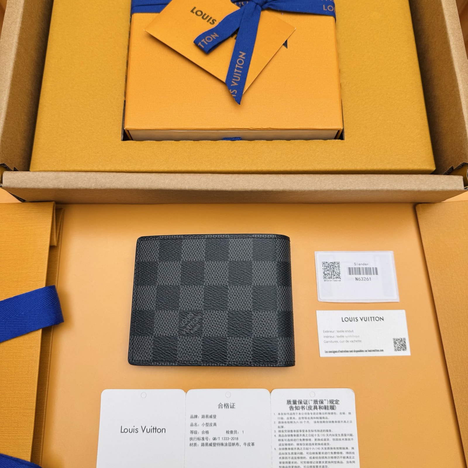 「スレンダー」の名の通りスリムなデザイン。マスキュリンなダミエ・グラフィット・キャンバスの財布はその名に相応しく、コンパクトですっきりした作りが特徴で、必需品をすべて収納しても前ポケットや後ろポケットに簡単に収まります。
