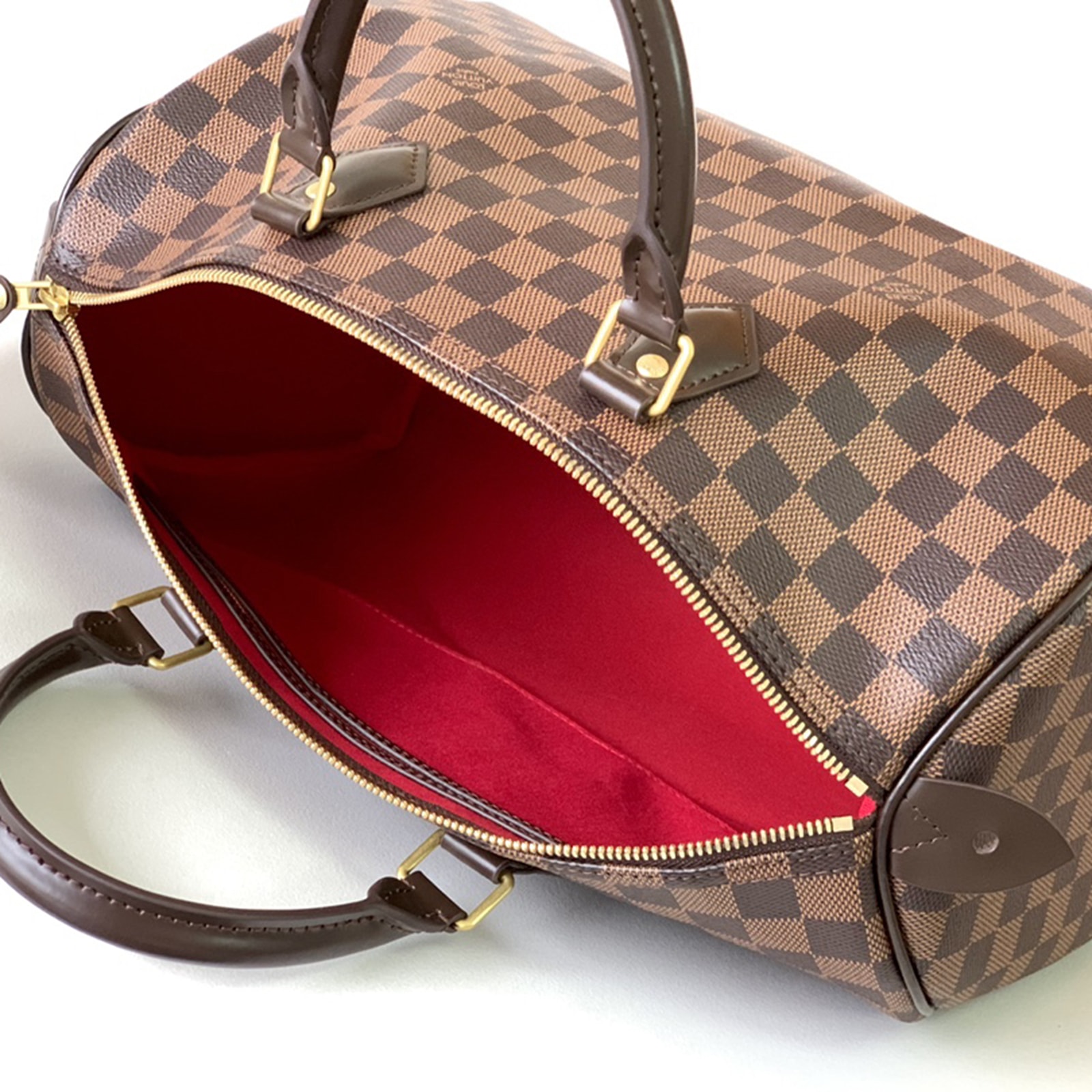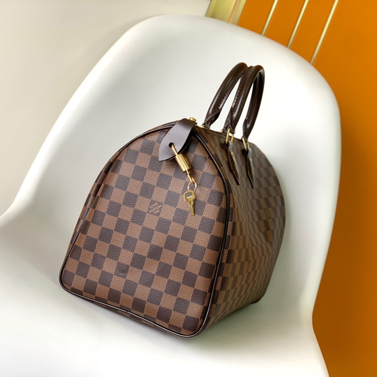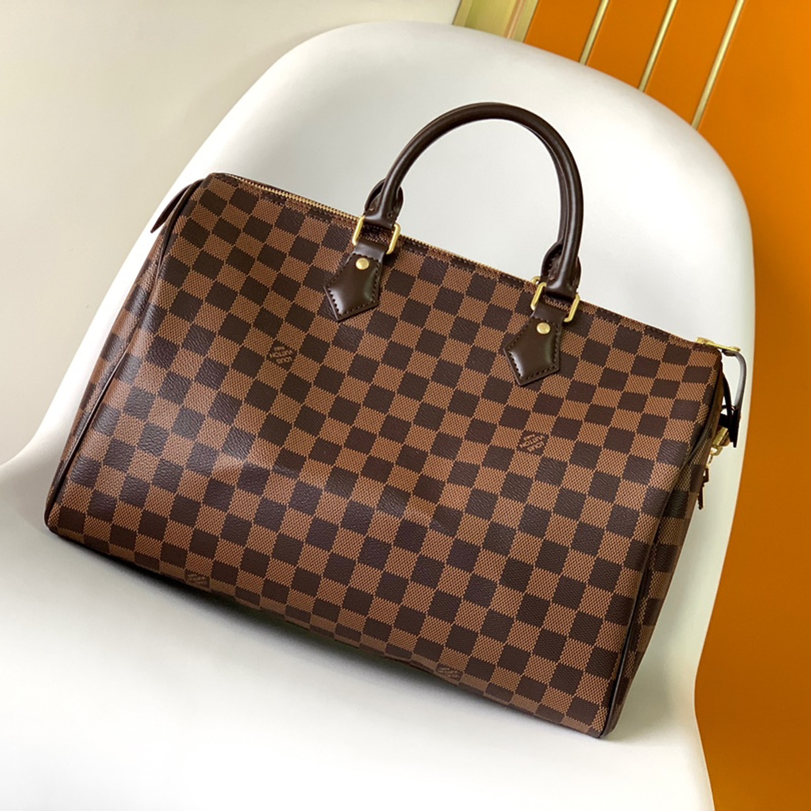 旅行や日常生活をスタイリッシュに彩る「スピーディ 35」。エレガントなダミエ・キャンバスで仕上げました。移動手段の加速化に伴い、1930年に誕生したバッグ「エクスプレス」。そのアップデートバージョンである「スピーディ」は、一目でそれと分かる独特のシルエット、ロール仕上げのレザーハンドル、シグネチャーを刻印したパドロックに、メゾンのタイムレスなアイコンの名残を留めます。本製品は折り畳んだ状態でお届けいたします。これは、メゾンを象徴する折り畳んでトランクに収納できるソフトラゲージの伝統に由来するものです。予めご了承ください。