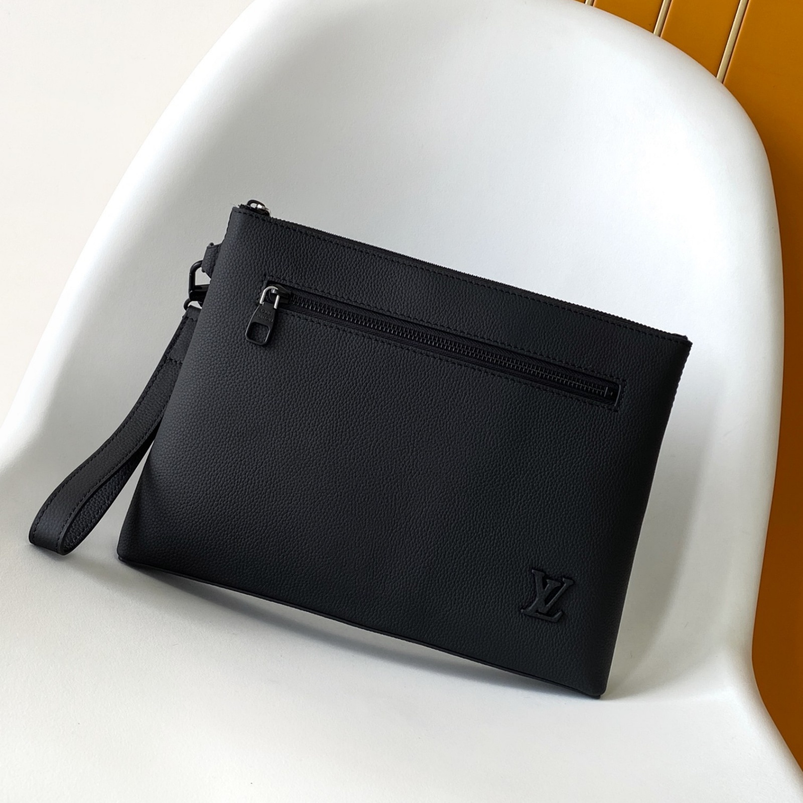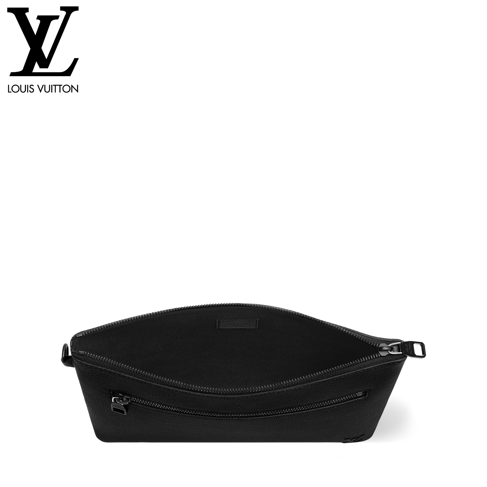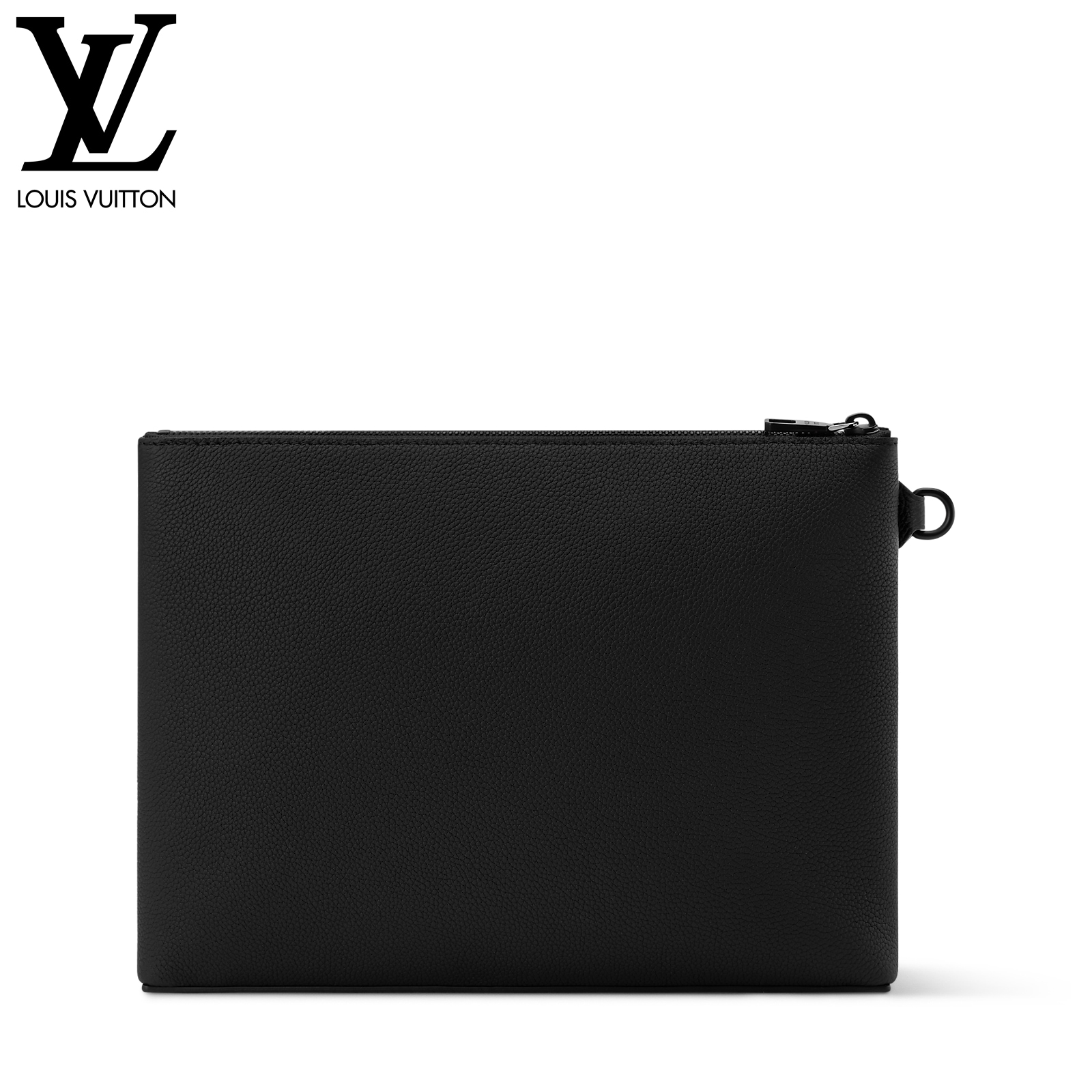 ワックス加工を施したようなレザーに、ブラックの金具と同系色のテキスタイルライニングを配した「テイクオフ・ポーチ」。タブレットをすっきり収納できる、オフィスやカジュアルなシーンにもぴったりの小ぶりなバッグです。前面のコーナーにはエレガントなLV イニシャルをエンボス加工であしらいました。取外し可能なリストストラップでさまざまな持ち方を楽しめます。