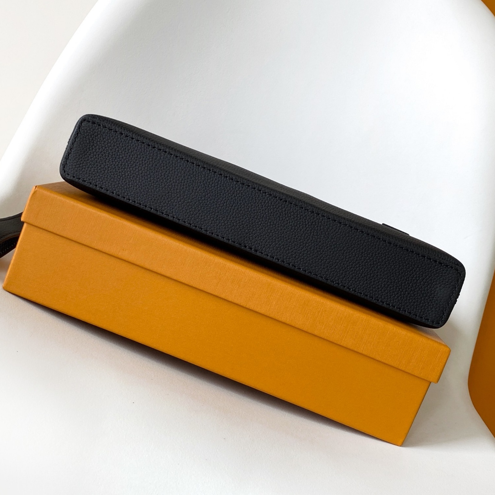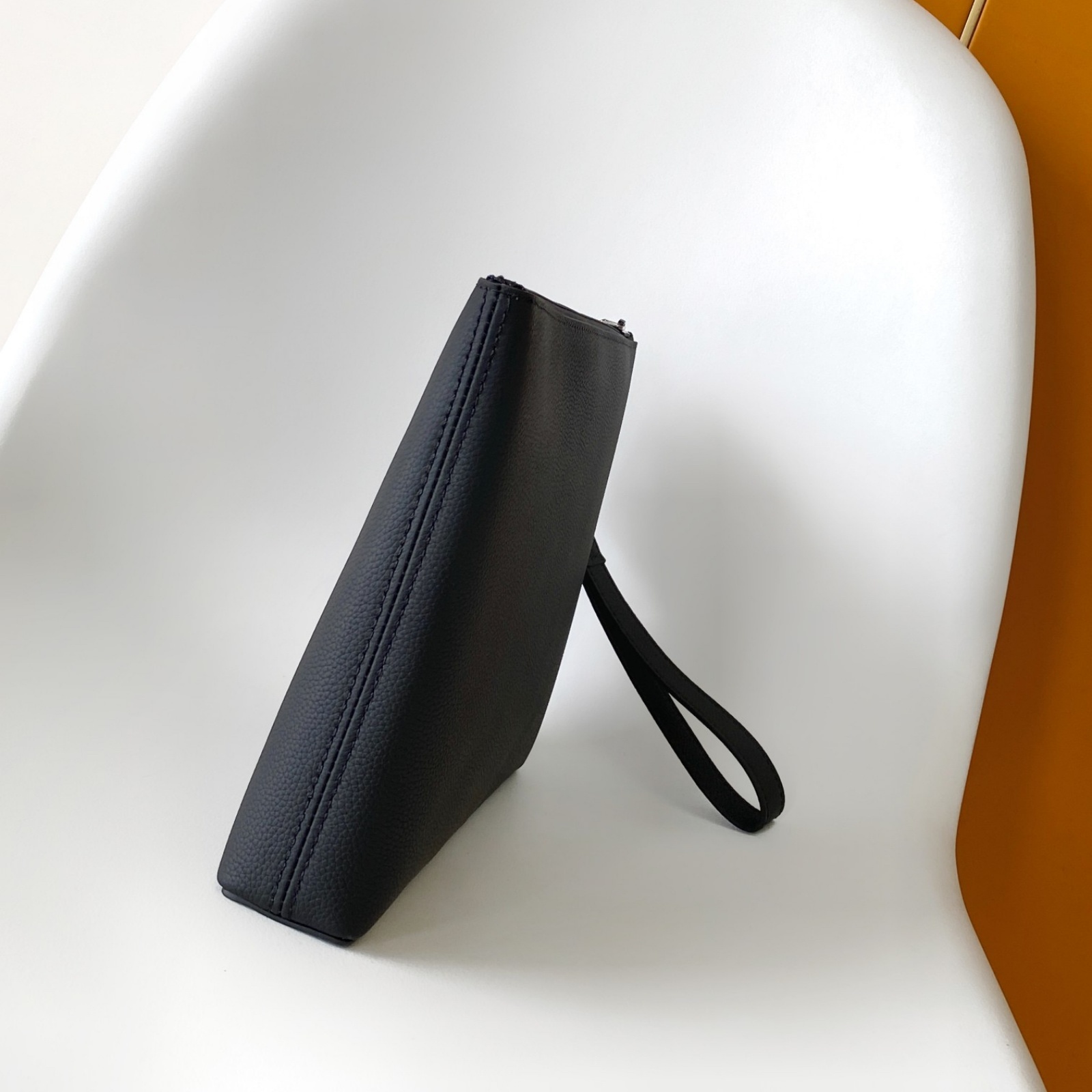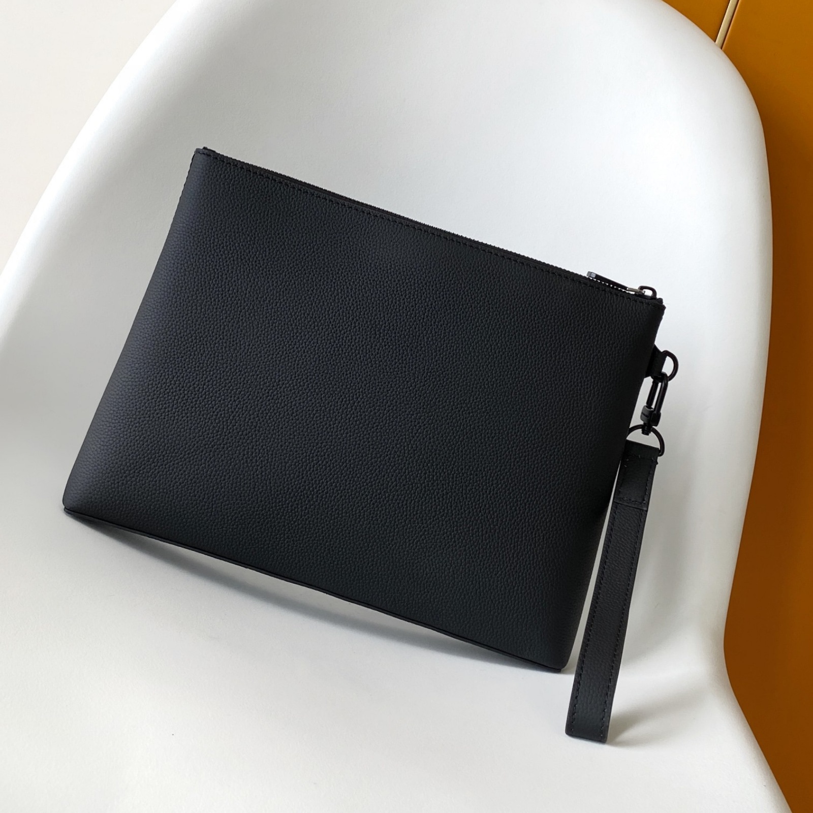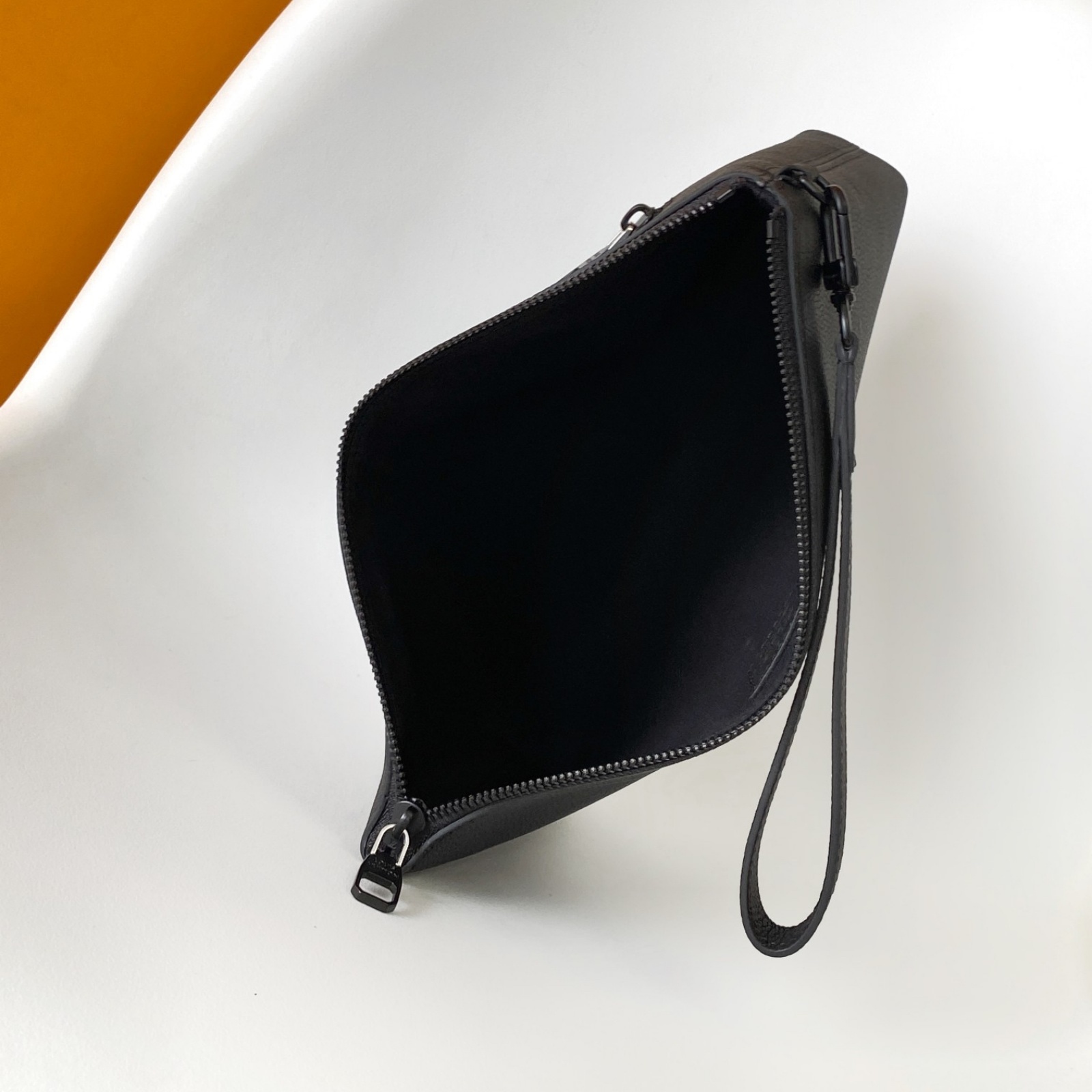 ワックス加工を施したようなレザーに、ブラックの金具と同系色のテキスタイルライニングを配した「テイクオフ・ポーチ」。タブレットをすっきり収納できる、オフィスやカジュアルなシーンにもぴったりの小ぶりなバッグです。前面のコーナーにはエレガントなLV イニシャルをエンボス加工であしらいました。取外し可能なリストストラップでさまざまな持ち方を楽しめます。