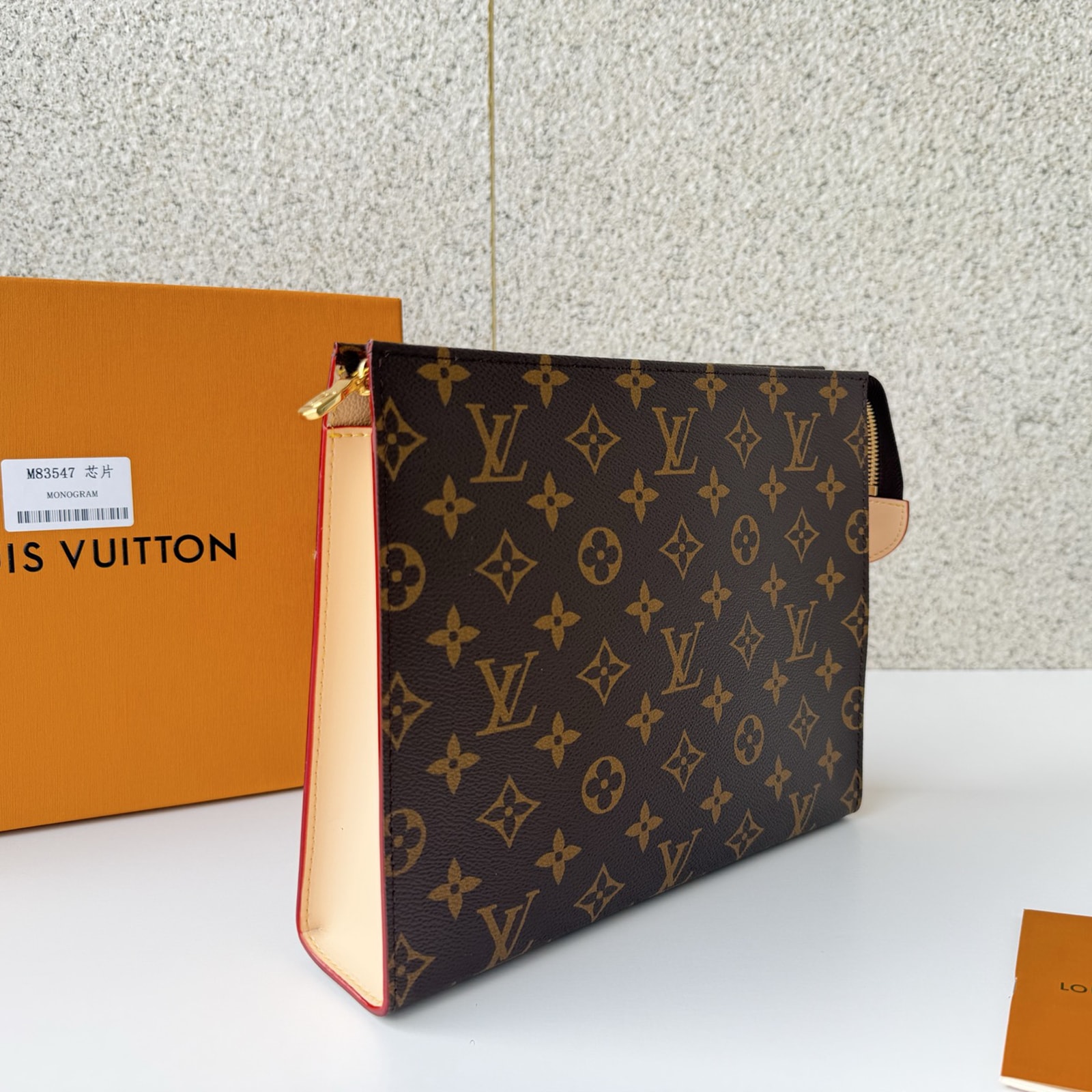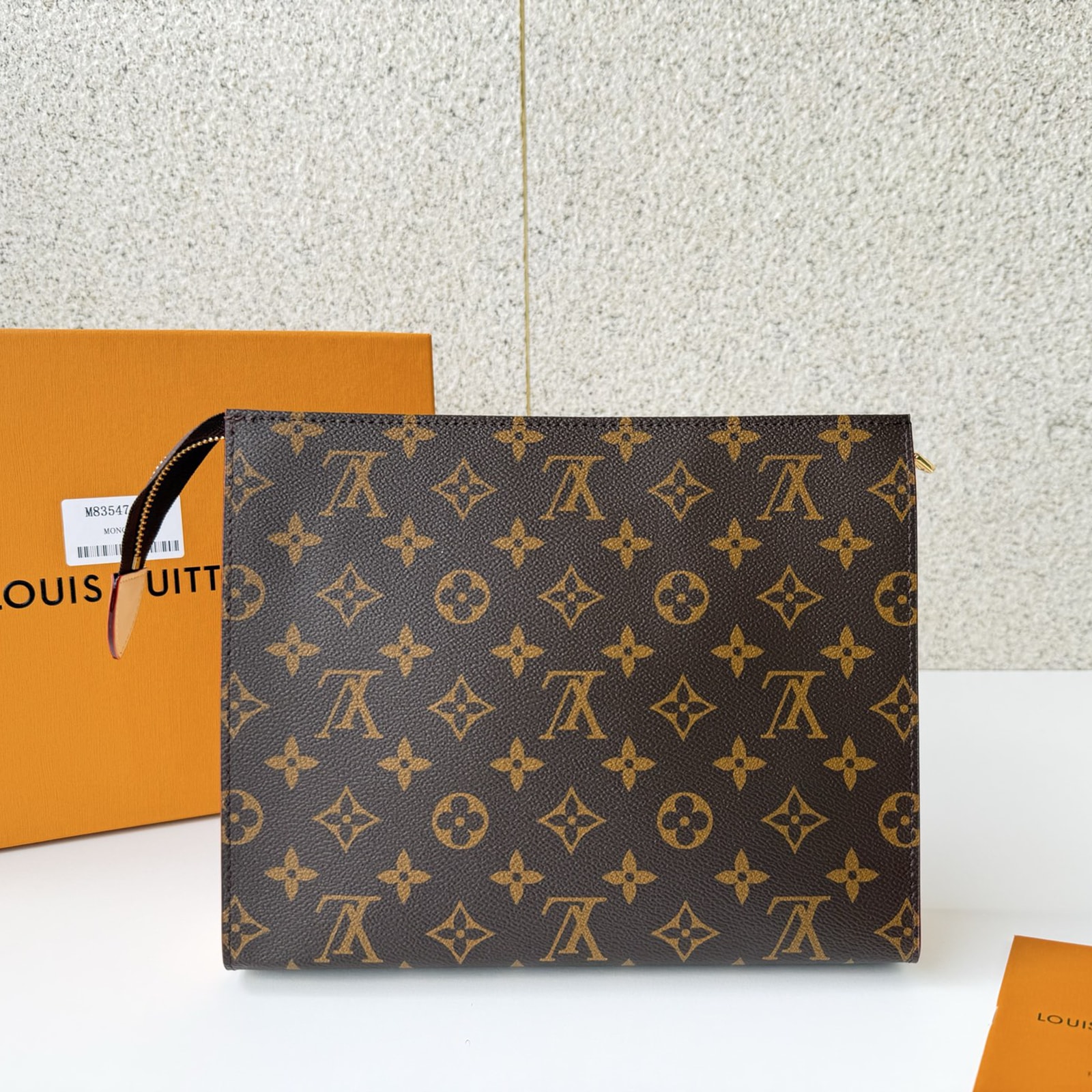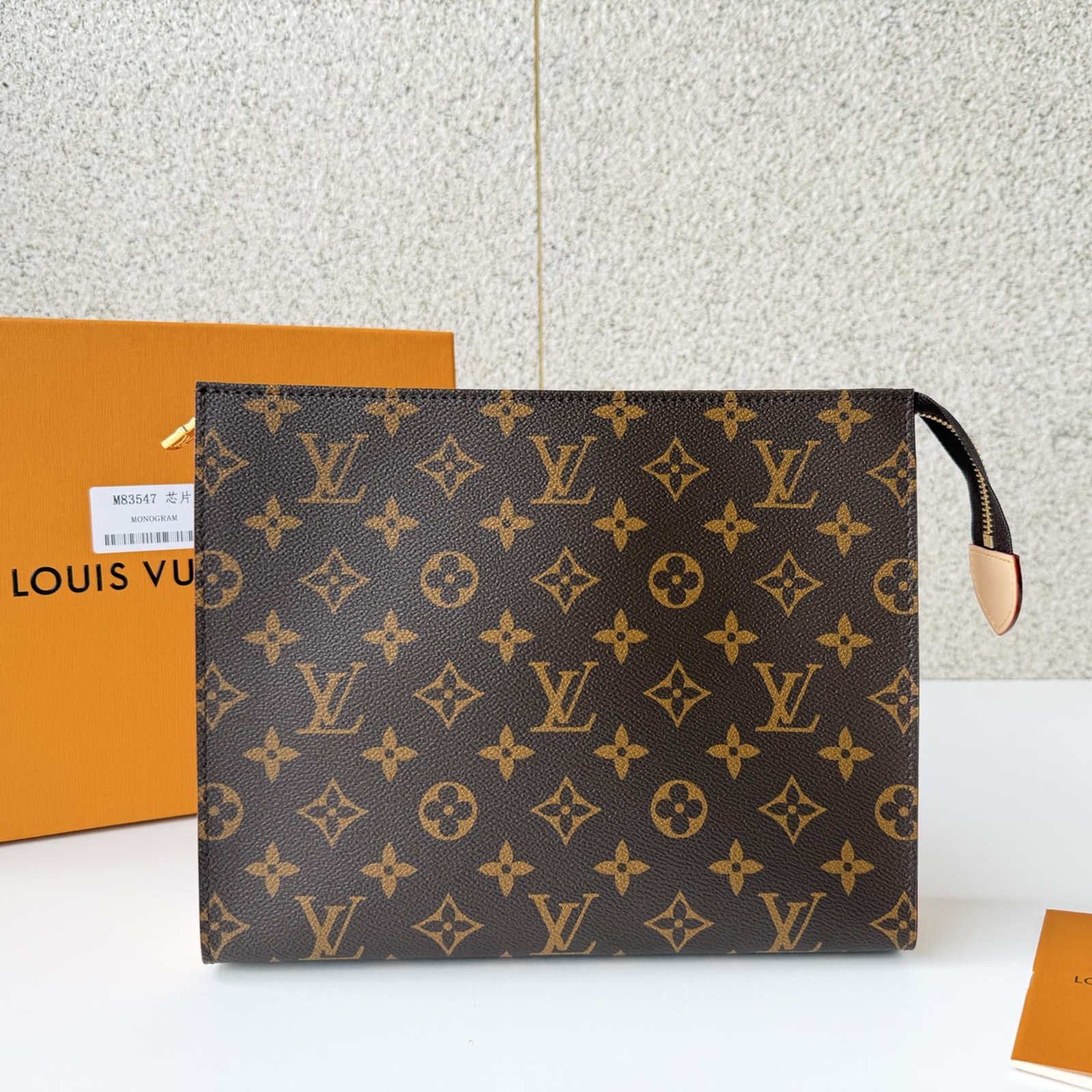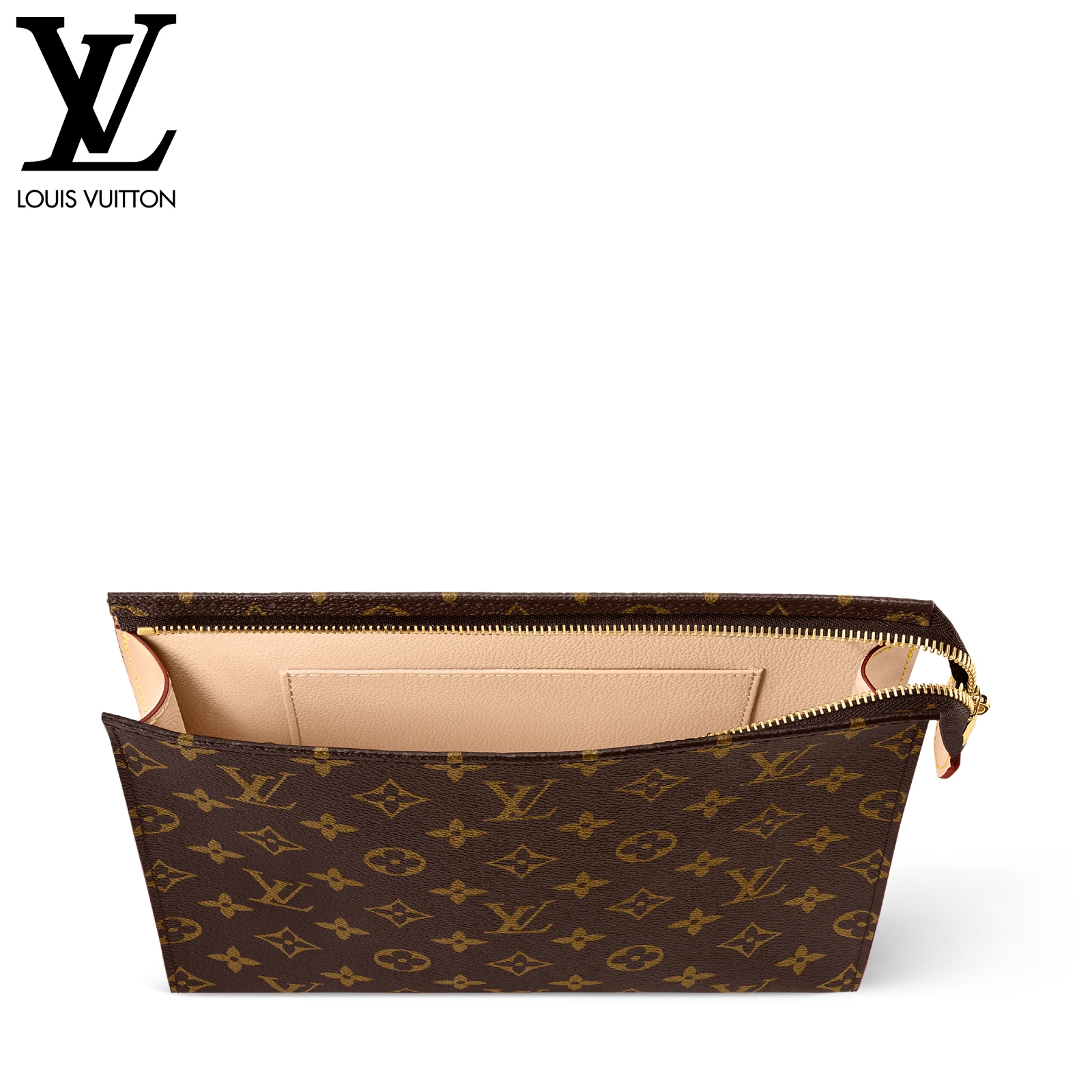 モノグラム・キャンバスにヌメ革のトリミングを施した「ポッシュ・トワレ」。身だしなみ用品を持ち運ぶだけでなくバッグインバッグとしても楽しめます。4つのカードスロットと書類用のパッチポケットを備えた必需品をスタイリッシュに持ち運べる独創的なデザインが魅力。