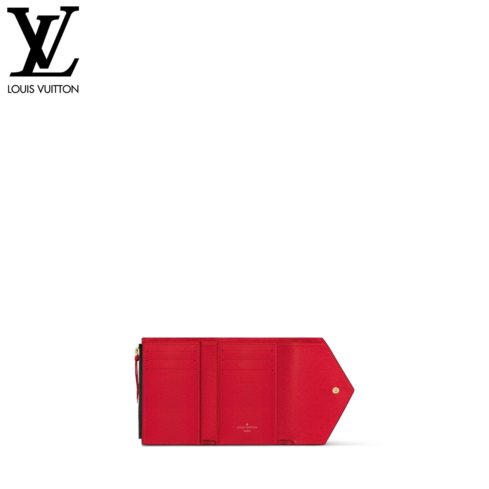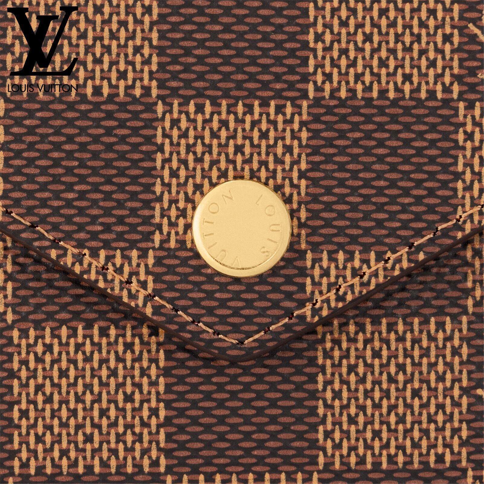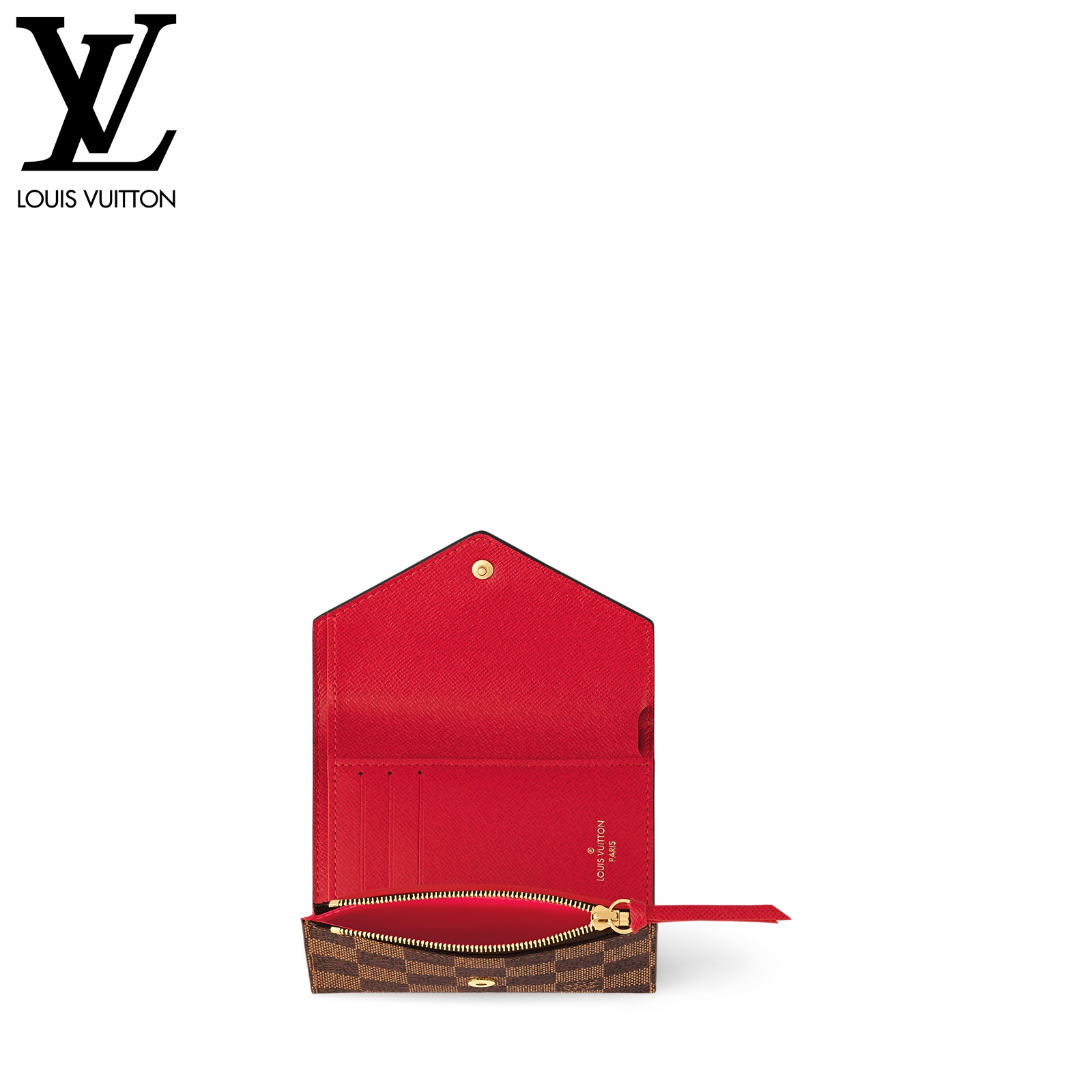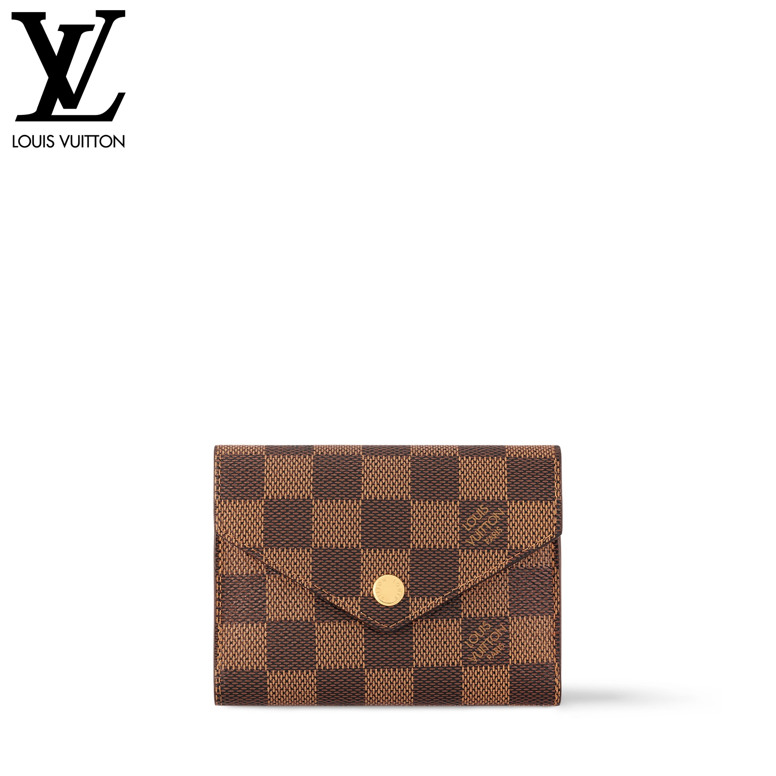 ダミエ・キャンバスで仕立てた「ポルトフォイユ・ヴィクトリーヌ」。エンヴェロップ型のコンパクトなデザインに、紙幣用ポケットとクレジットカードスロット、サイドのファスナー付きコインポケットなどの実用的な機能を散りばめました。グレインレザーのライニングがフェミニンな印象を添えます。