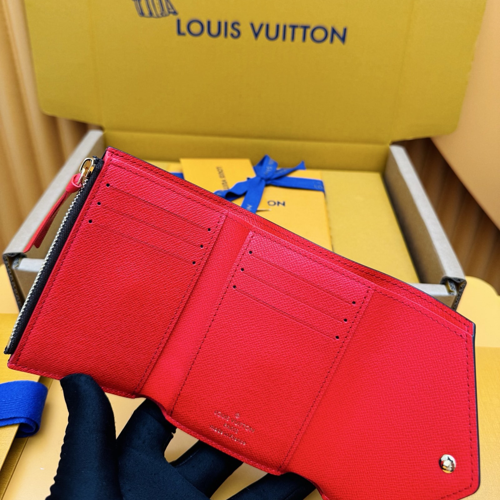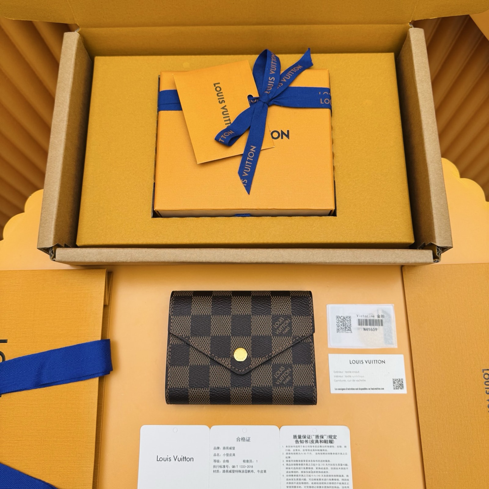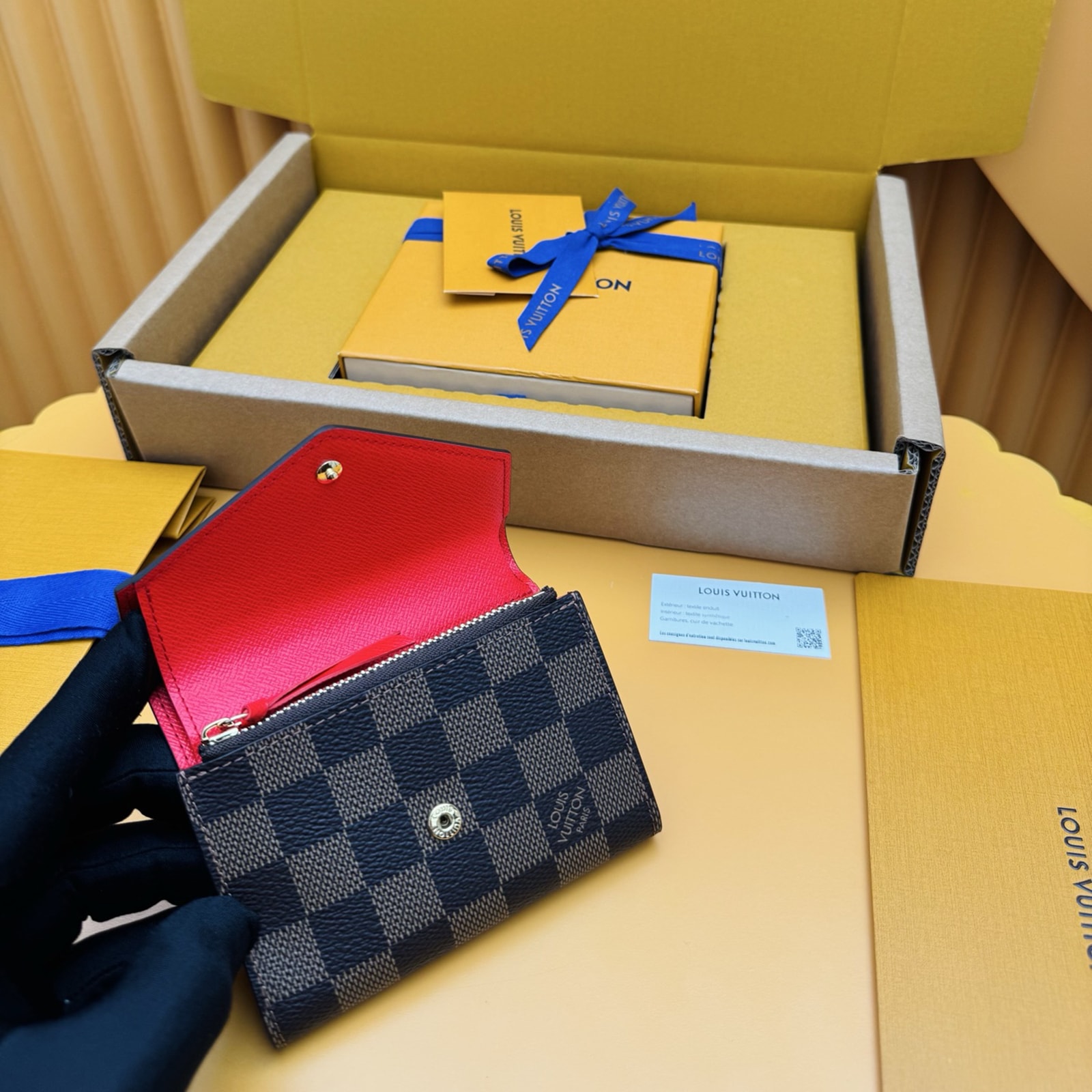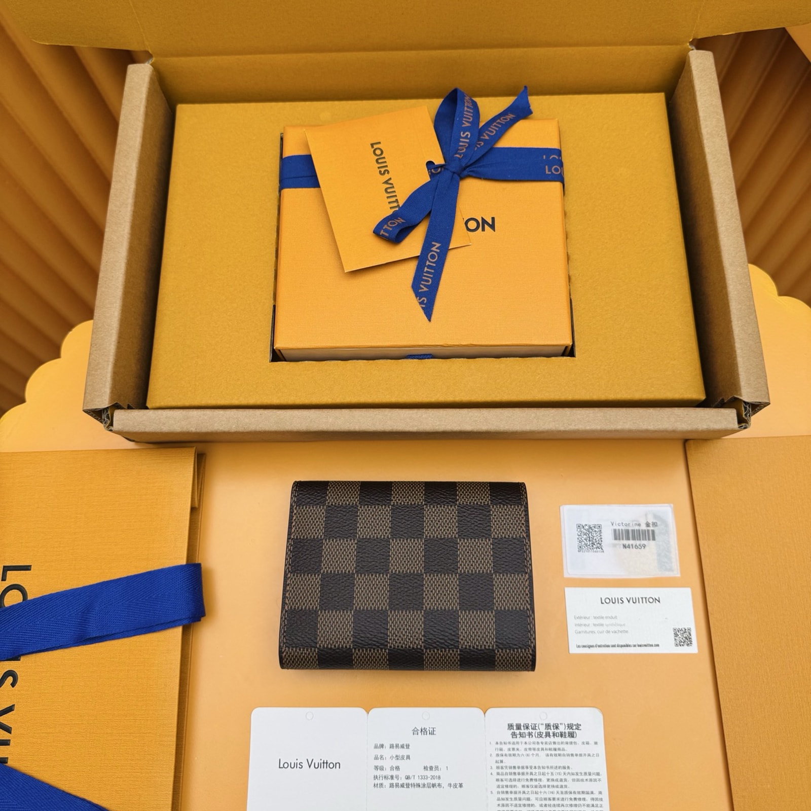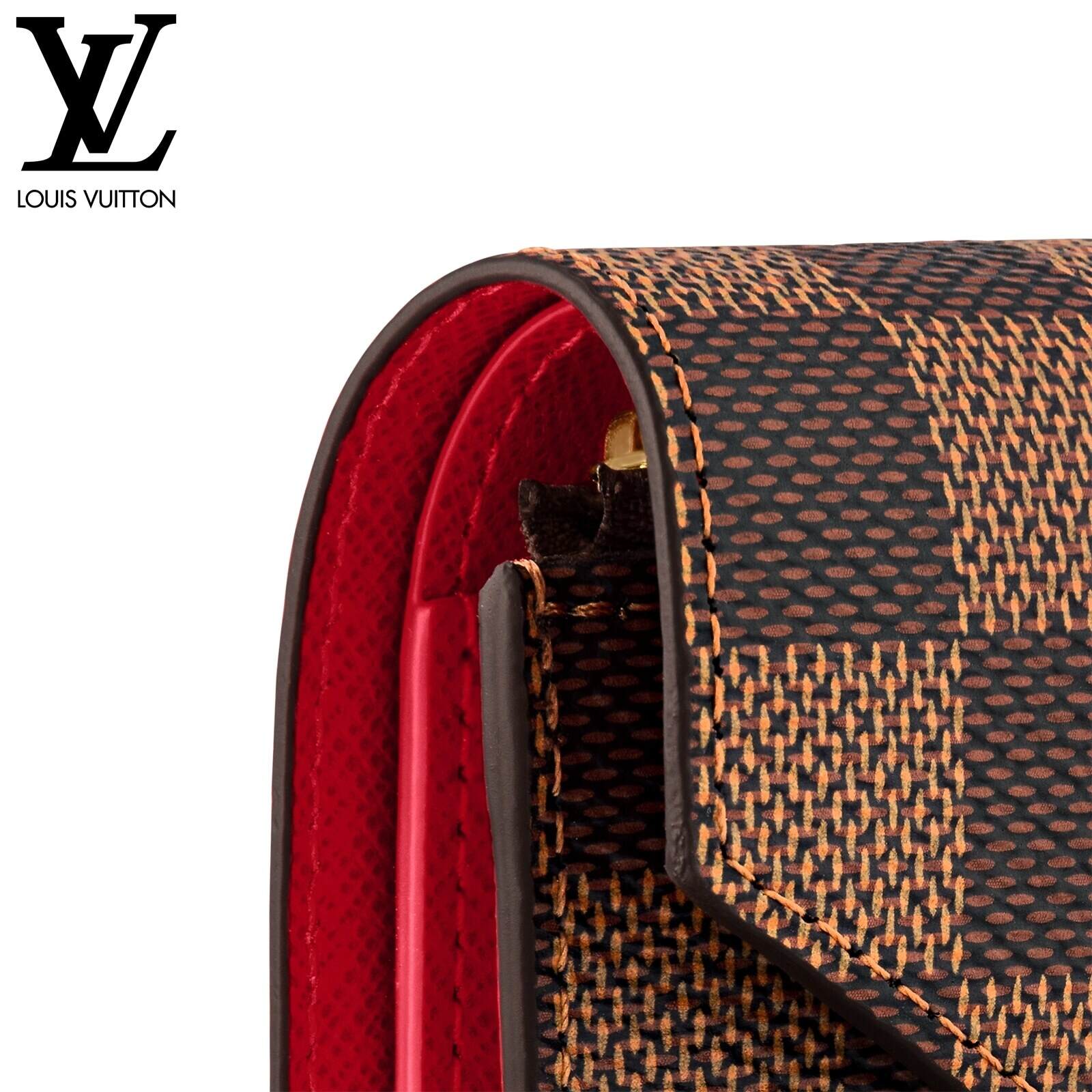 ダミエ・キャンバスで仕立てた「ポルトフォイユ・ヴィクトリーヌ」。エンヴェロップ型のコンパクトなデザインに、紙幣用ポケットとクレジットカードスロット、サイドのファスナー付きコインポケットなどの実用的な機能を散りばめました。グレインレザーのライニングがフェミニンな印象を添えます。